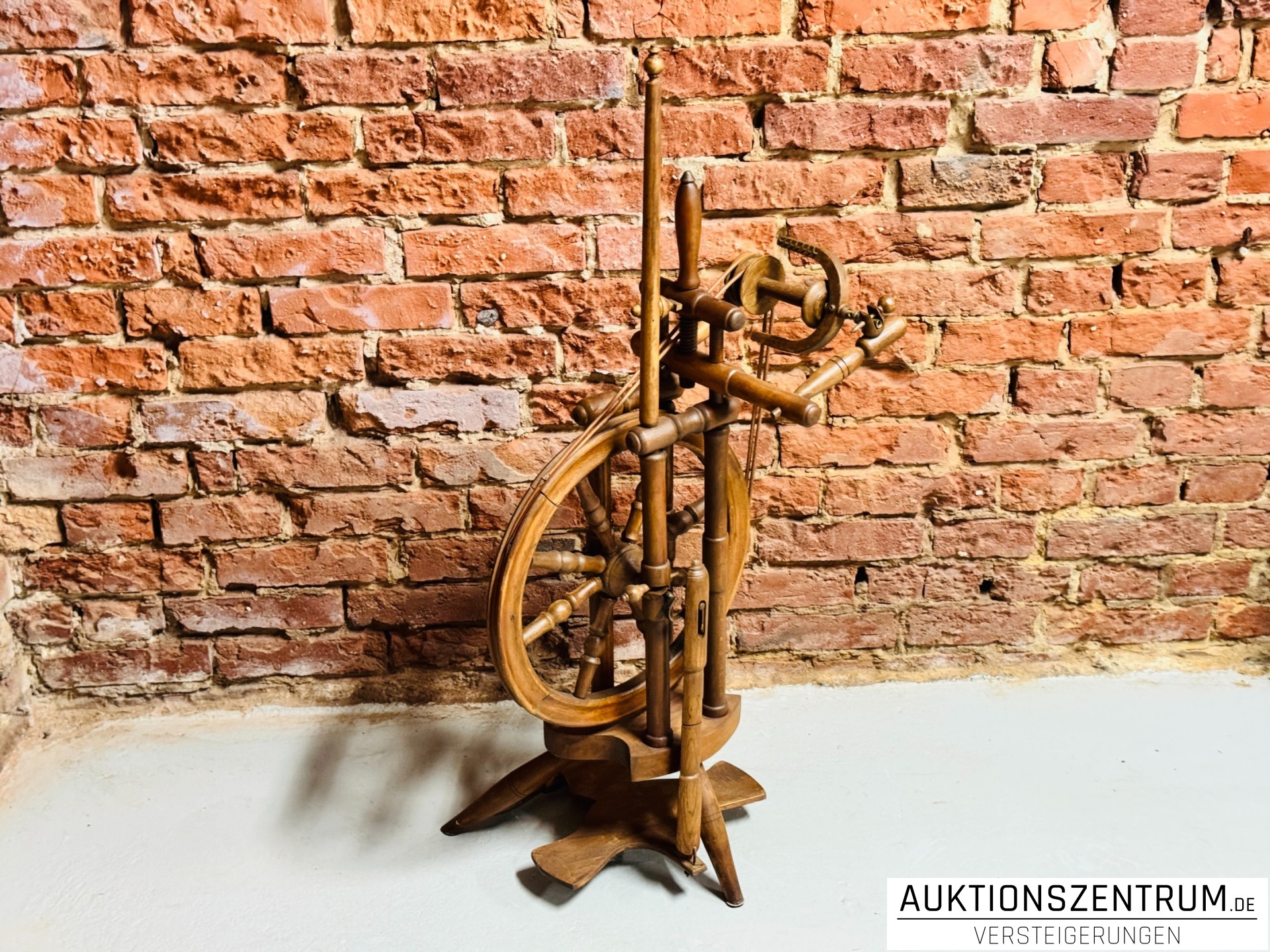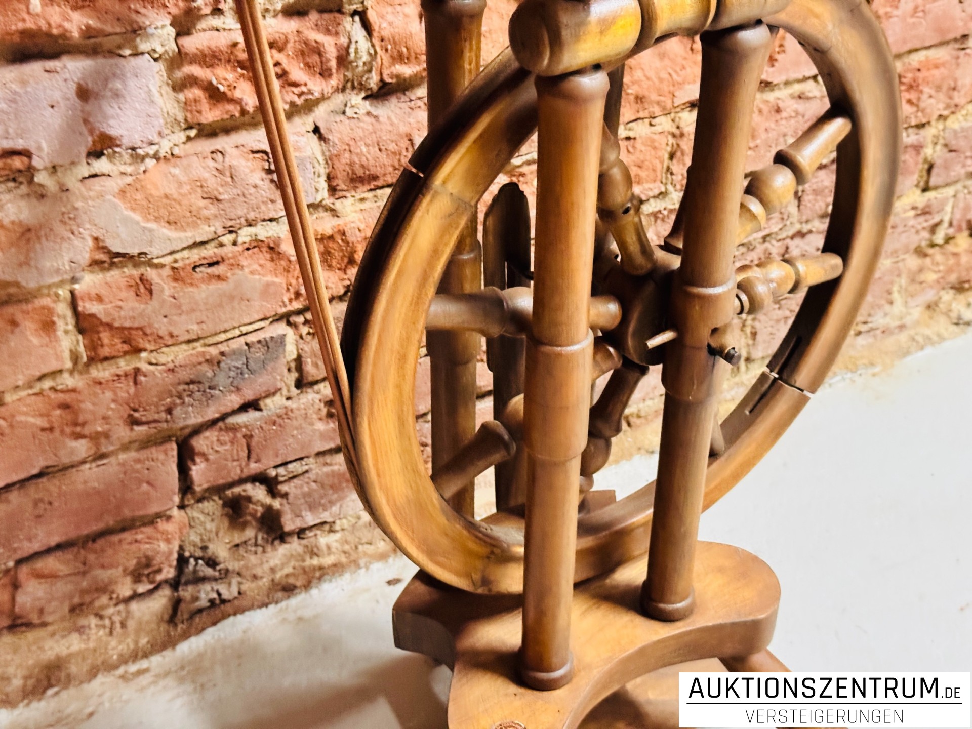 Standspinnrad aus Holz mit klassischer, gedrechselter Ausführung.