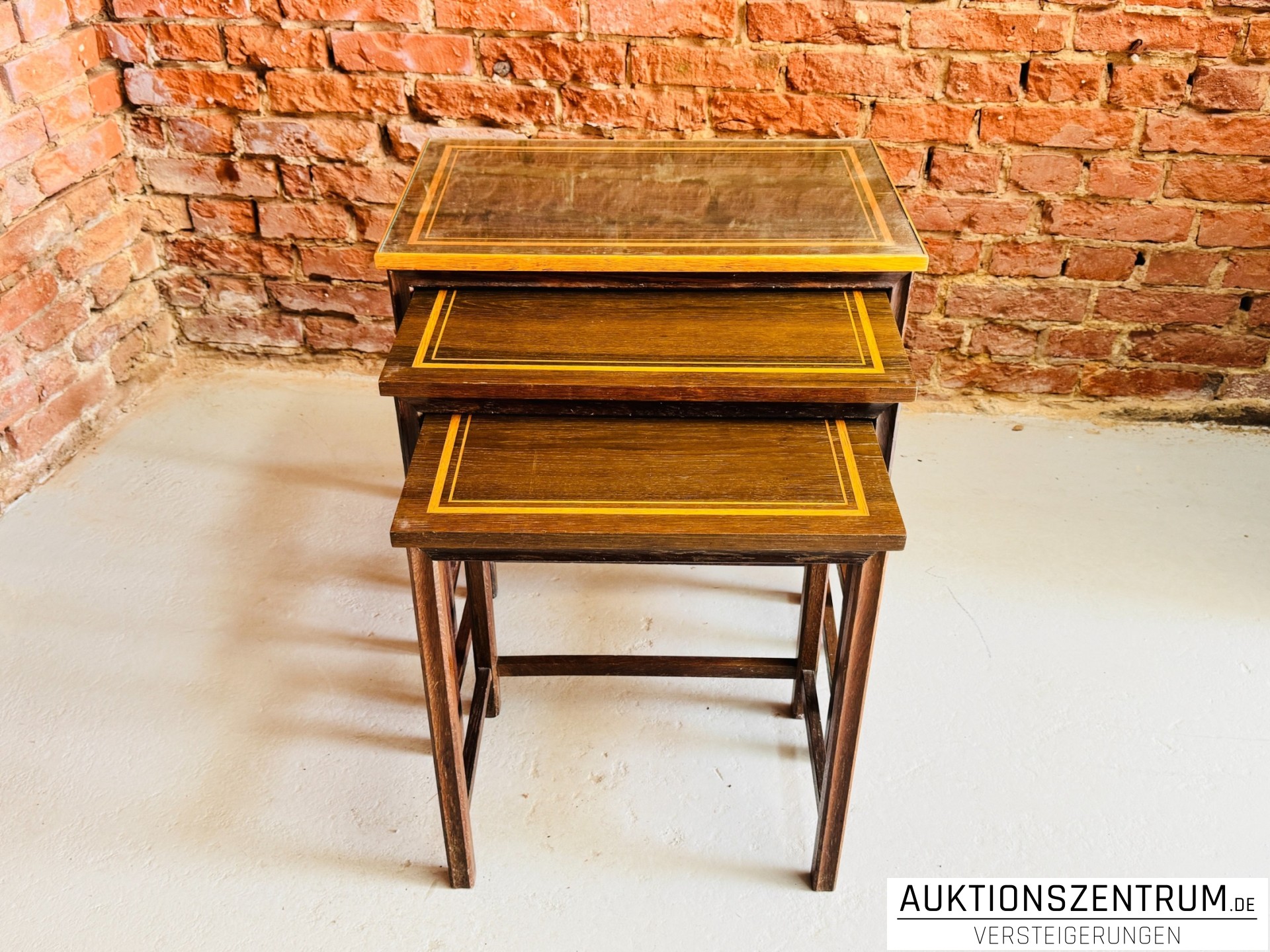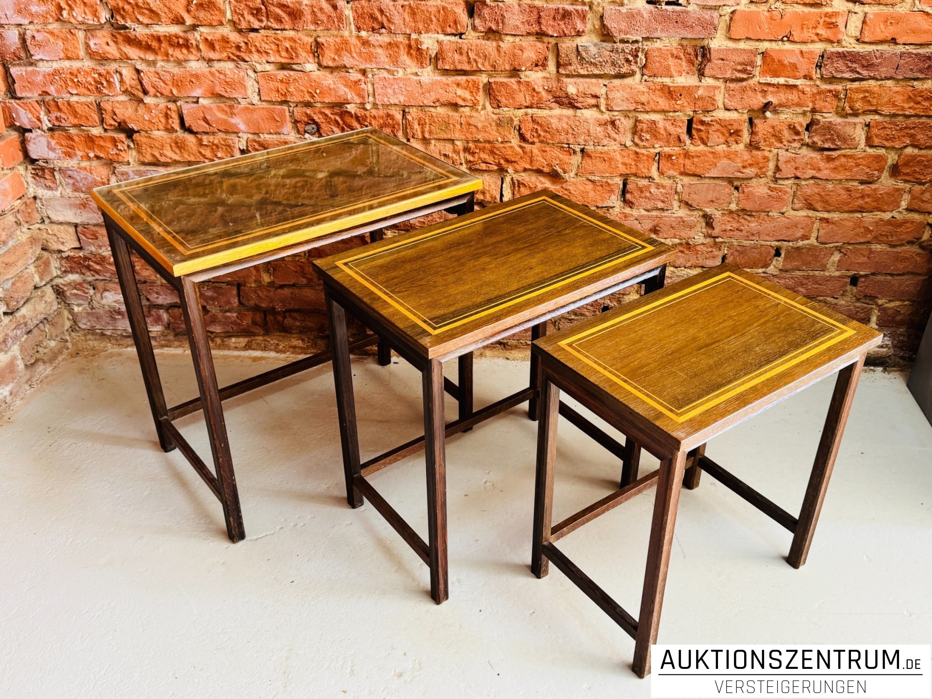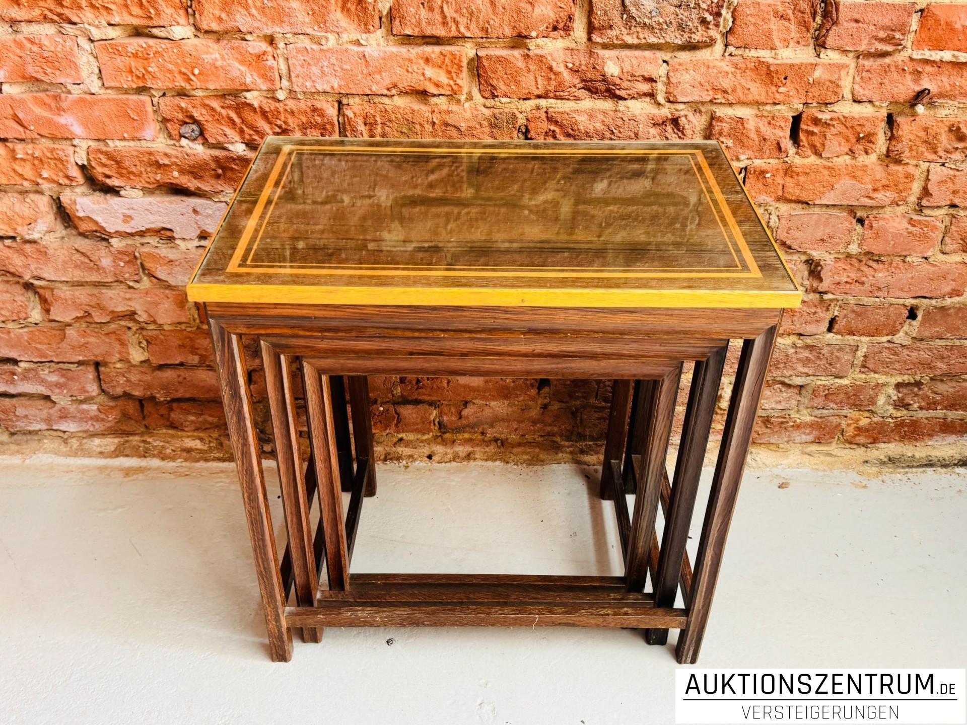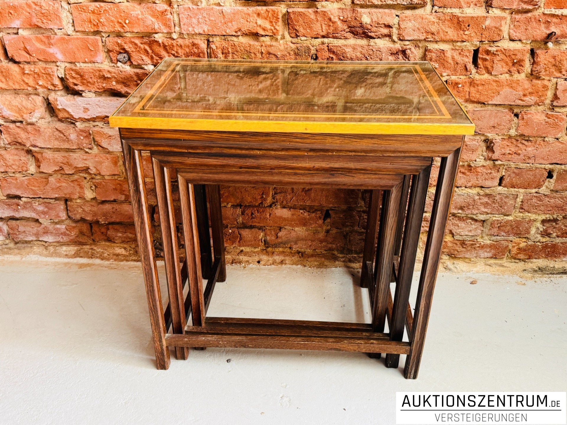 Dreiteiliges Set ineinander schiebbarer Beistelltische aus Eiche mit Eichel-Bandintarsien und aufgelegter Glasplatte als Oberflächenschutz.