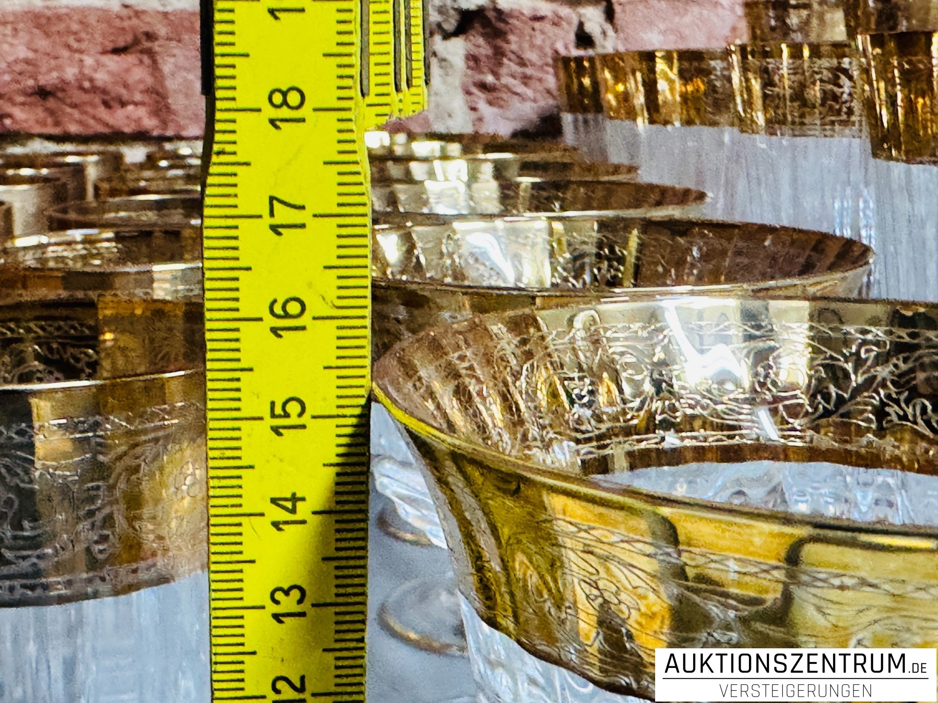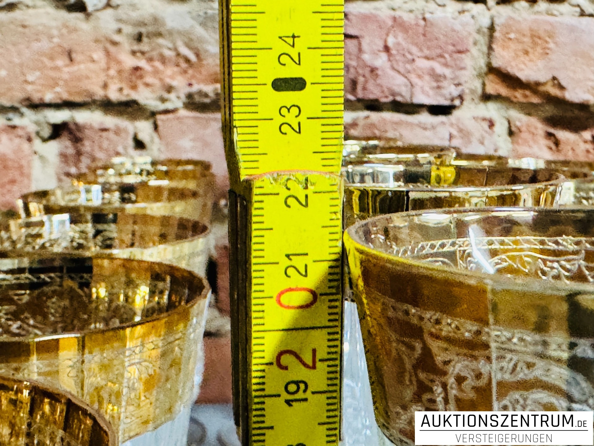 Alle Teile bestehen aus klarem Bleikristall 24% mit aufwendigem Schliffdekor und vergoldeten Rändern. Alle Stücke tragen noch die originalen Herstelleraufkleber „Kristall 24%“ sowie beigefügte Papieretiketten mit Typbezeichnungen.