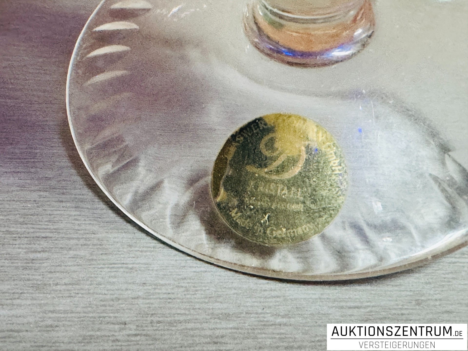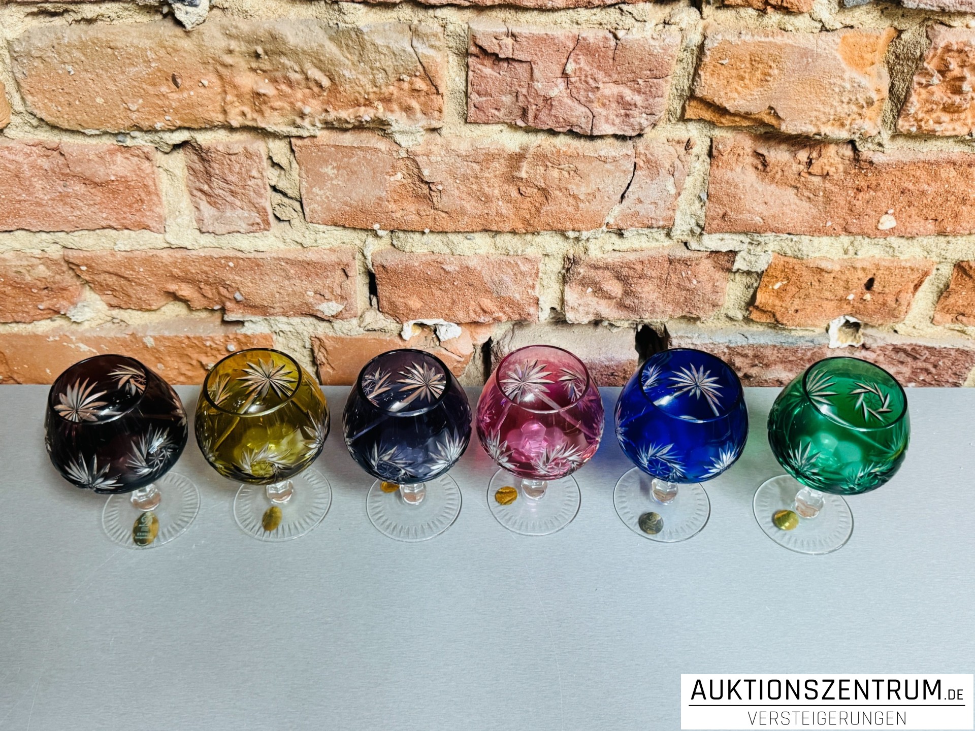 Jedes Glas mit klar geschliffenem Fuß, farbigem Korpus und umlaufendem, tief geschnittenem Stern- und Blattschliffdekor.