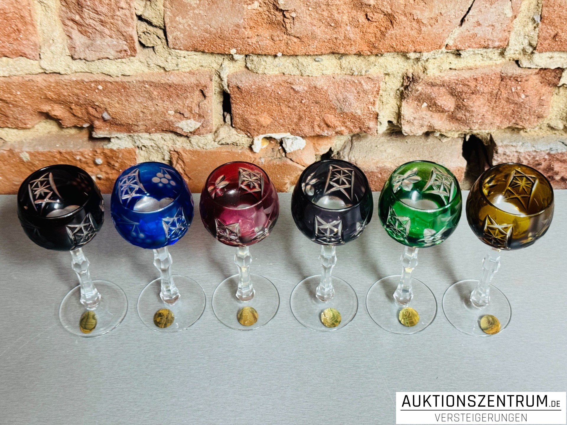 Jedes Glas mit farbig überfangenem Kelch in unterschiedlichen Tönen (u. a. blau, rot, grün, bernstein und dunkle Nuancen) und dekorativem Schliffdekor mit Stern- und Blattmotiven.