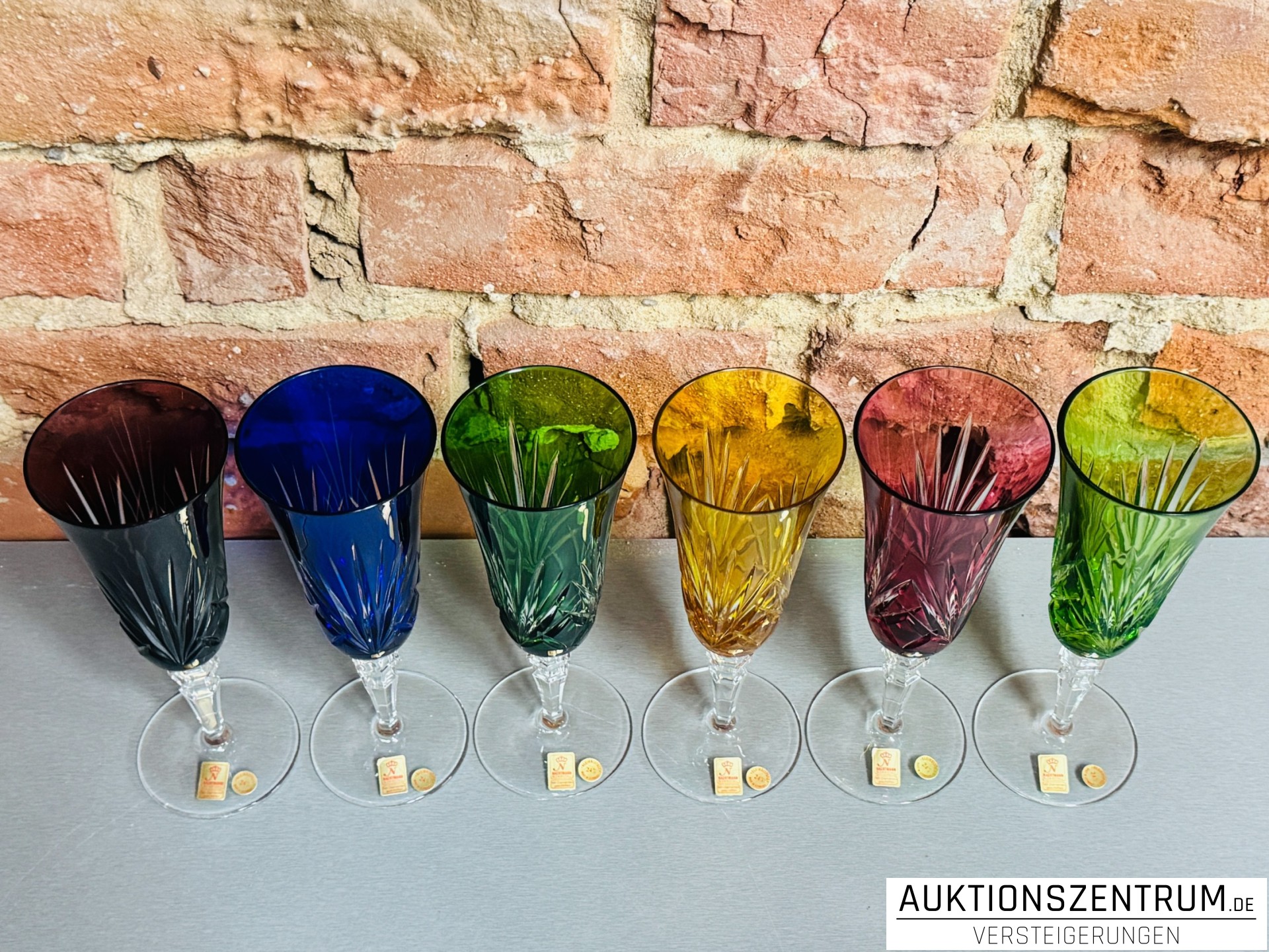Jedes Glas mit farbig überfangenem Kelch in unterschiedlichen Tönen (u. a. Violett, Blau, Grün, Gelb, Rot) und aufwendig diamantgeschliffenem Dekor.