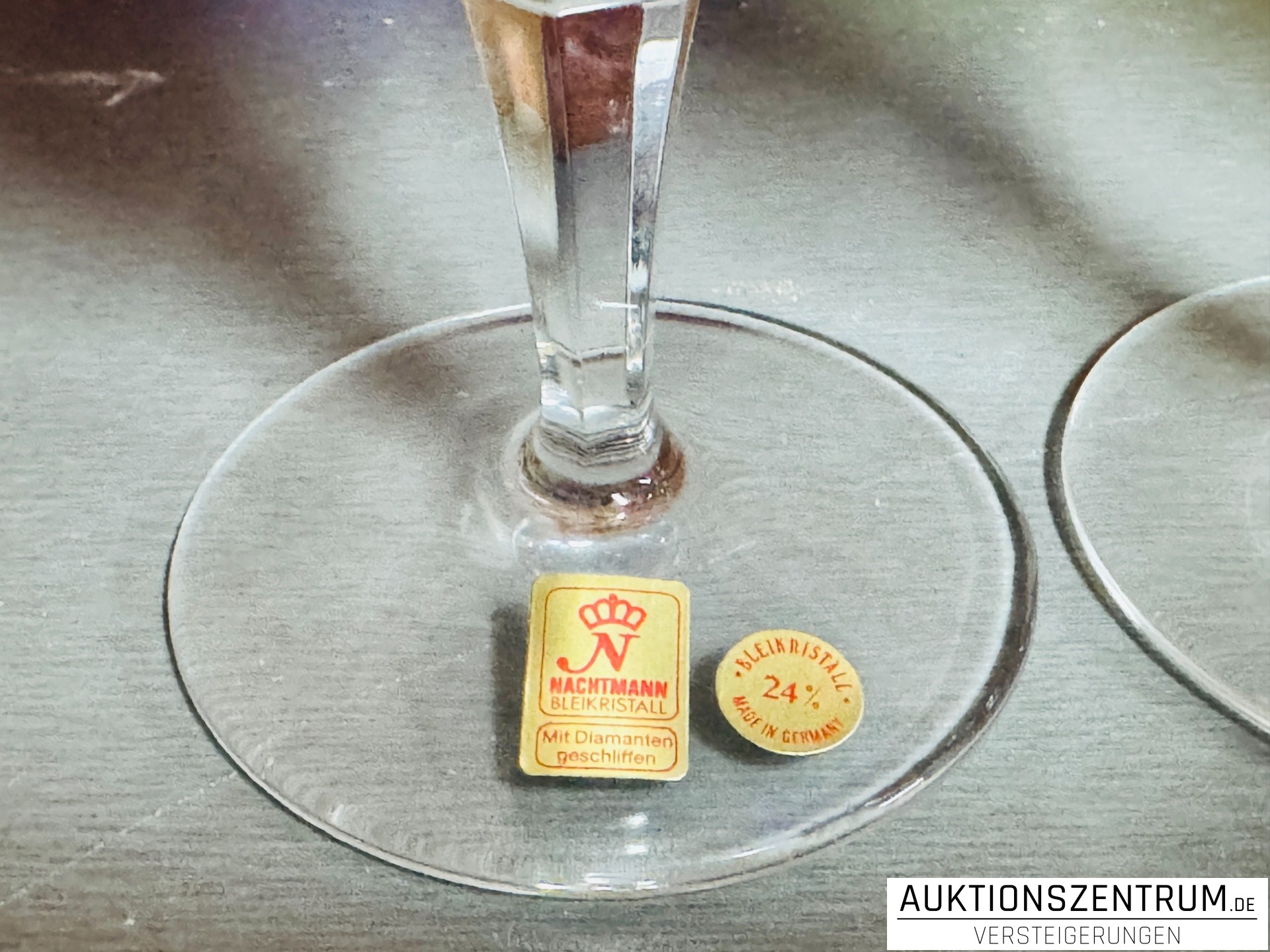 Alle Gläser mit originalen Herstelleraufklebern „Nachtmann Bleikristall - Mit Diamanten geschliffen“ sowie Rundetikett „Bleikristall 24 % - Made in Germany“.