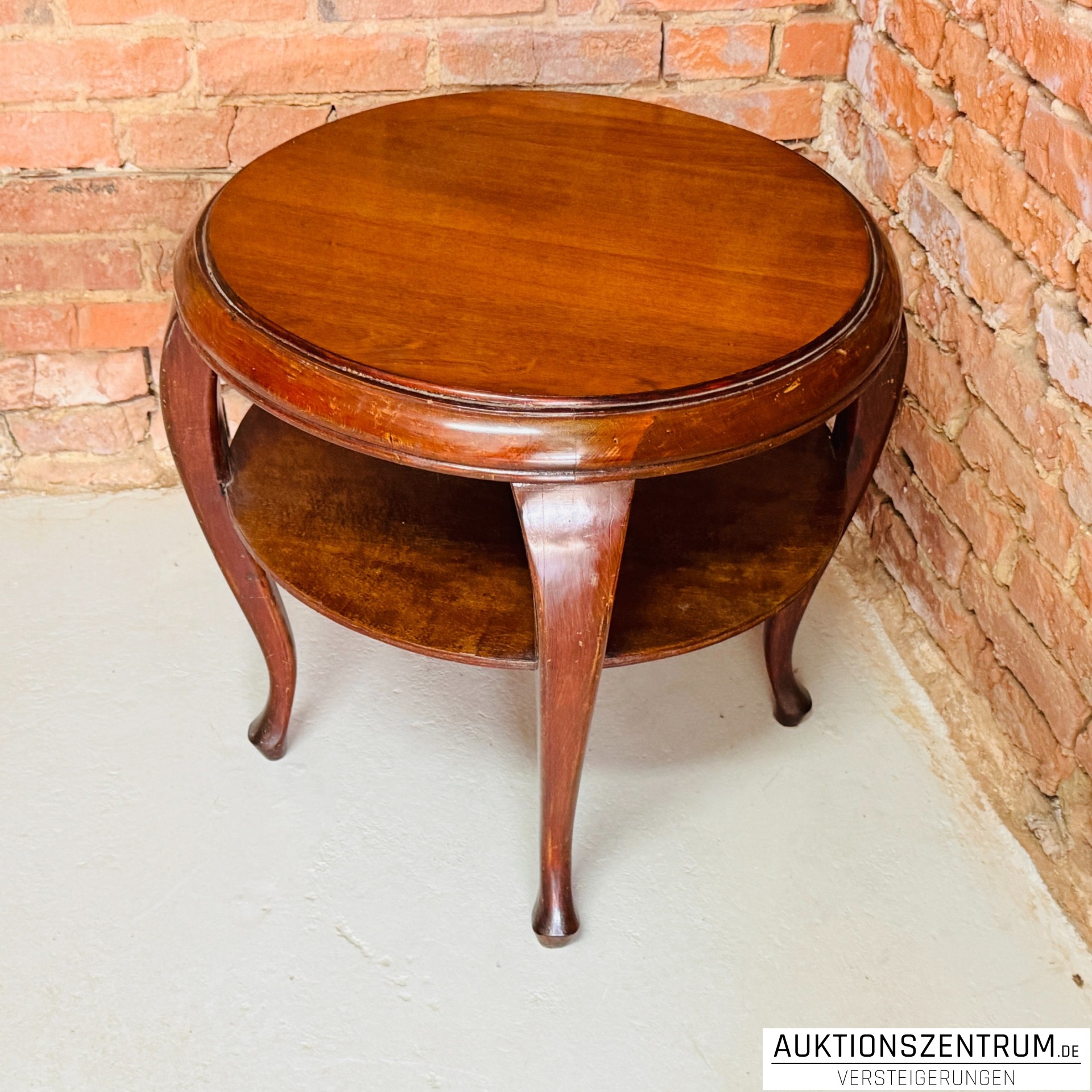Runder Beistelltisch aus Holz mit geschwungenen Beinen und umlaufender Zarge.