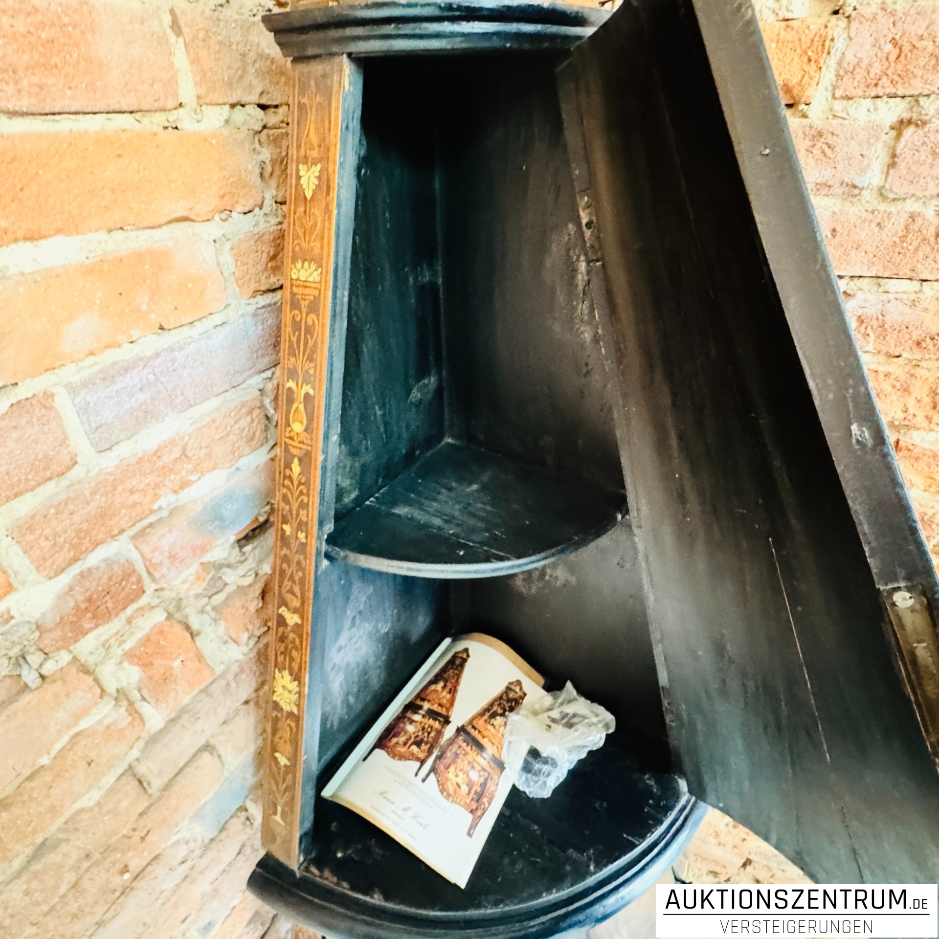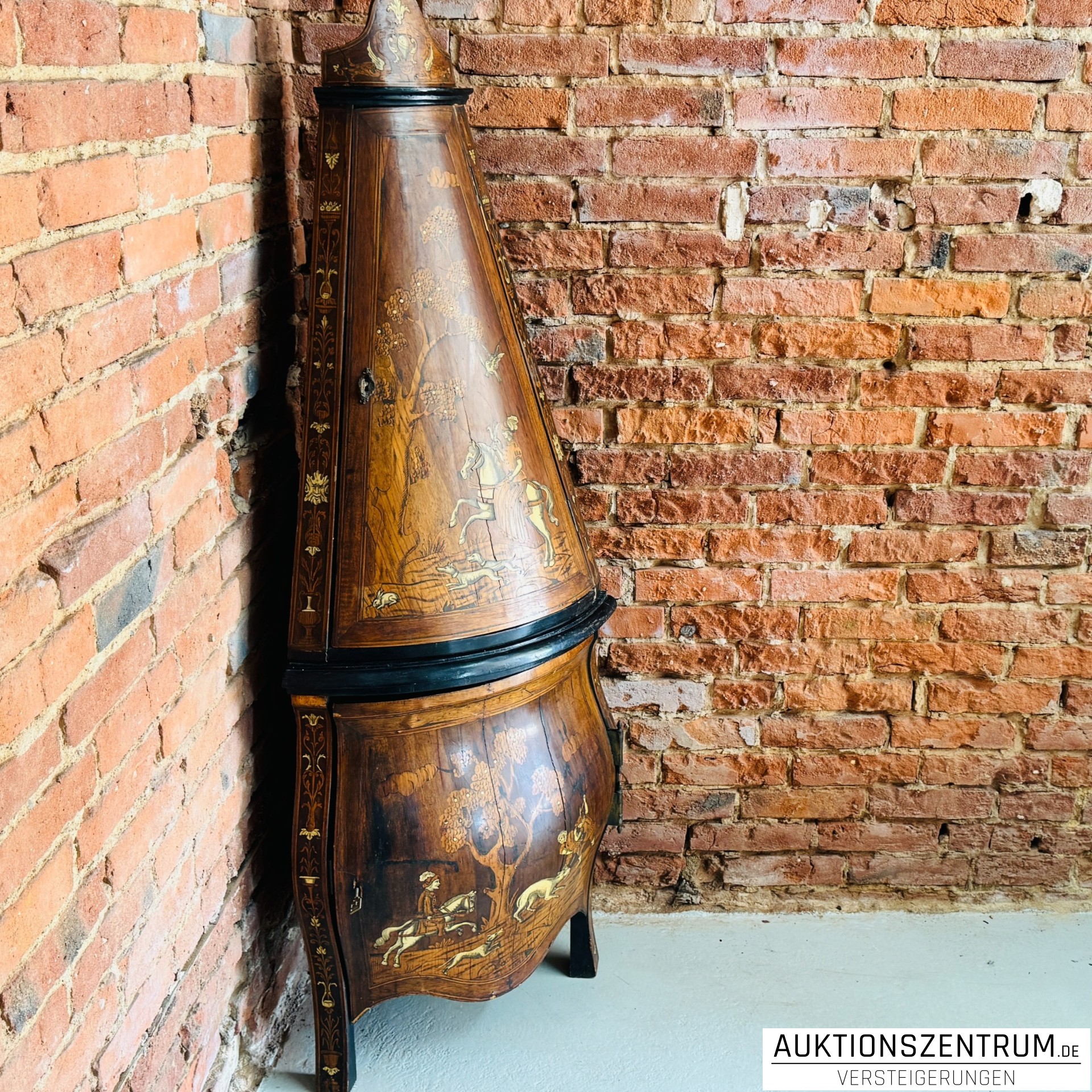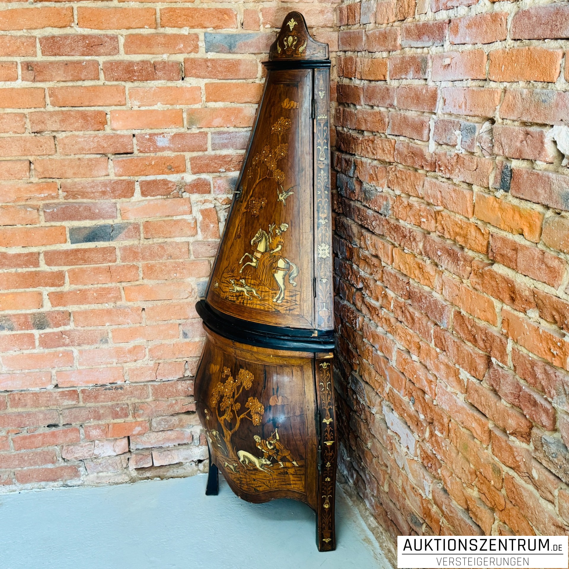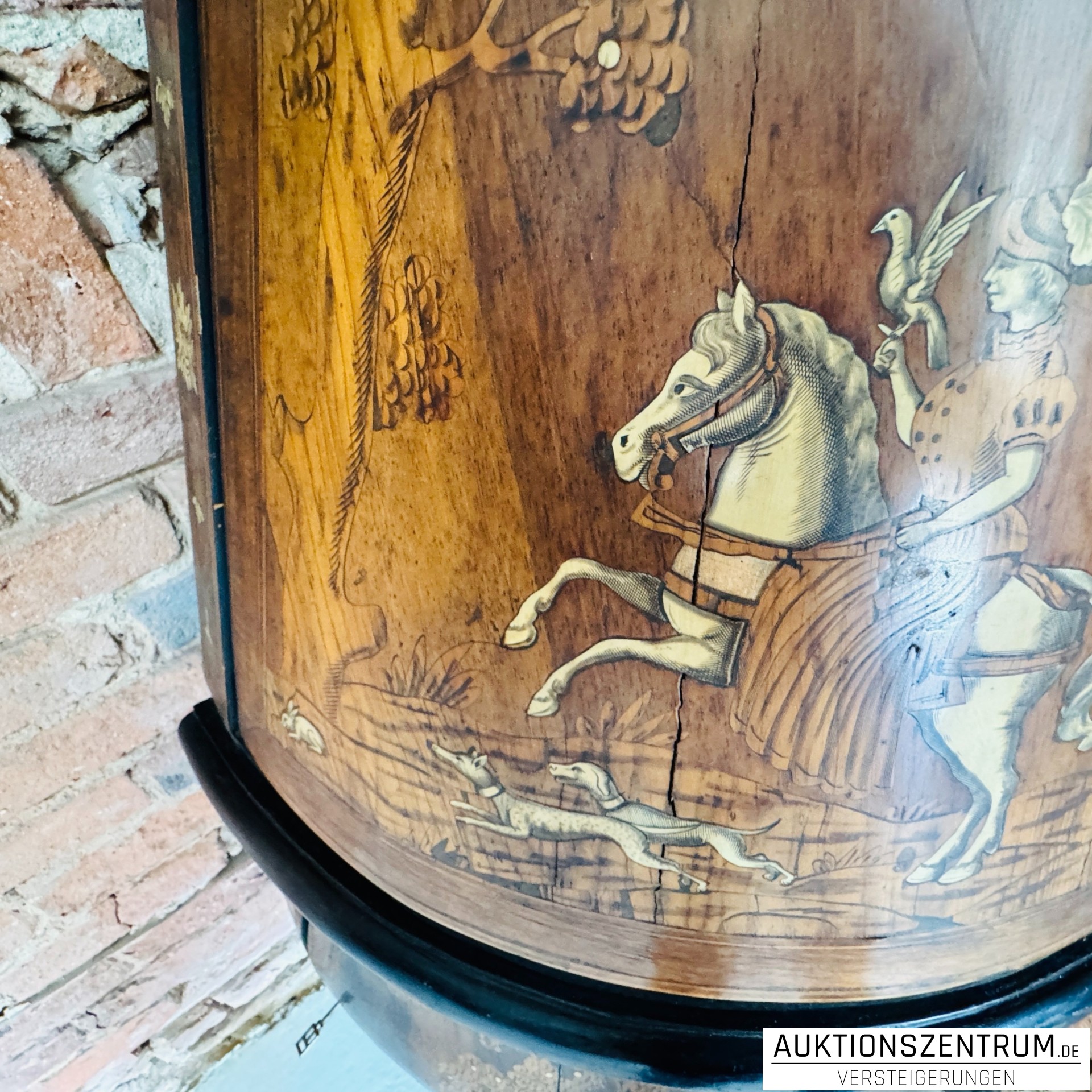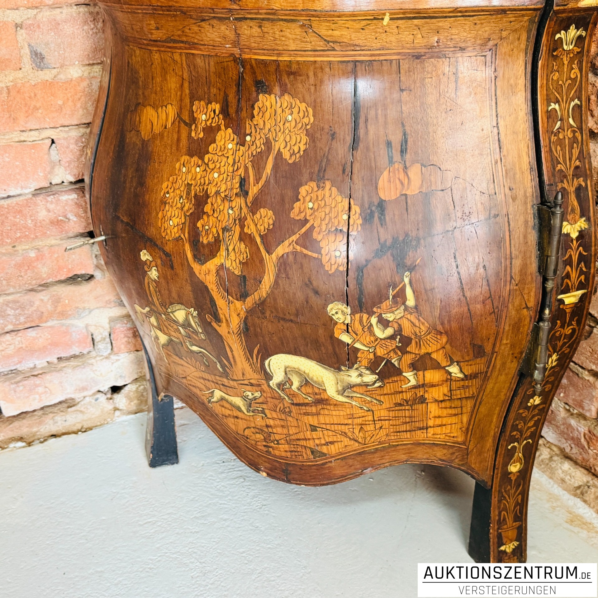 Die Front ist reich mit figürlichen Intarsien mit Jagdszenen und Landschaftsdarstellungen geschmückt, flankiert von floralen Einlagen an den Seiten.