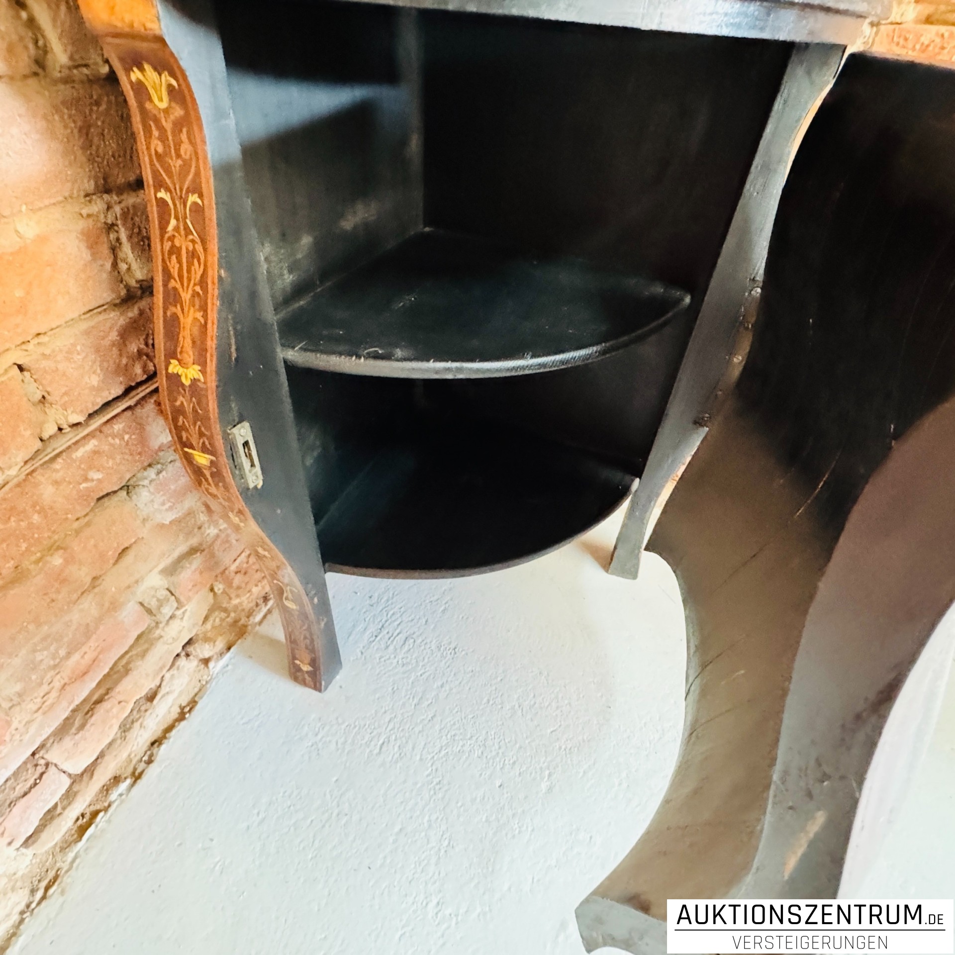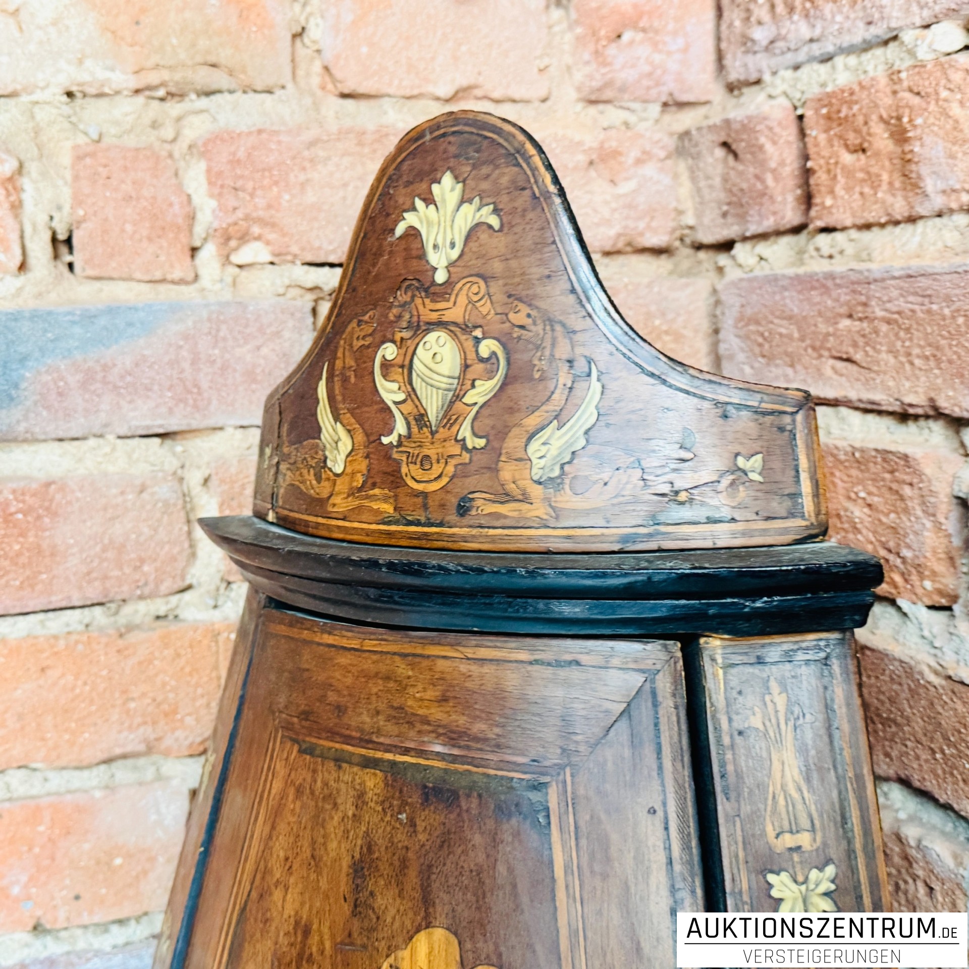 Der obere Abschluss ist geschweift und mit Wappen- und Rocaillenintarsien dekoriert, die Profilierungen und Kanten sind dunkel abgesetzt.