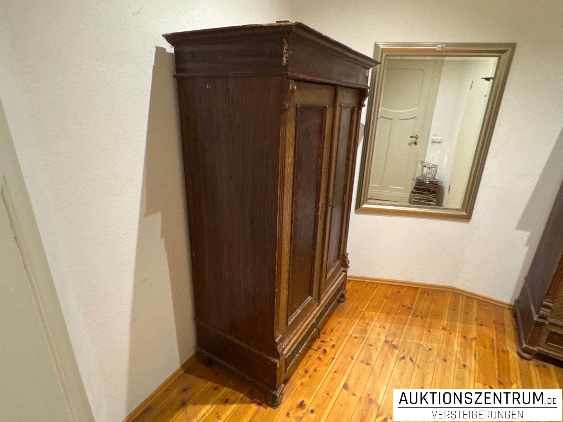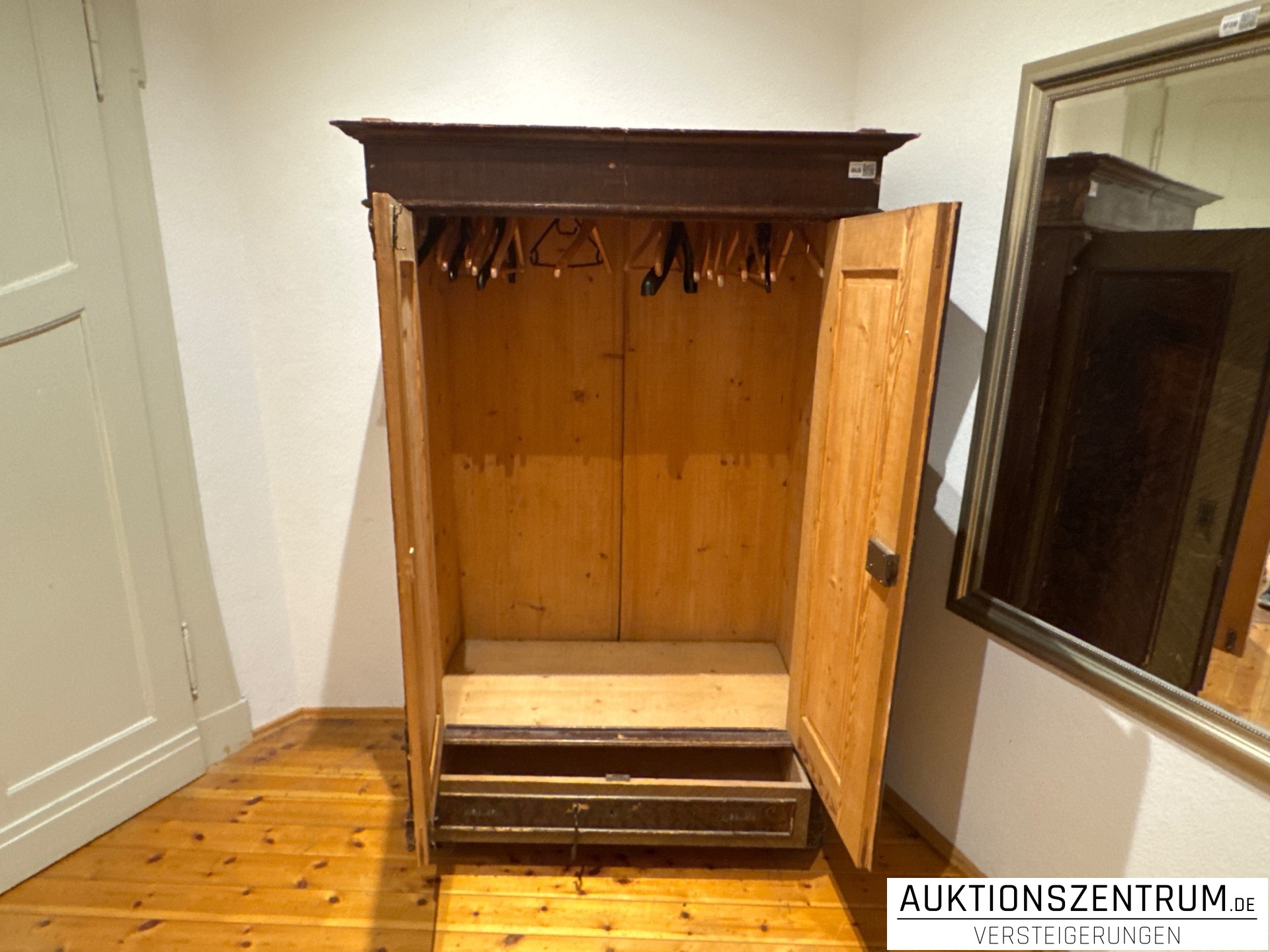 Er bietet im Inneren eine Kleiderstange für Hängendes und verfügt über eine zusätzliche, geräumige Schublade im unteren Bereich. Trotz seines Alters und deutlicher Gebrauchsspuren wie Furnierabplatzungen und Kratzern, bewahrt der Schrank seinen historischen Charme und ist ein beeindruckendes Zeugnis der Handwerkskunst seiner Epoche. Er eignet sich hervorragend als individuelles Möbelstück für Liebhaber antiker Möbel oder zur Restaurierung.