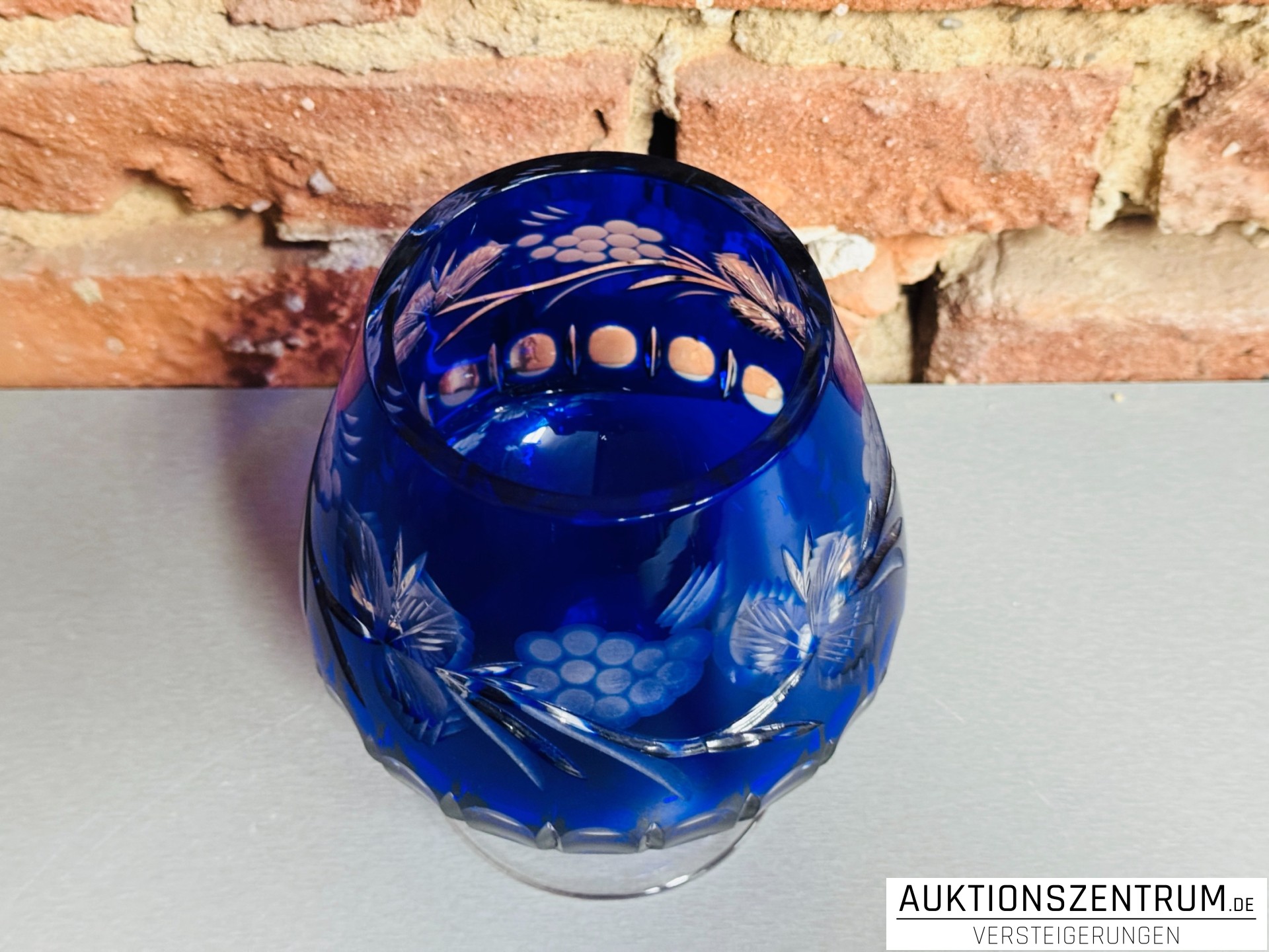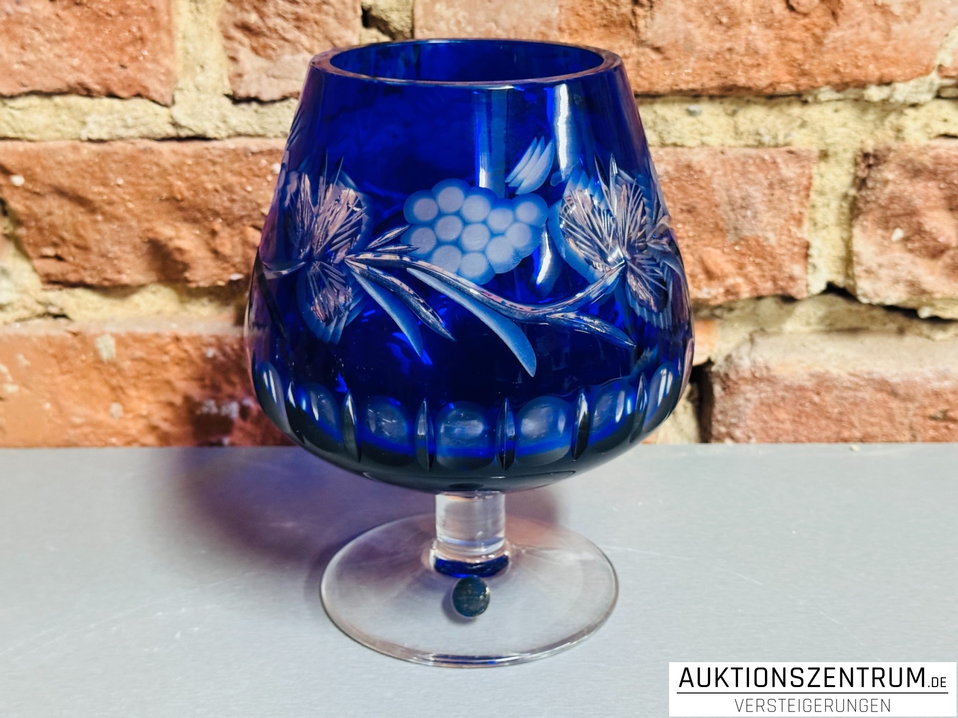 Der bauchige Korpus in intensivem Kobaltblau ist umlaufend mit geschliffenem Trauben- und Blattmotiv sowie facettierten Ovalschliffen verziert.
