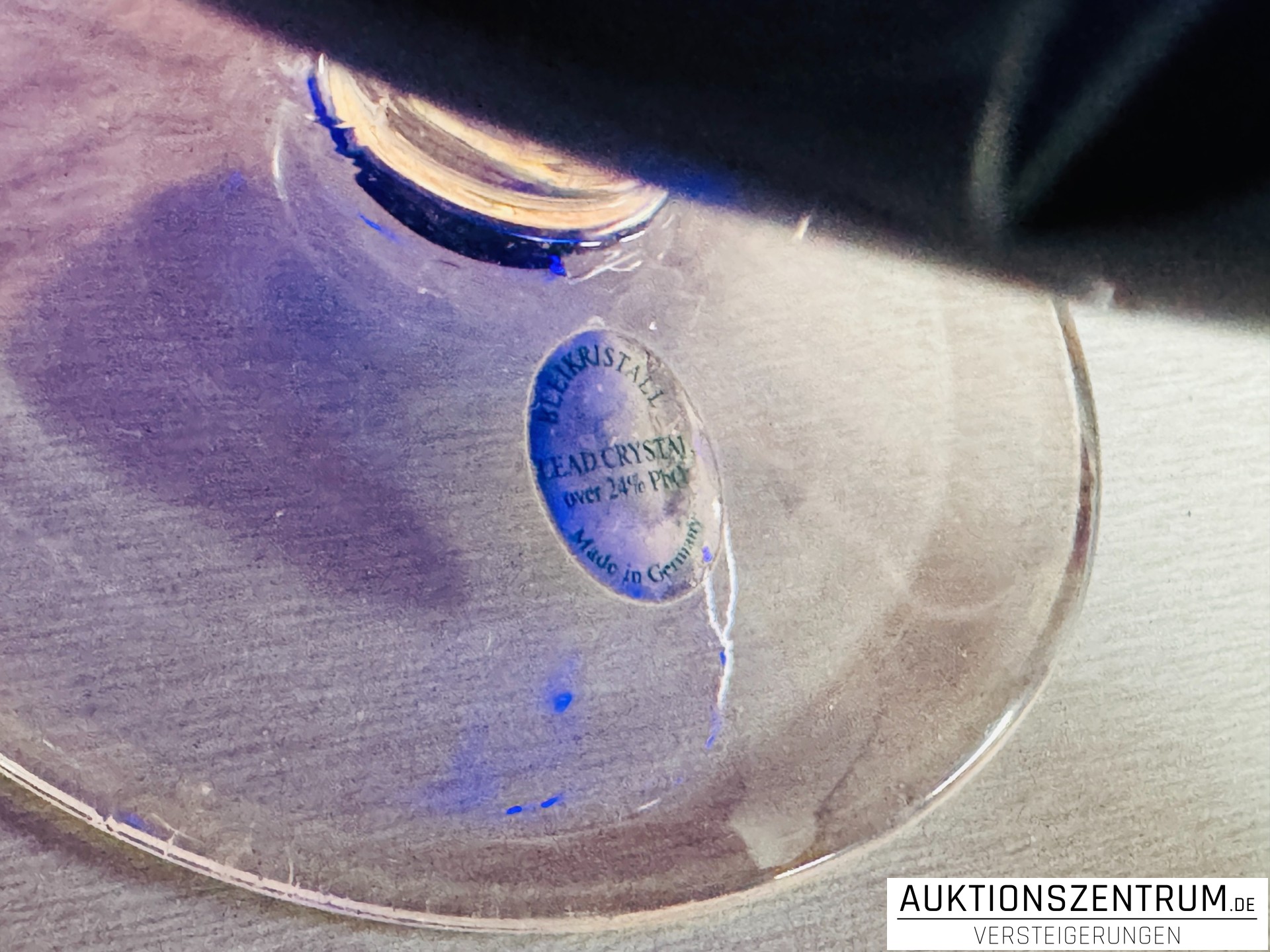 Am Fuß befindet sich ein Herstelleraufkleber mit der Angabe „Bleikristall“ und „Lead Crystal over 24% PbO – Made in Germany“.