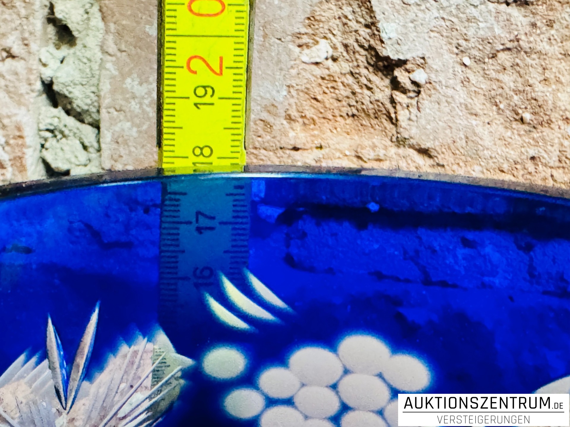 Material: Bleikristallglas, blau überfangen, farbloser Fuß.