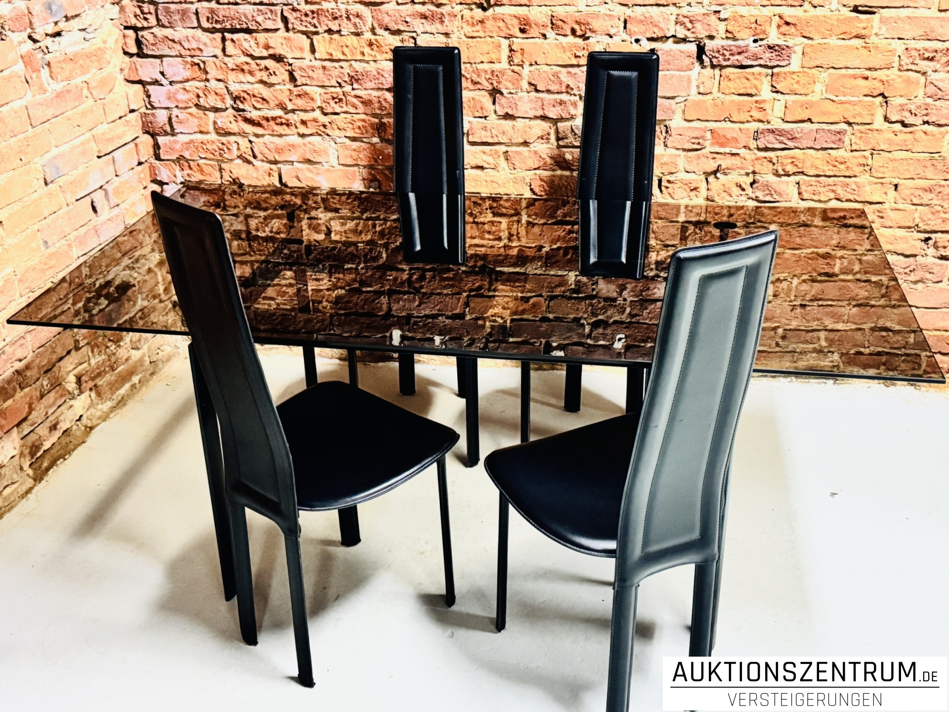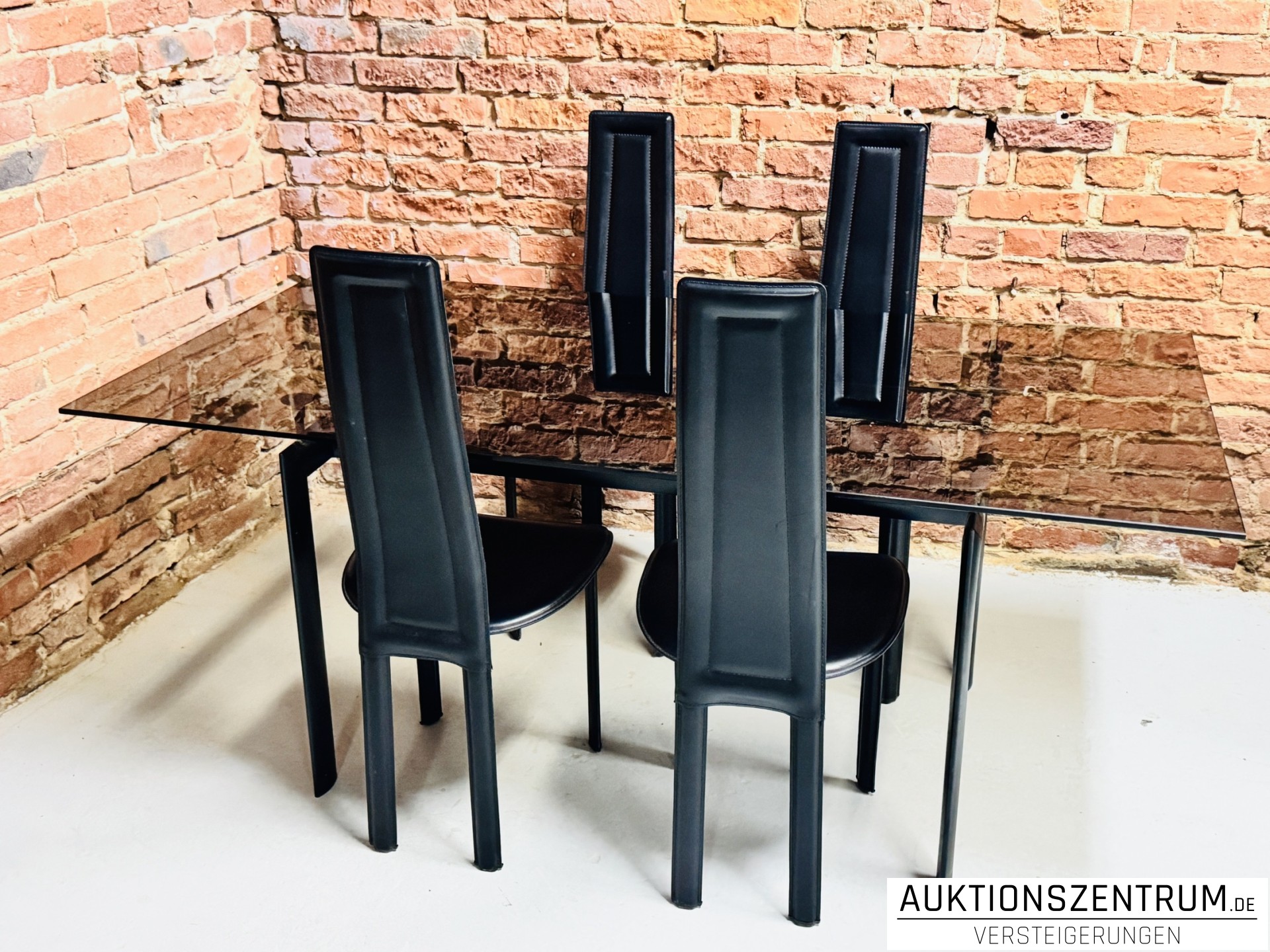 Modernes Essplatz-Ensemble bestehend aus einem rechteckigen Design-Esstisch mit Glasplatte und vier passenden Hochlehner-Stühlen.