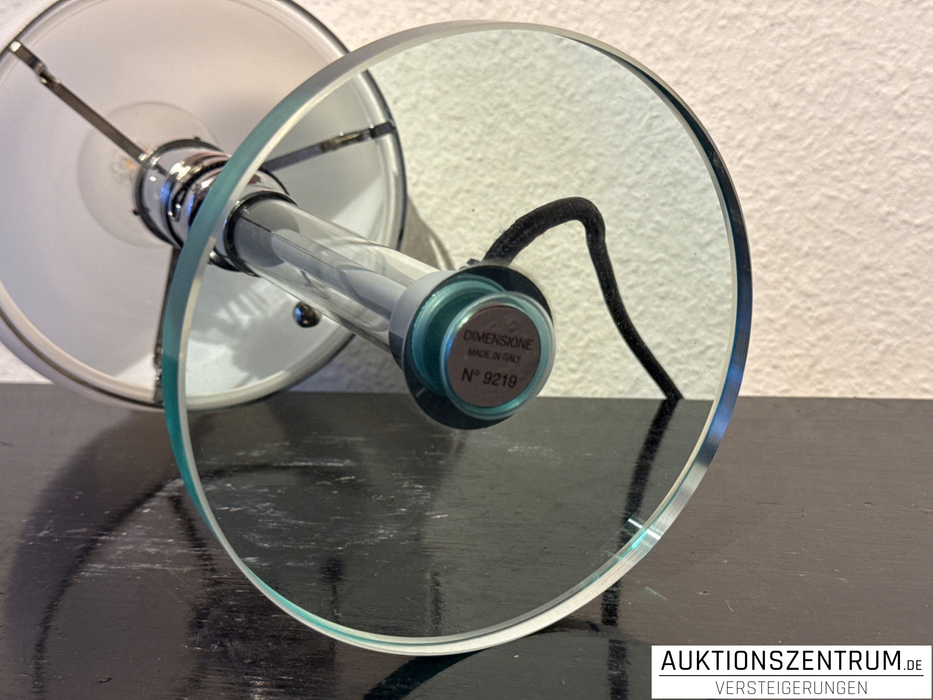 Die Leuchte verfügt über einen runden, massiven Glasfuß, einen zylindrischen Metallstand (verchromt) sowie einen halbkugelförmigen, satinierten Glas- bzw. Kunststoffschirm in Weiß. Am Fuß ist die Leuchte mit einem Metalleinsatz mit der Prägung „DIMENSIONE – MADE IN ITALY – N° 9219“ gekennzeichnet.