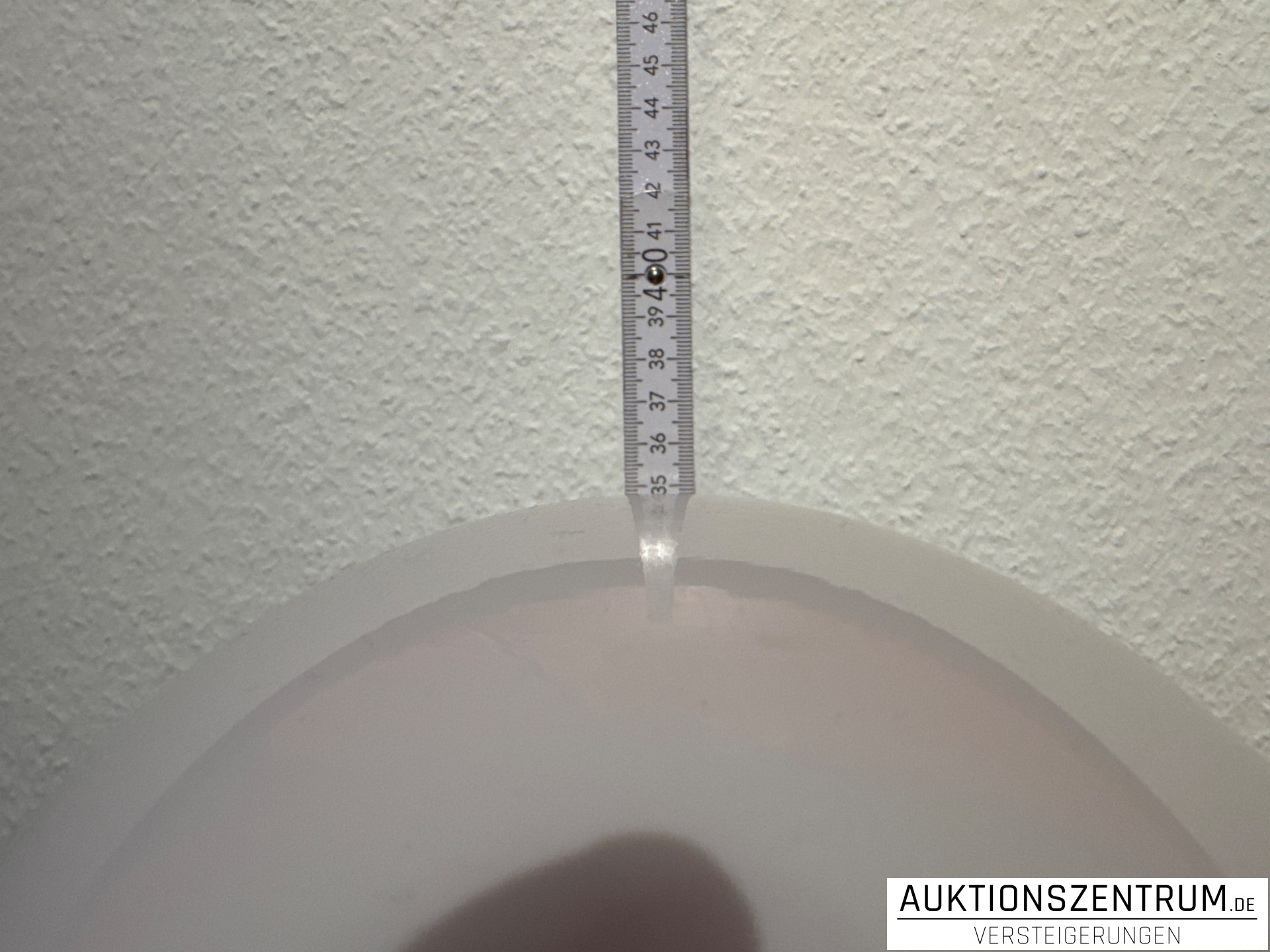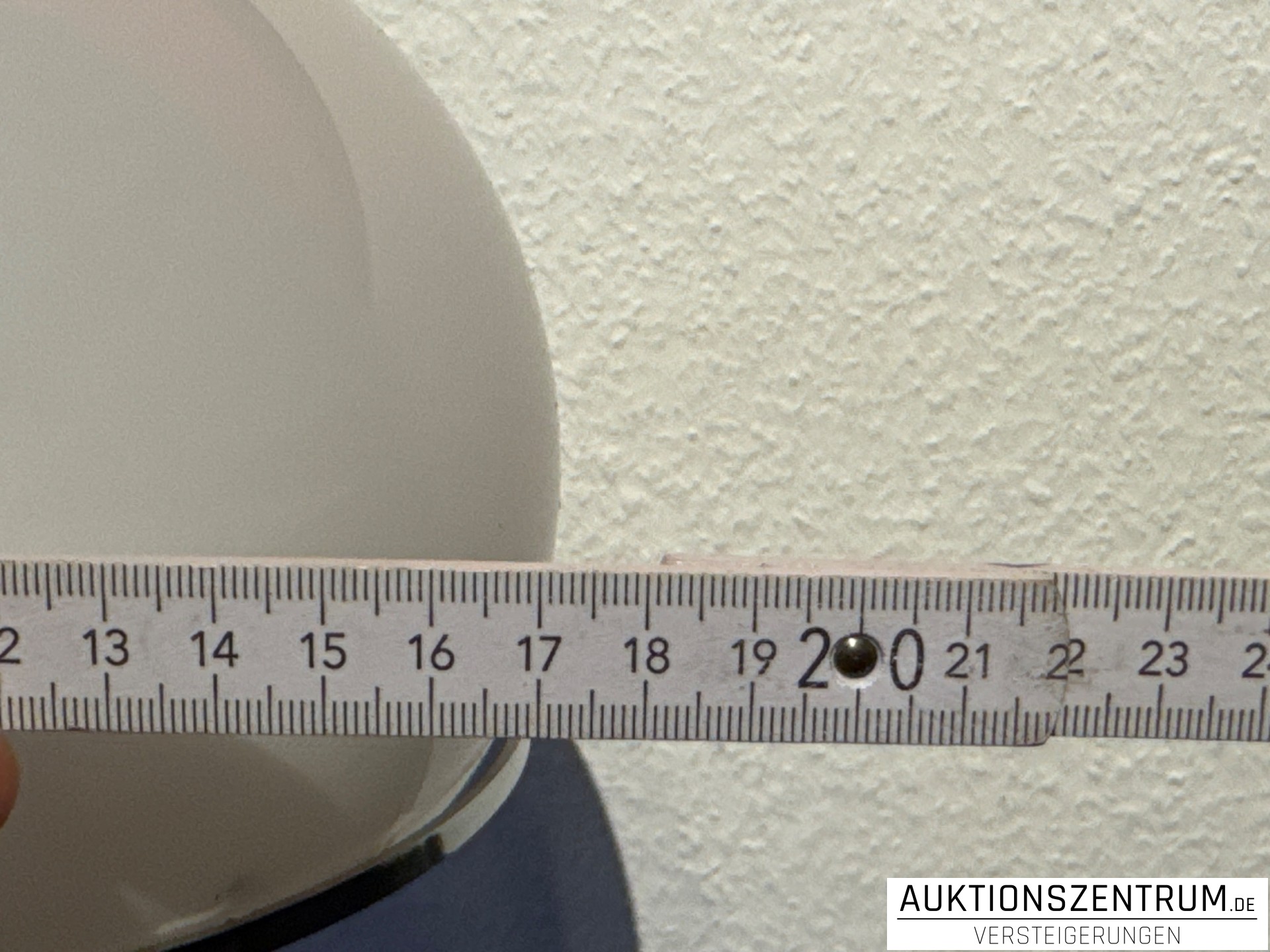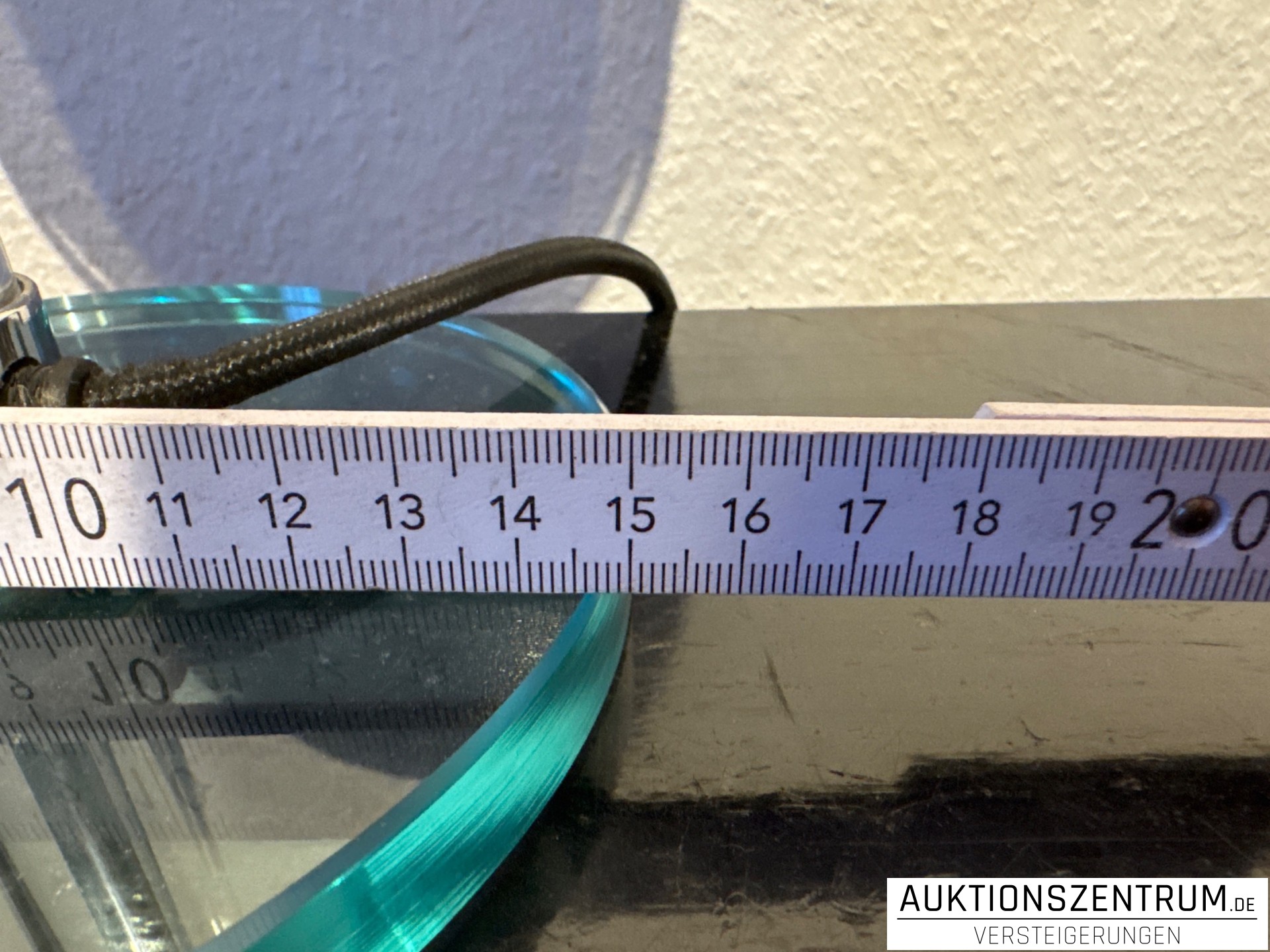 - Material: Glasfuß, Metallstand verchromt, weißer Halbkugel-Schirm (Glas/Kunststoff)