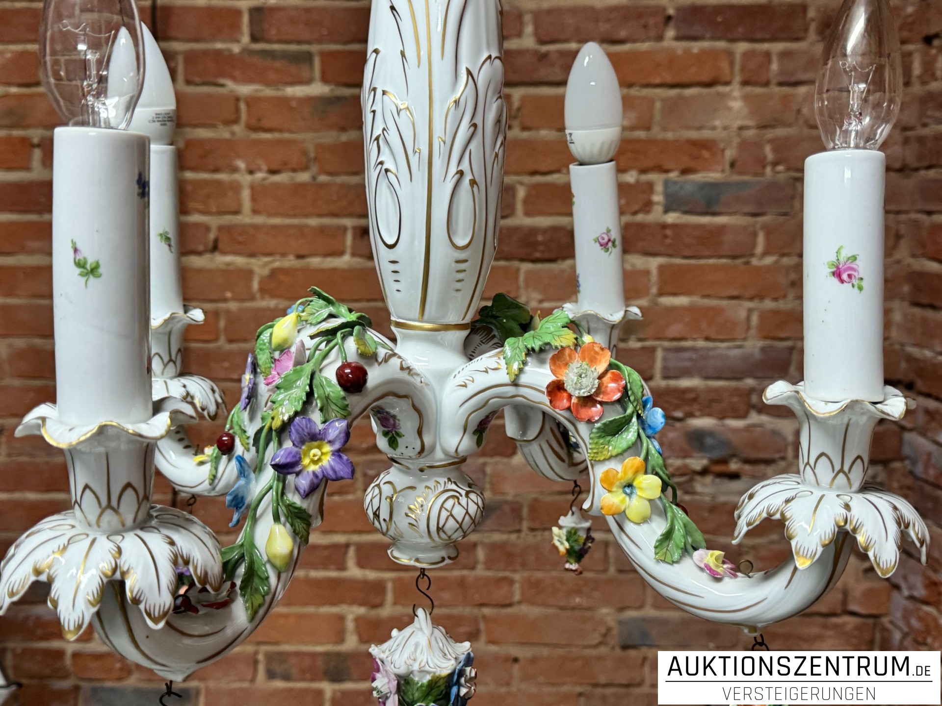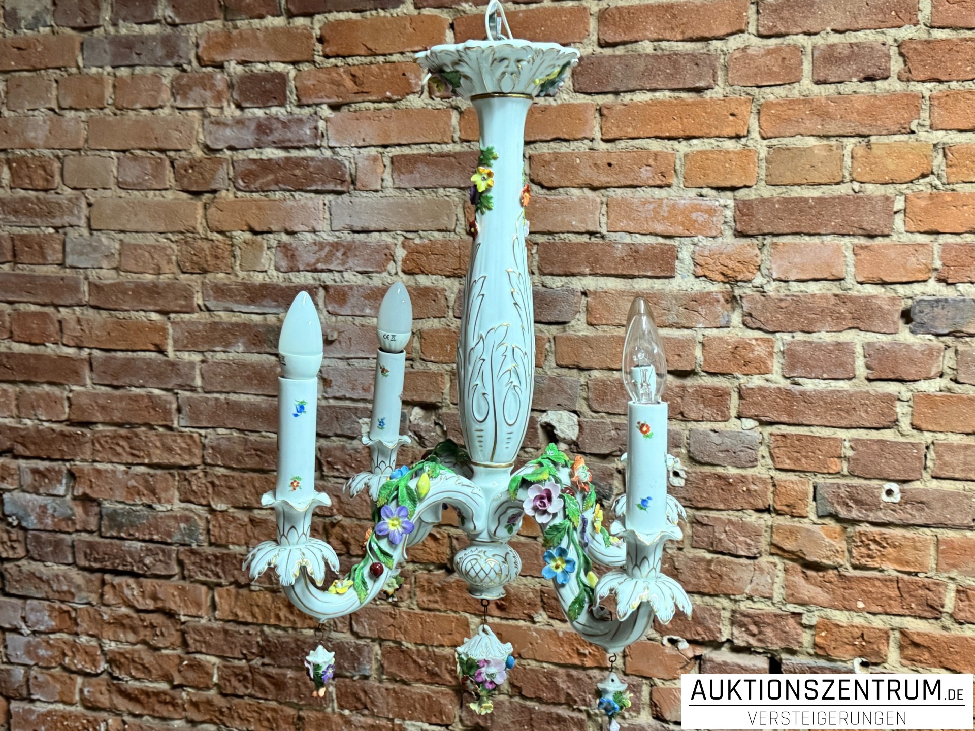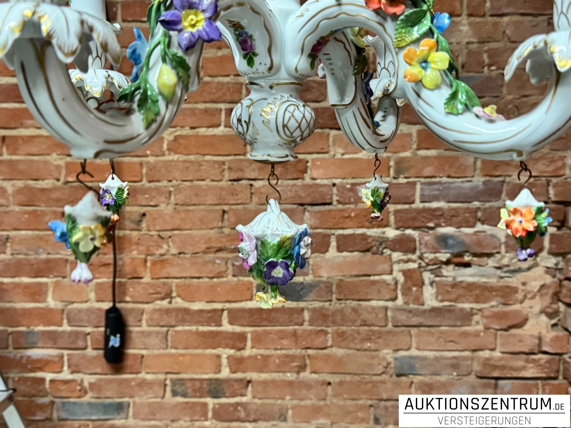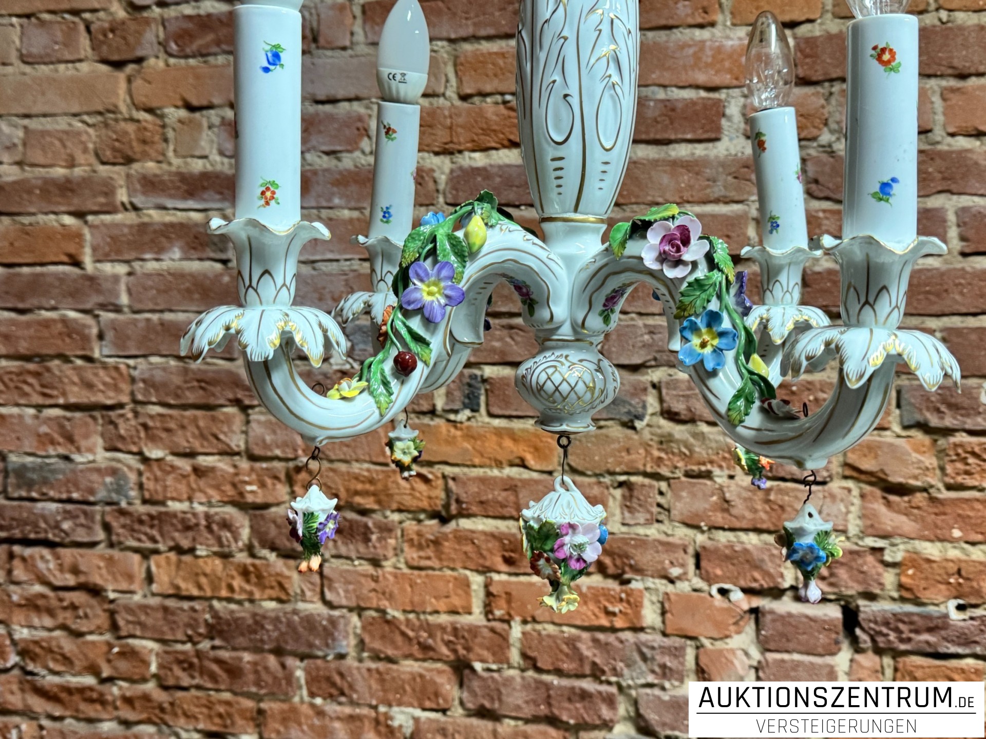 Die geschwungenen Arme enden in tropfenförmigen Porzellananhängern, ebenfalls mit plastischen Blüten besetzt.