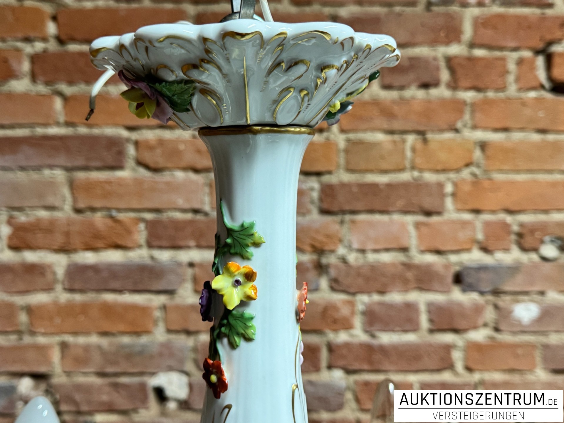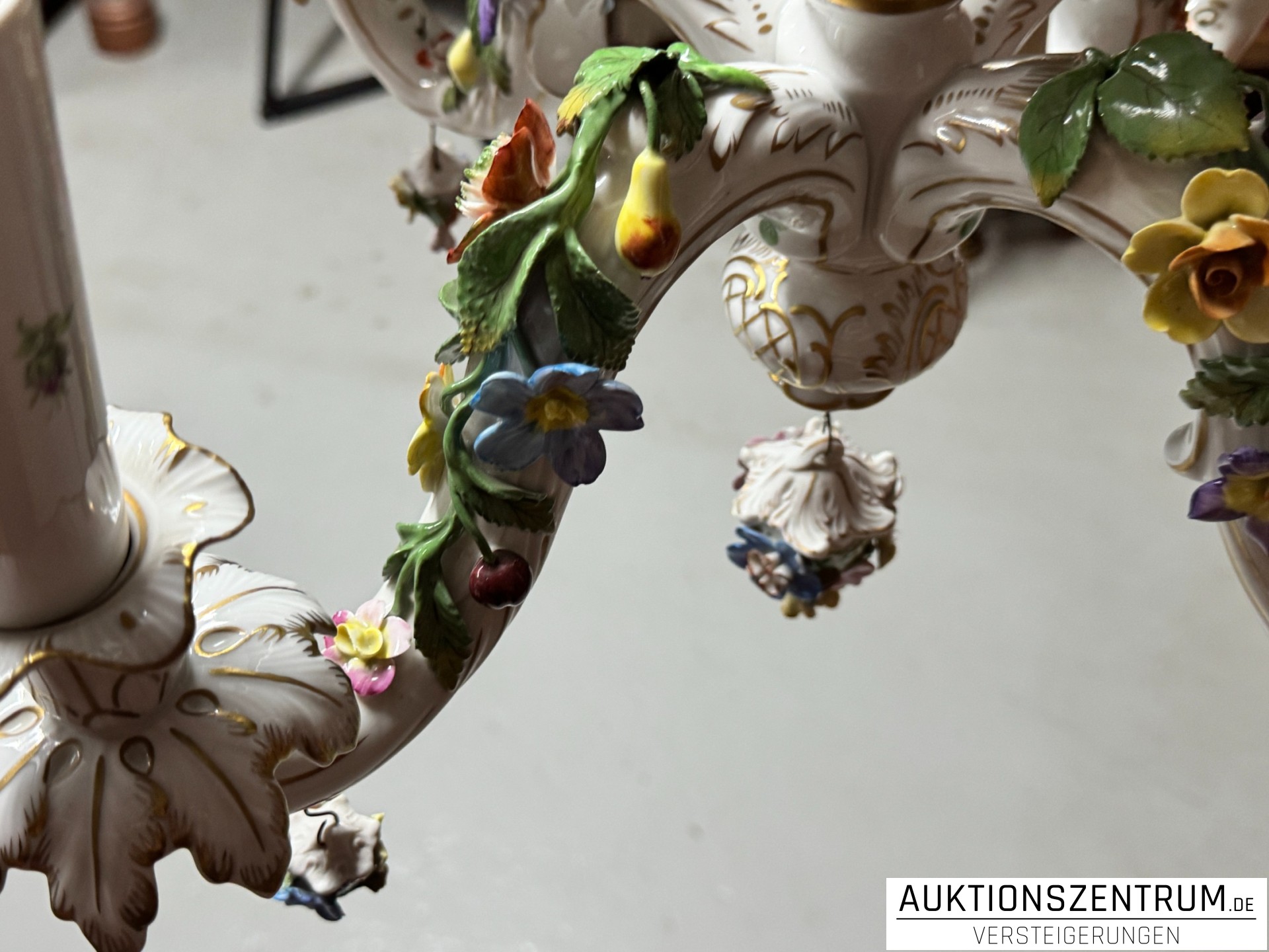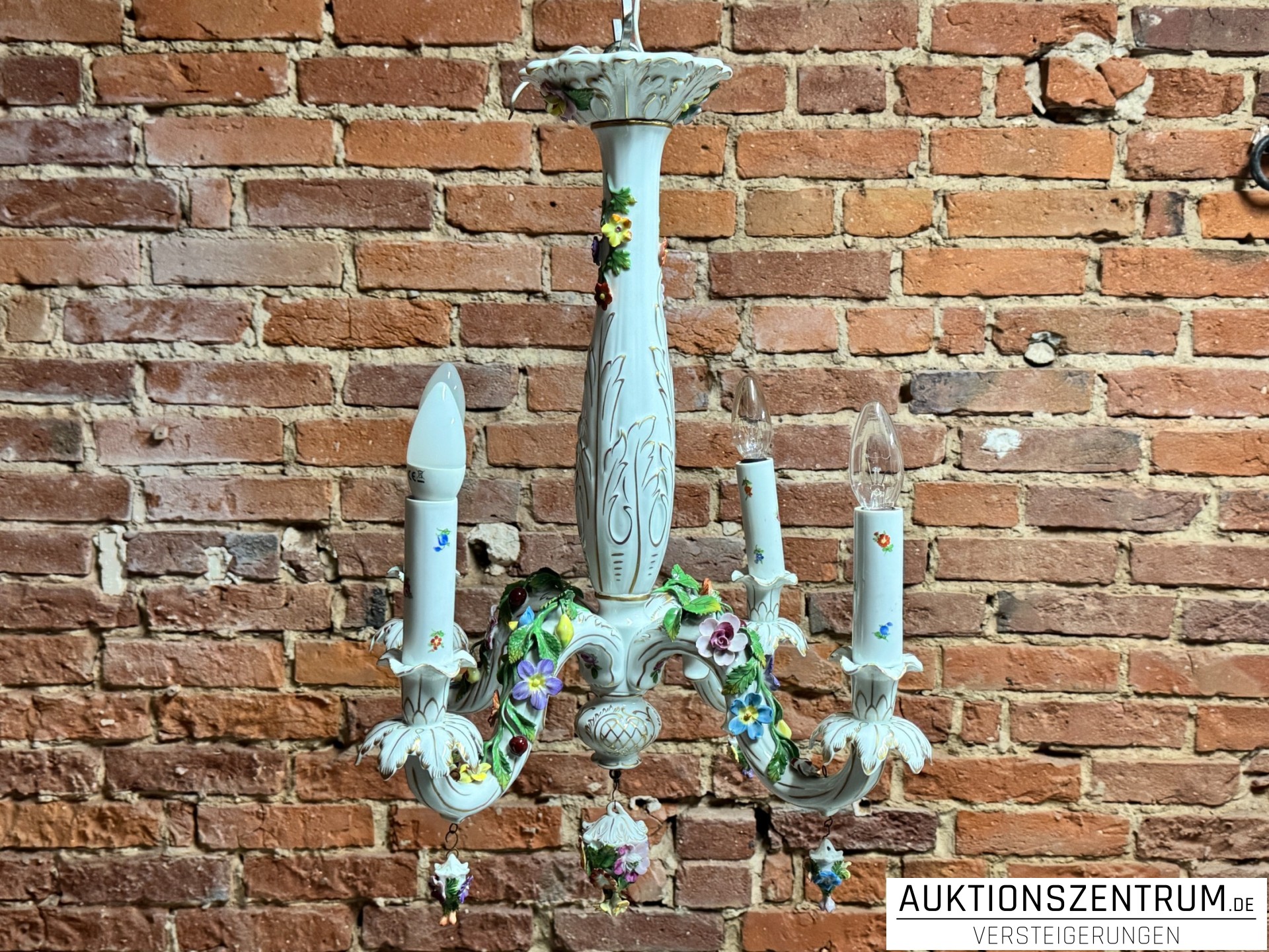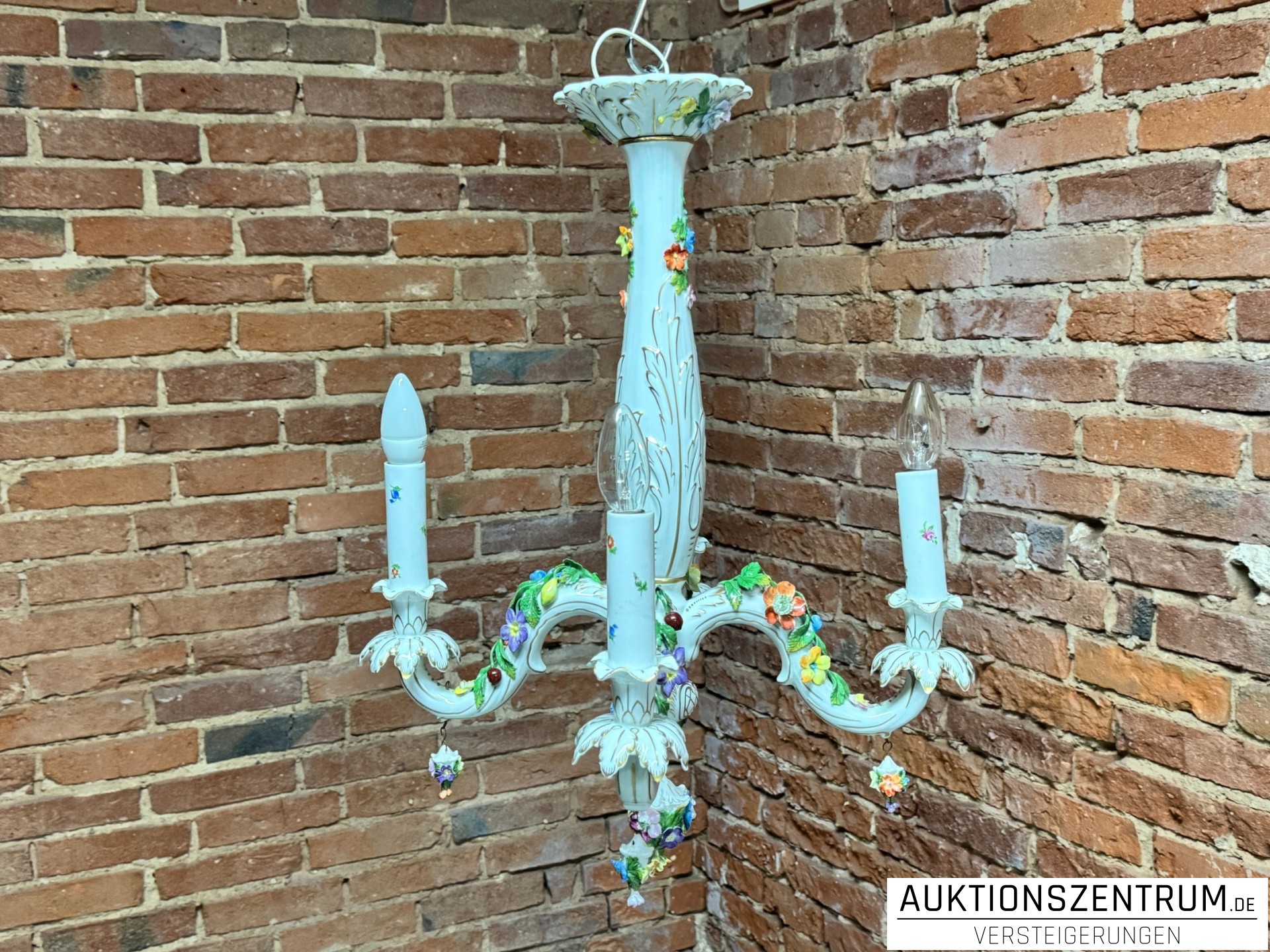 Die geschwungenen Arme enden in tropfenförmigen Porzellananhängern, ebenfalls mit plastischen Blüten besetzt.