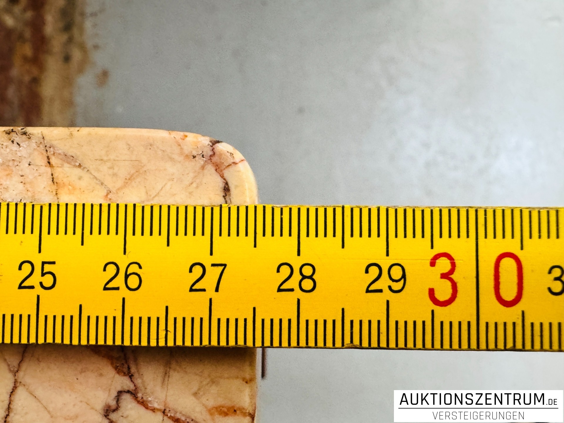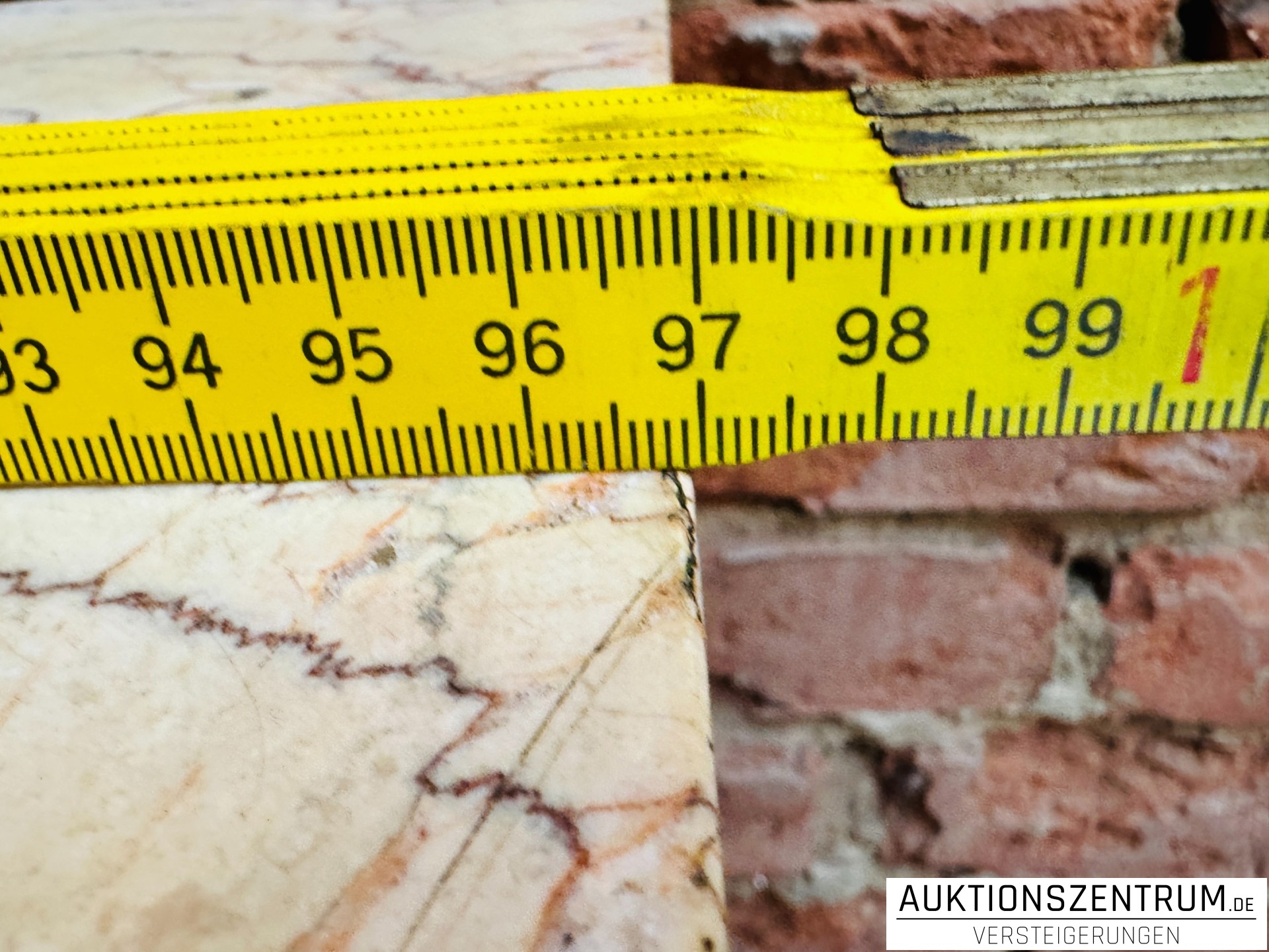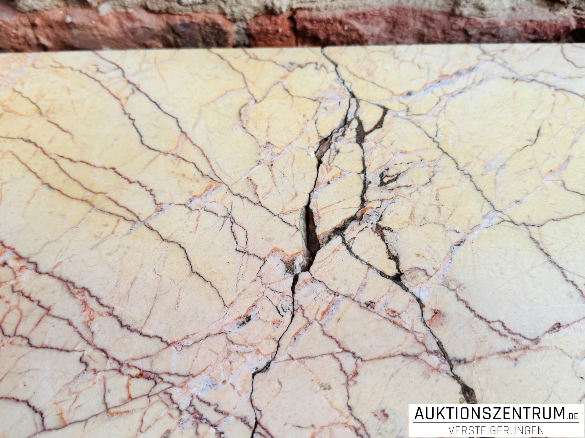 Zustand: insgesamt dekorativer, gebrauchter Zustand. Die Steinplatte weist mehrere sichtbare Risse, Ausbrüche und Kantenbeschädigungen auf.