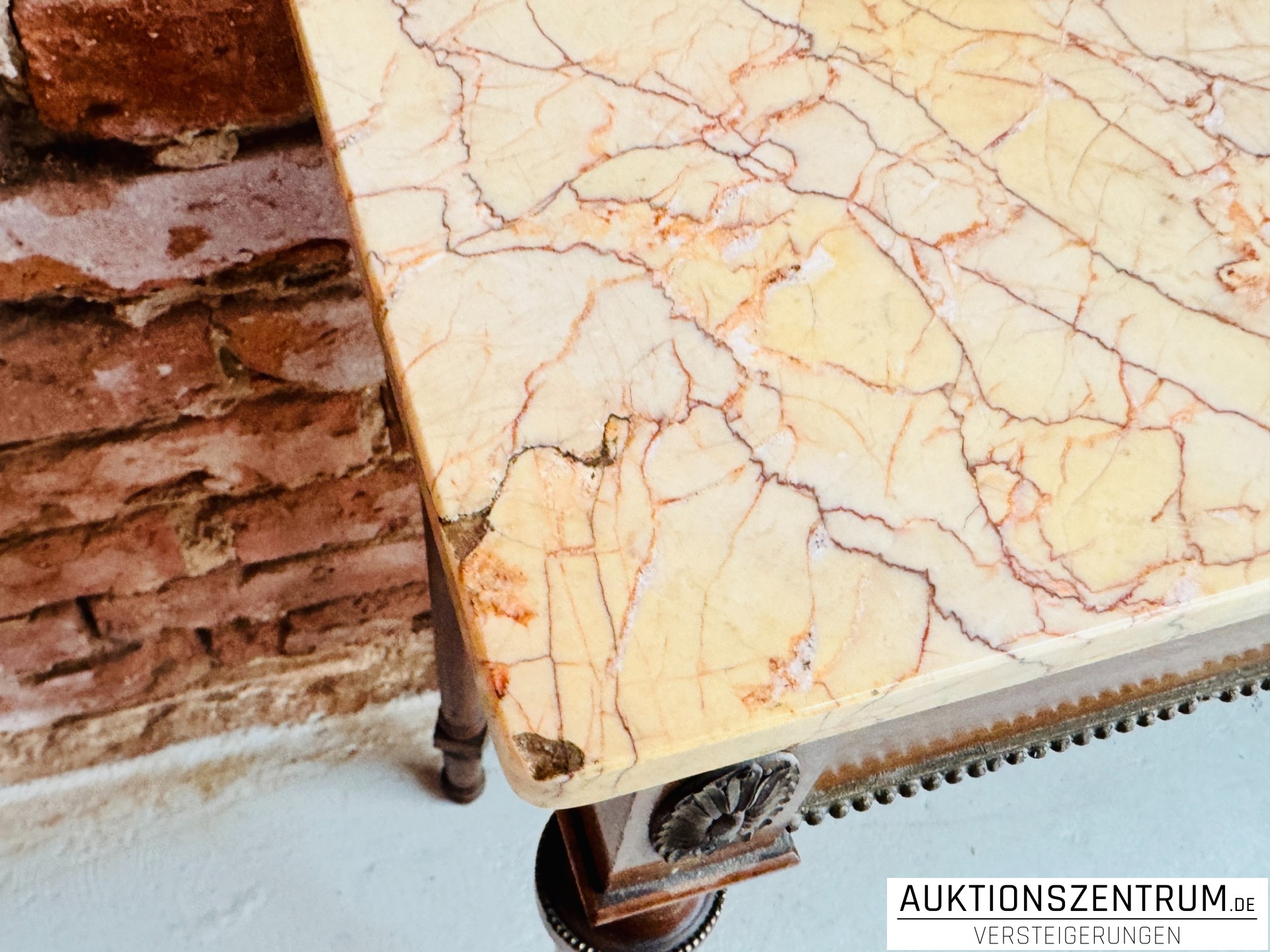 Die helle, kräftig geäderte Steinplatte bildet einen dekorativen Kontrast zum warm getönten Holzunterbau mit gedrechselten, kannelierten Beinen und umlaufender Zierleiste unter der Zarge.