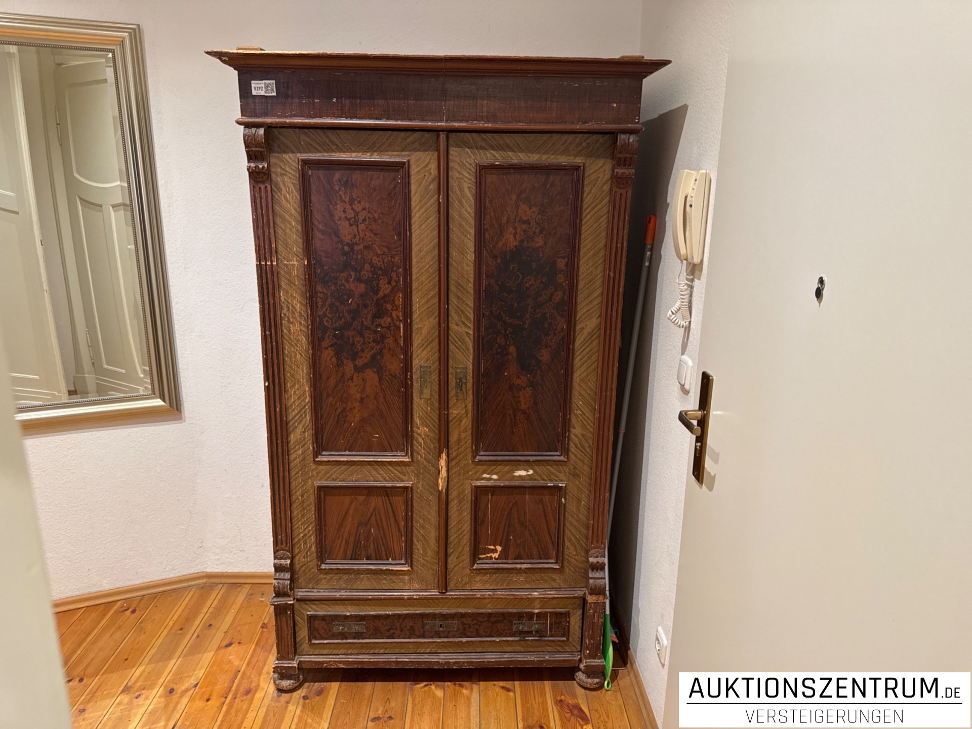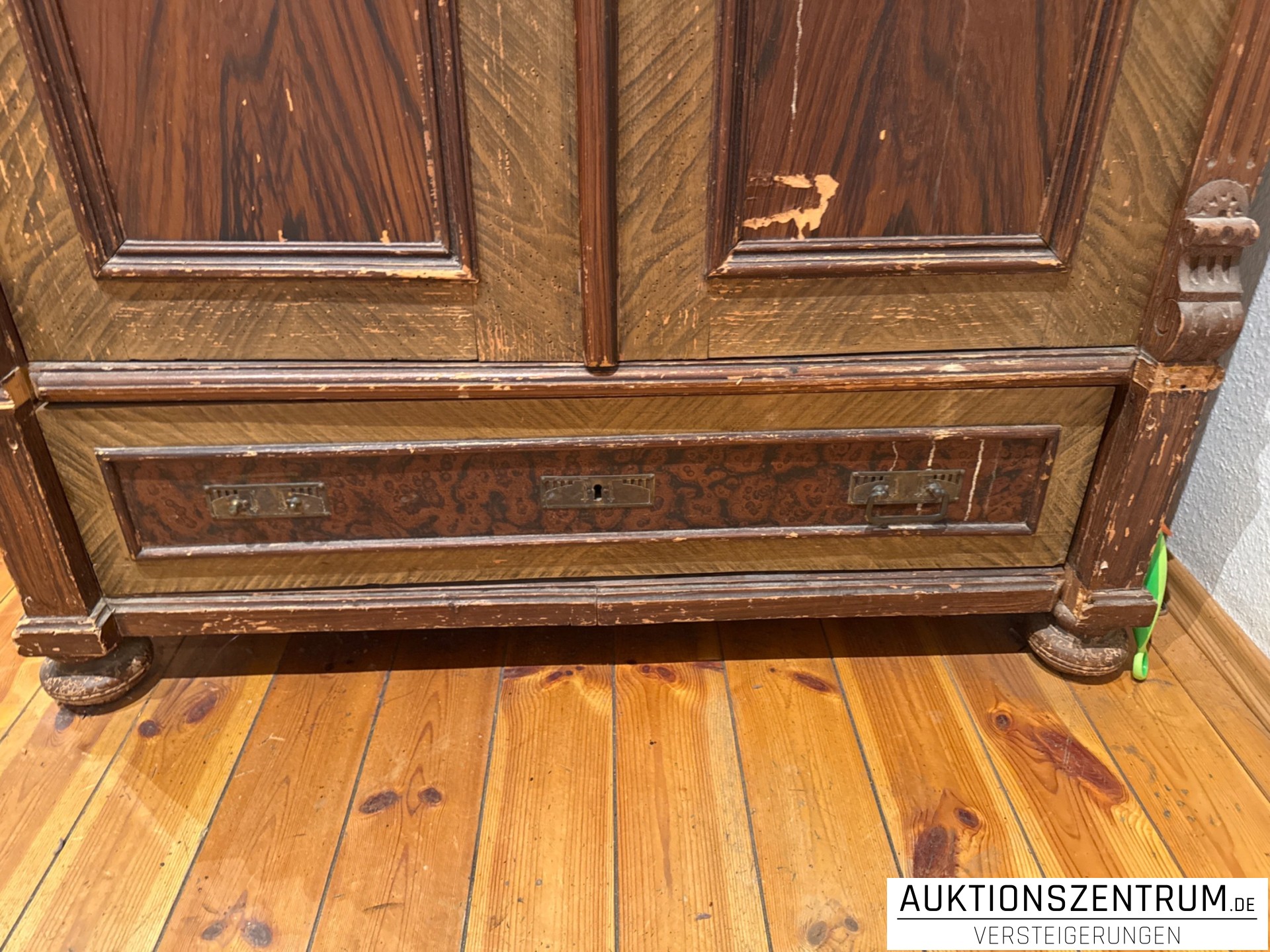 Zweitüriger Kleiderschrank mit kräftigem, auskragendem Kranzgesims, kassettierten Türen und profilierter Sockelzone auf gedrehten Füßen. Die Front ist mit unterschiedlich gemaserten Hölzern furniert, teils in Fischgrät-Anordnung, mit dekorativ abgesetzten Füllungen. Seitliche Lisenen mit geschnitzten Kapitellen und Basen betonen die vertikale Gliederung.