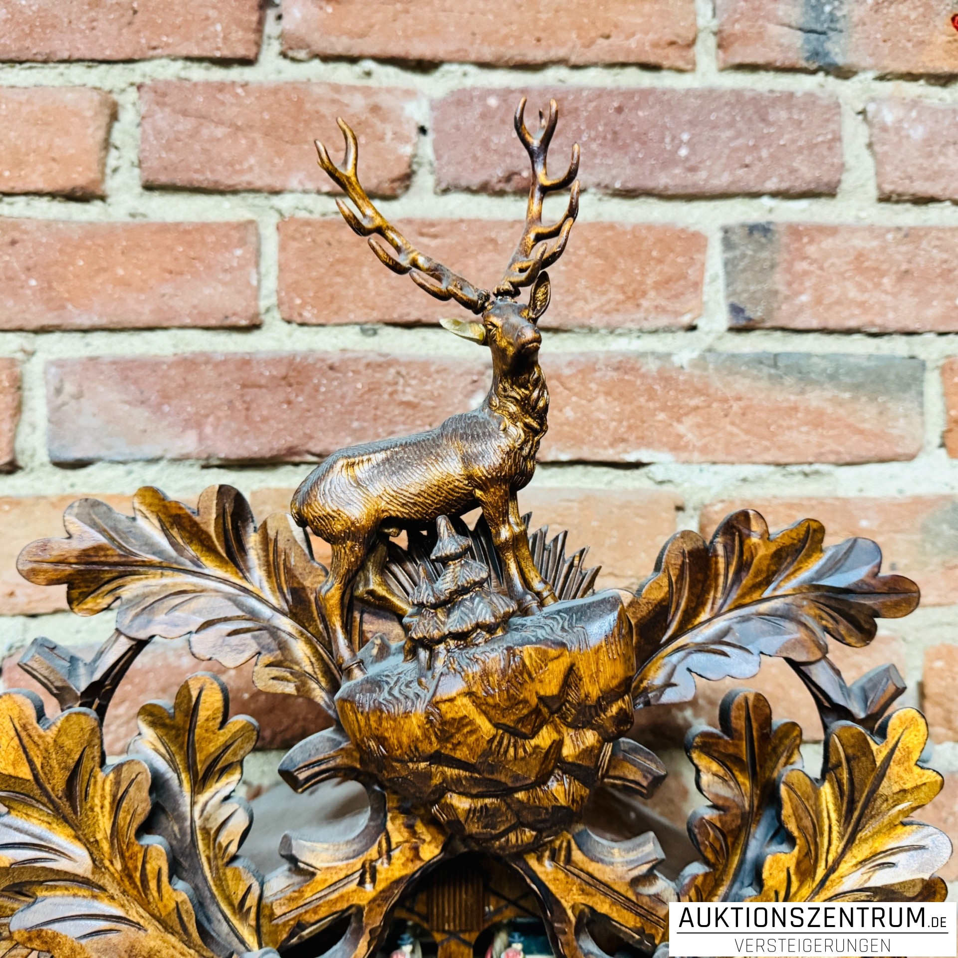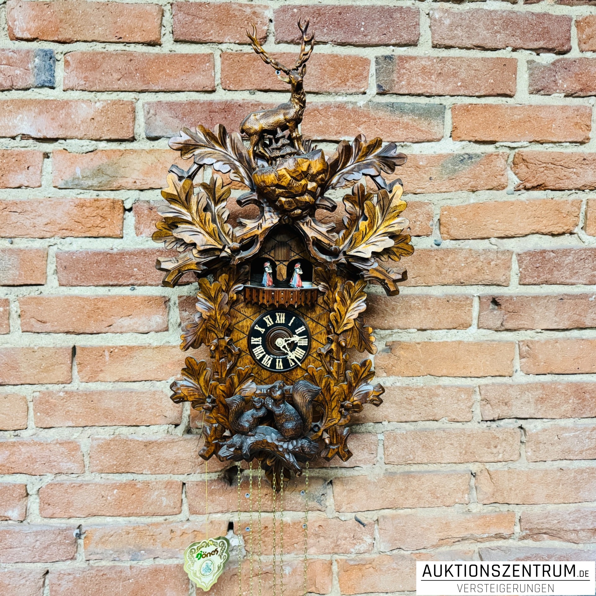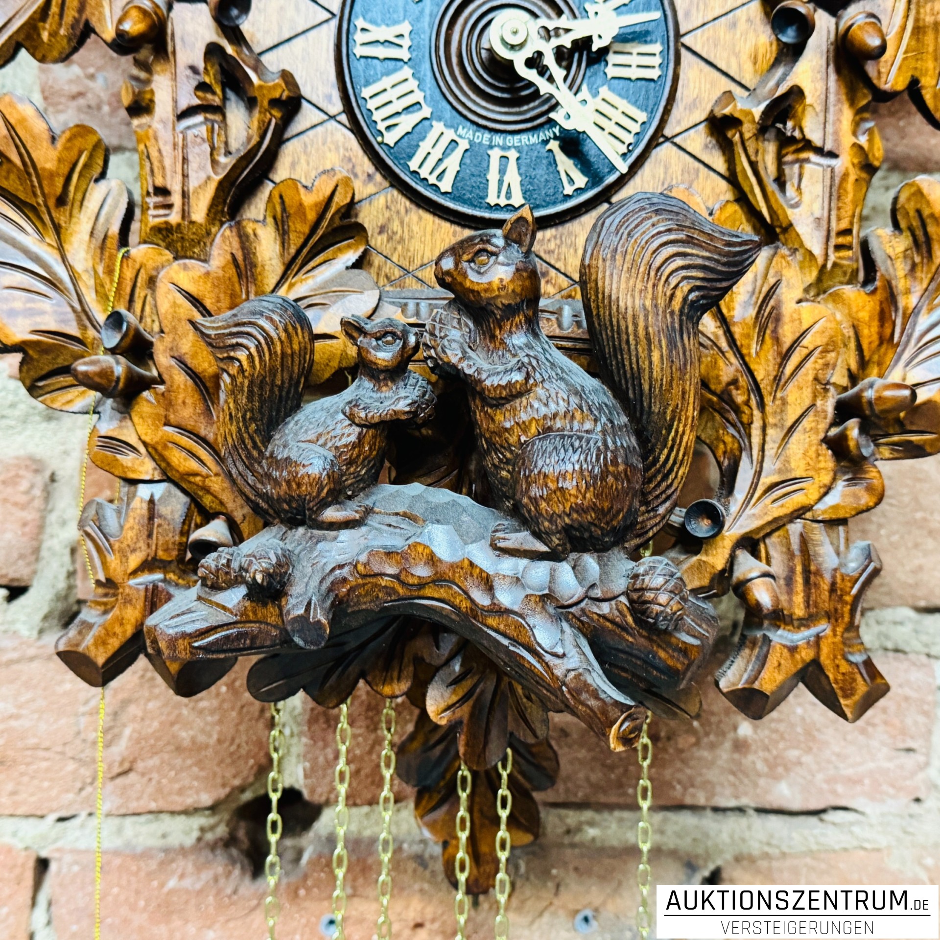 Bekrönt wird die Uhr von einer fein geschnitzten Hirschfigur auf Fels, im unteren Bereich befindet sich eine Gruppe von zwei Eichhörnchen auf einem Ast.