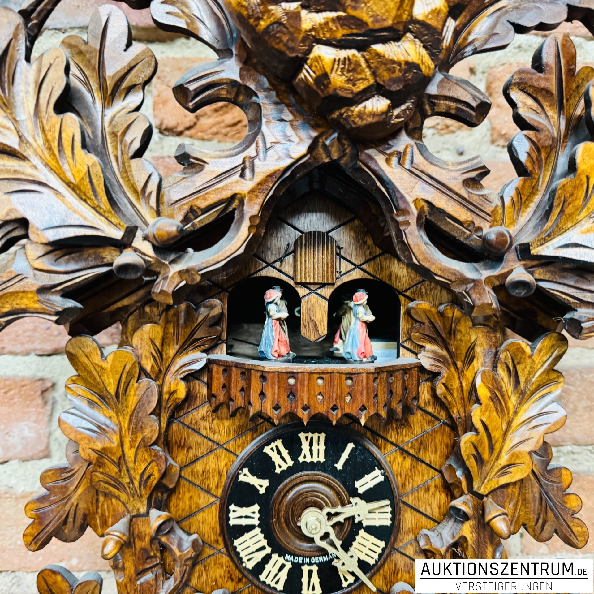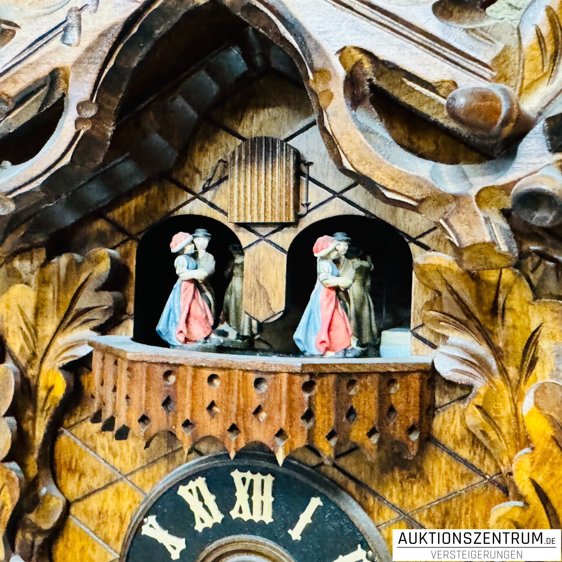 Über dem Zifferblatt ist ein Balkon mit vier farbig gefassten Tanzfiguren angeordnet.