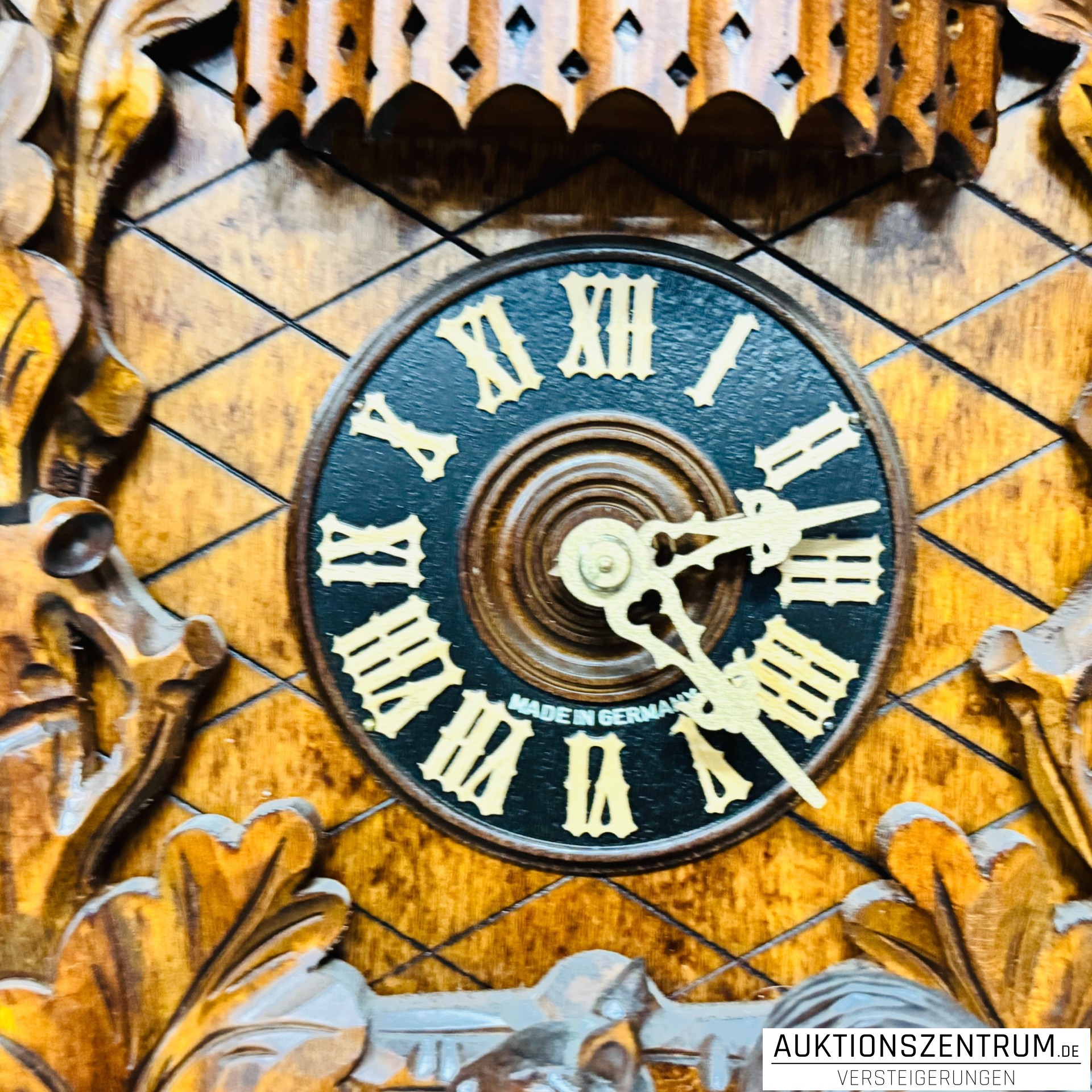 Aufwendig geschnitzte Schwarzwälder Kuckucksuhr der Marke Hönes mit reichem Jagd- und Waldmotiv.