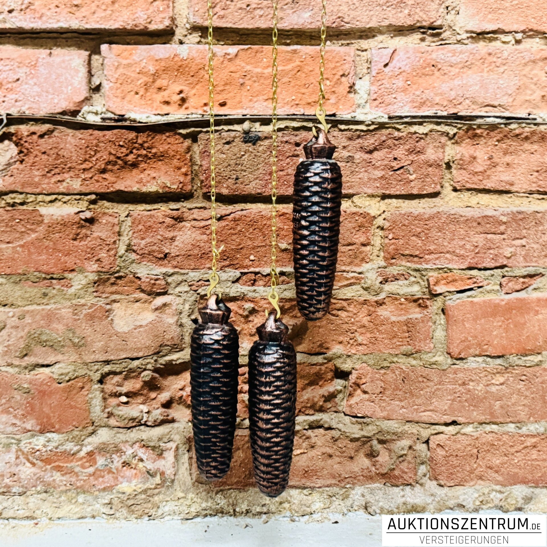 Gewichtsbetriebenes Pendelwerk mit drei dekorativen Tannenzapfen-Gewichten aus Metall an Ketten.