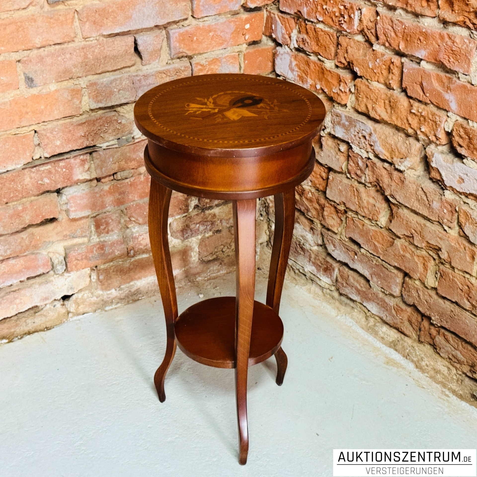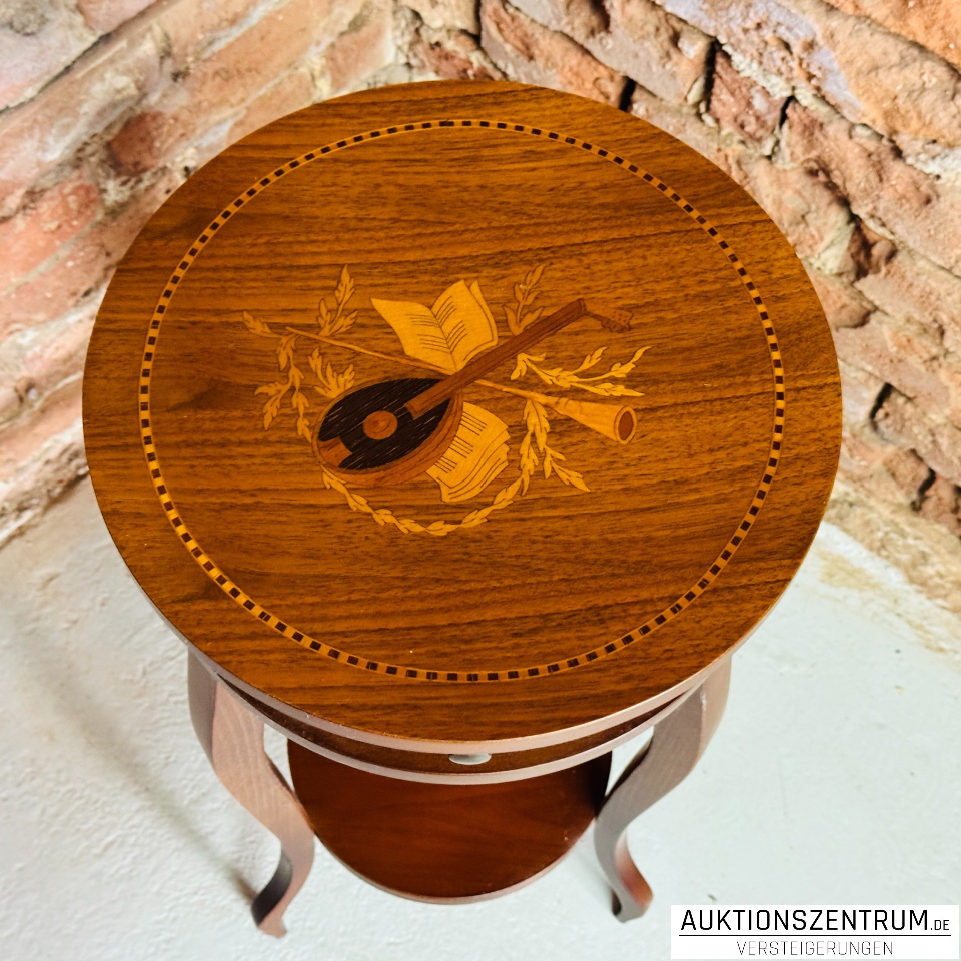 Eleganter runder Beistelltisch aus Holz mit feiner Intarsienarbeit auf der Platte. Der Tisch steht auf vier geschwungenen Beinen und verfügt über eine runde Ablageplatte im unteren Bereich.
