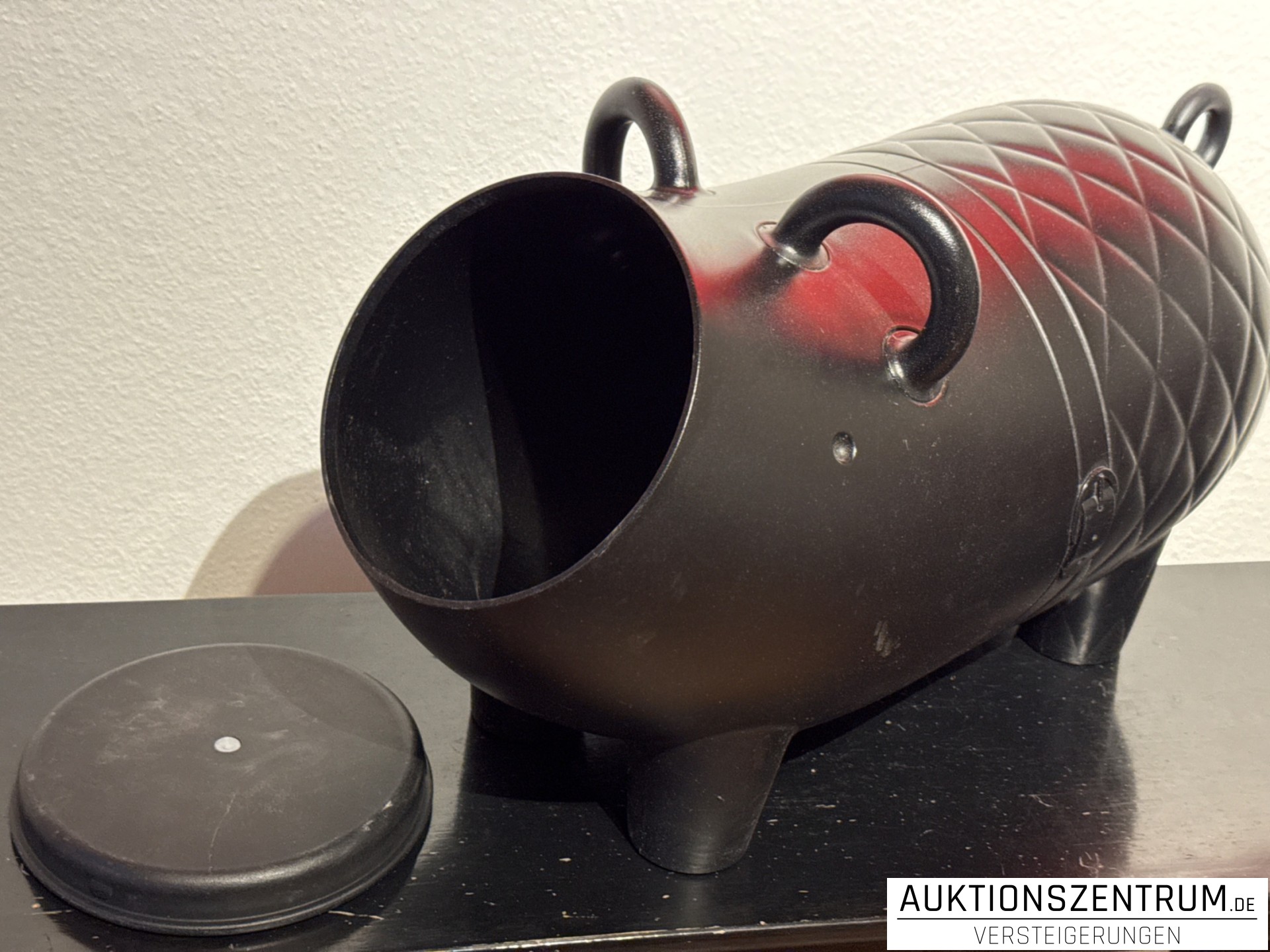 Designobjekt der Marke Cybex, Modell „Wanders Hausschwein PLATINUM Line 1 Black“. Schwarzes, schweinchenförmiges Aufbewahrungsgefäß mit abnehmbarem Deckel an der Stirnseite und vier stabilen Standfüßen. Der hintere Korpus ist mit einem rautenförmigen Strukturdekor versehen, seitlich befinden sich ringförmige Griffe sowie ein angedeuteter Verschlussriegel.