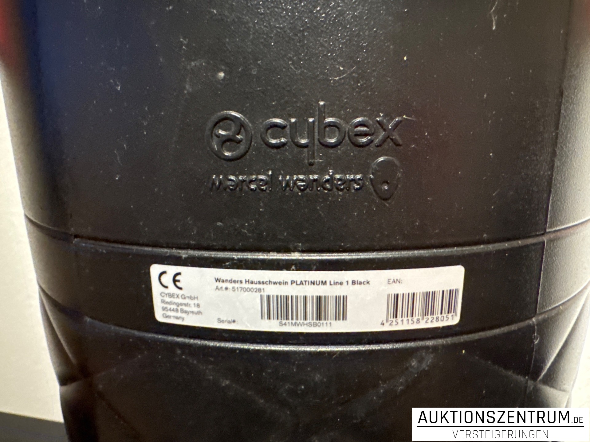Markierung: geprägtes Logo „cybex“ und „marcel wanders“ auf der Unterseite, darunter Herstelleretikett mit Bezeichnung „Wanders Hausschwein PLATINUM Line 1 Black“, Artikel-Nr. S17000281, CE-Kennzeichnung, Herstellerangabe CYBEX GmbH, Bayreuth, Germany.
