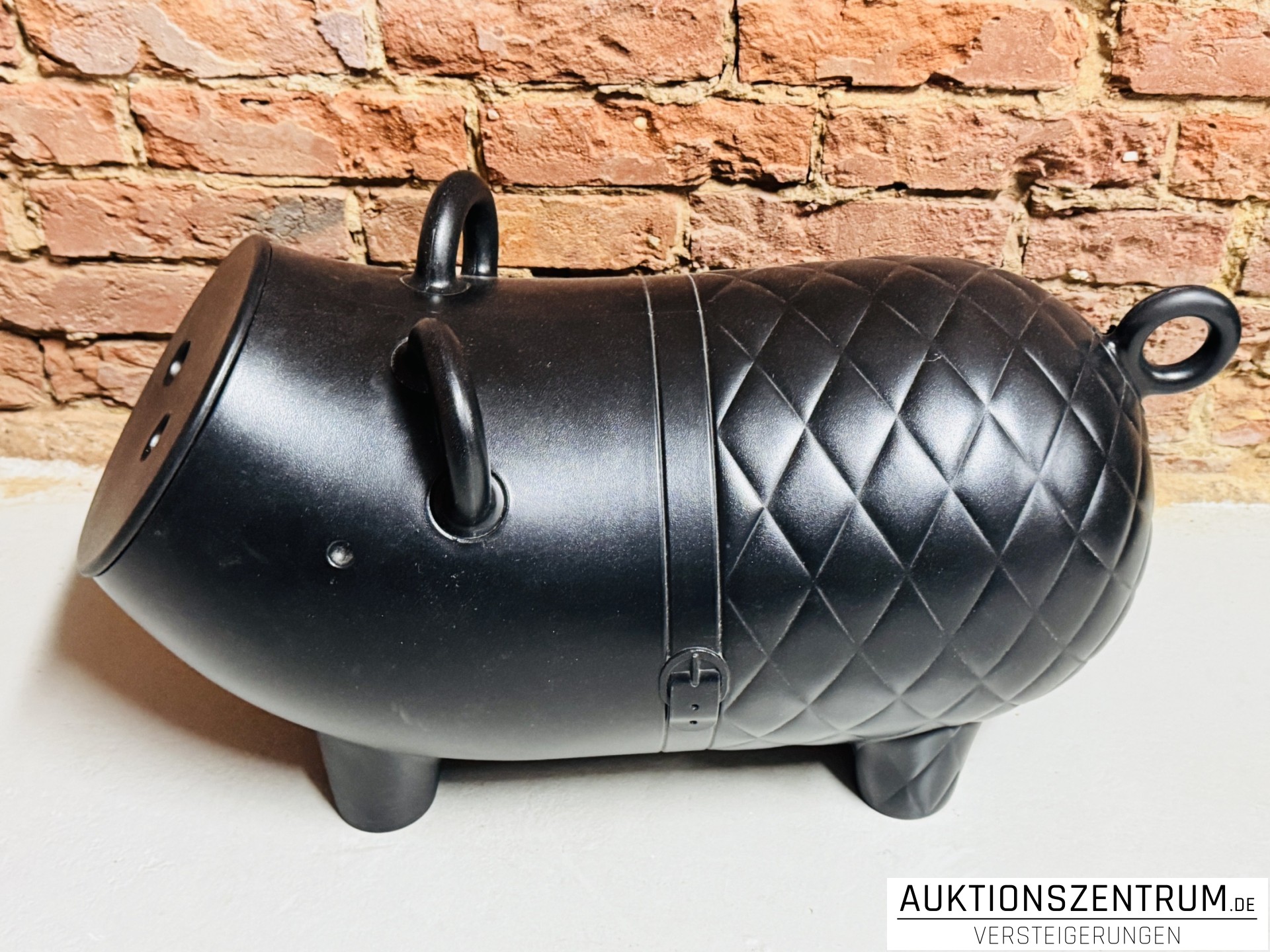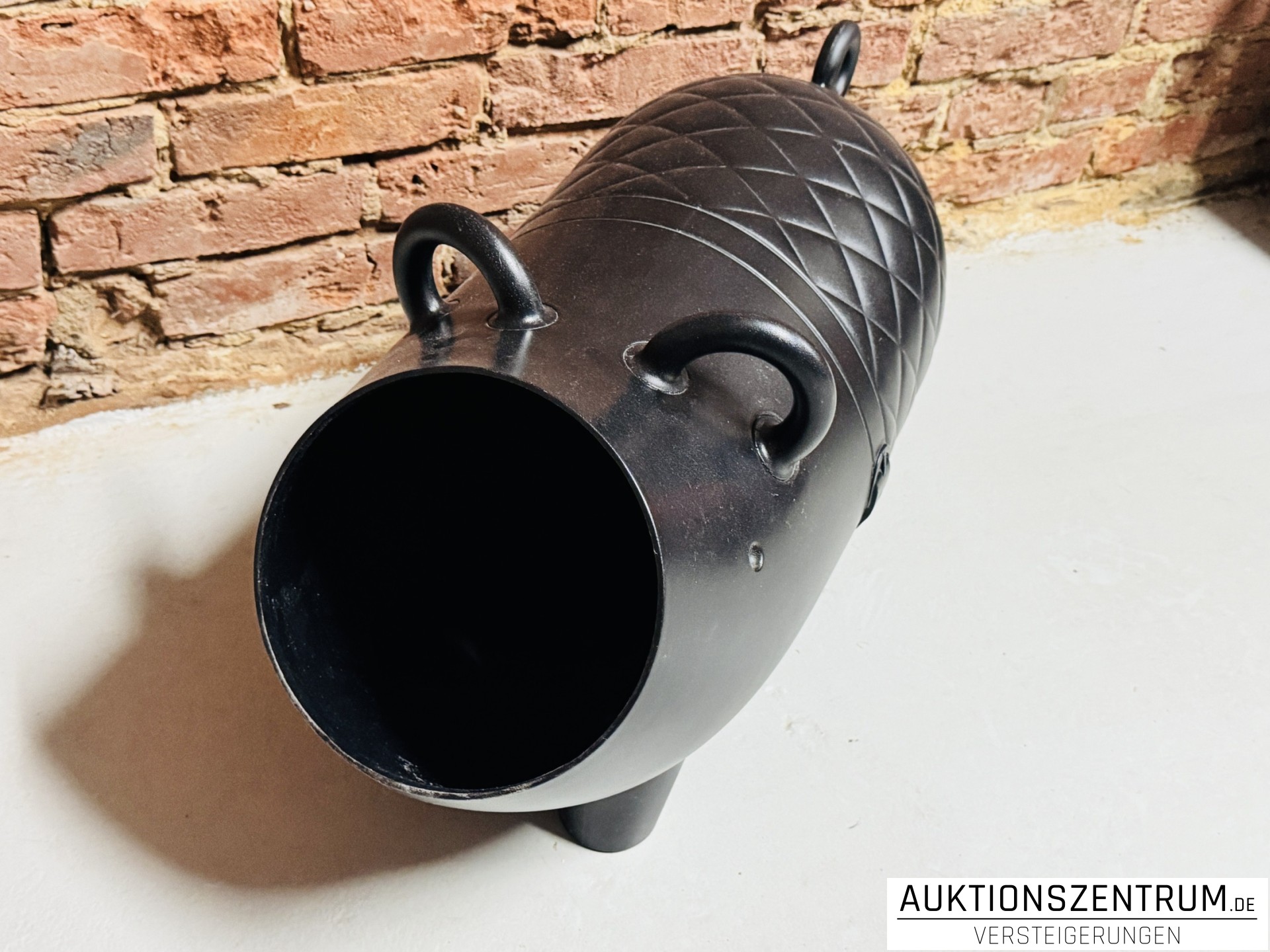 Schwarzes, schweinchenförmiges Aufbewahrungsgefäß mit abnehmbarem Deckel an der Stirnseite und vier stabilen Standfüßen.