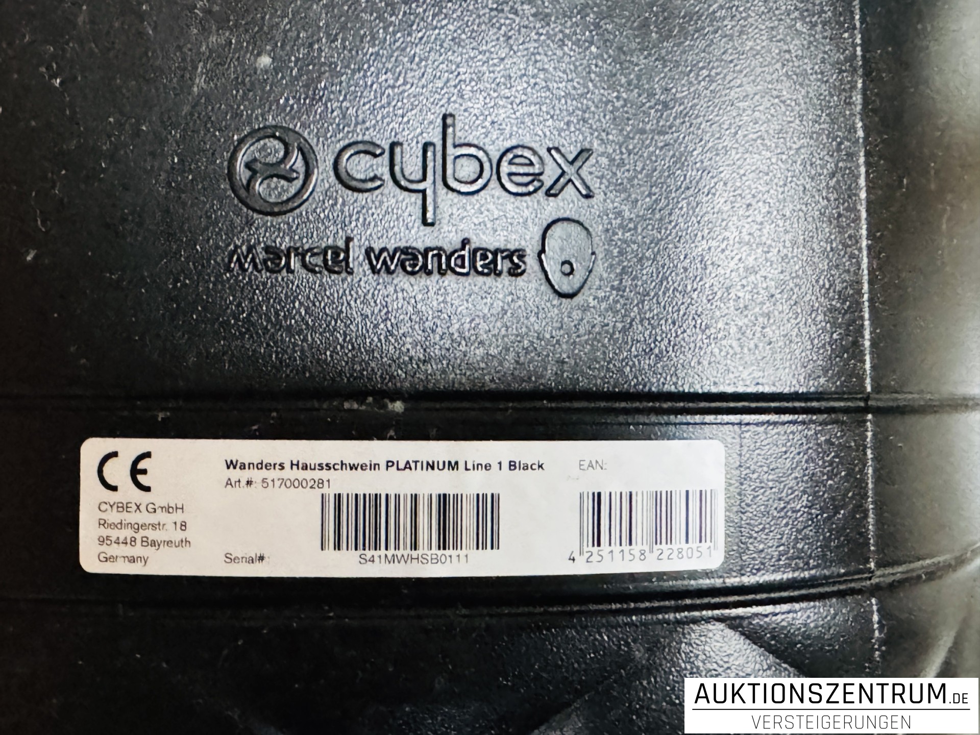 Markierung: geprägtes Logo „cybex“ und „marcel wanders“ auf der Unterseite, darunter Herstelleretikett mit Bezeichnung „Wanders Hausschwein PLATINUM Line 1 Black“, Artikel-Nr. S17000281, CE-Kennzeichnung, Herstellerangabe: CYBEX GmbH, Bayreuth, Germany.