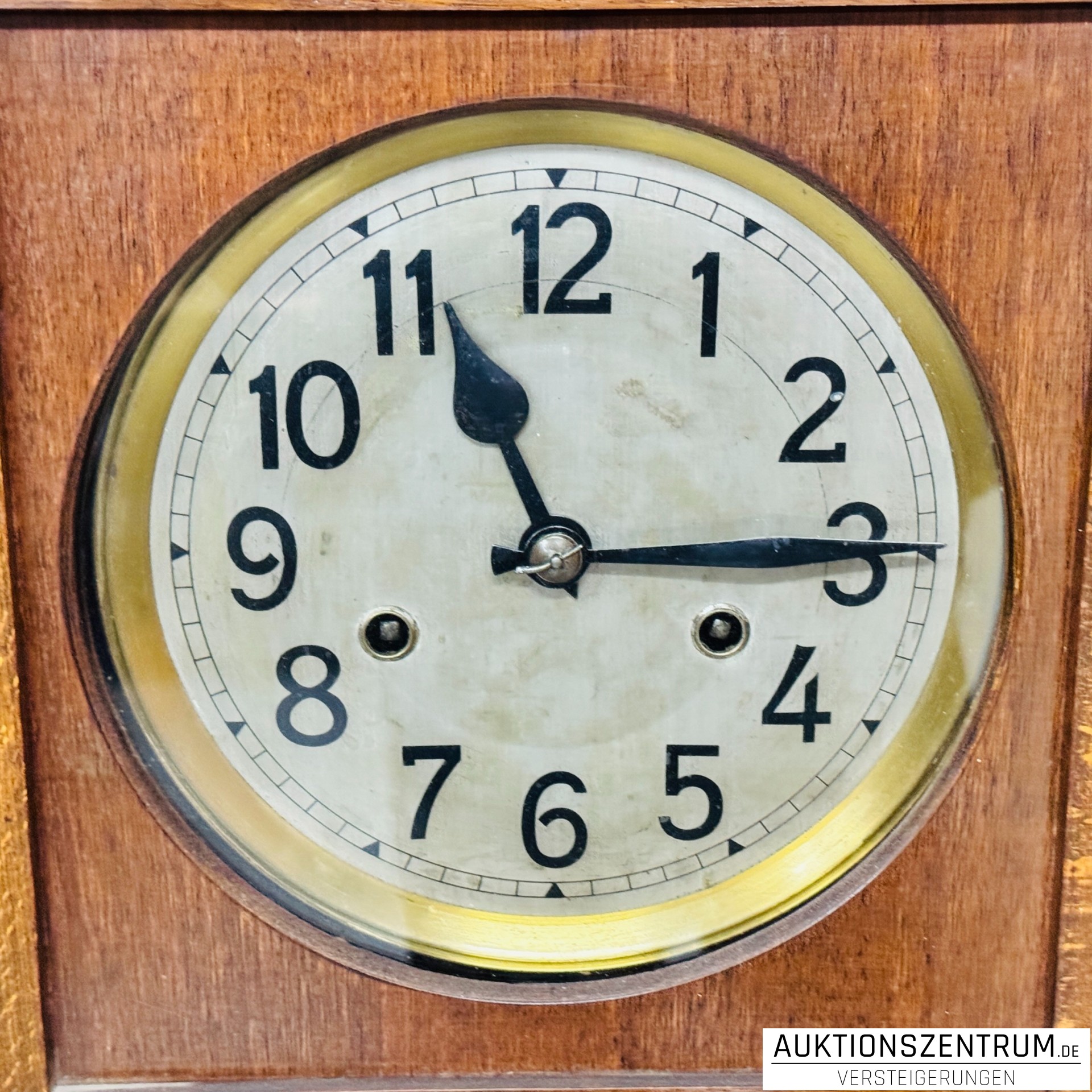 Das Gehäuse zeigt eine dezente, an historische Stilformen angelehnte Gestaltung mit profiliertem Kopfstück, geschnitztem Ziermotiv und senkrechten Kanneluren an den Seiten.