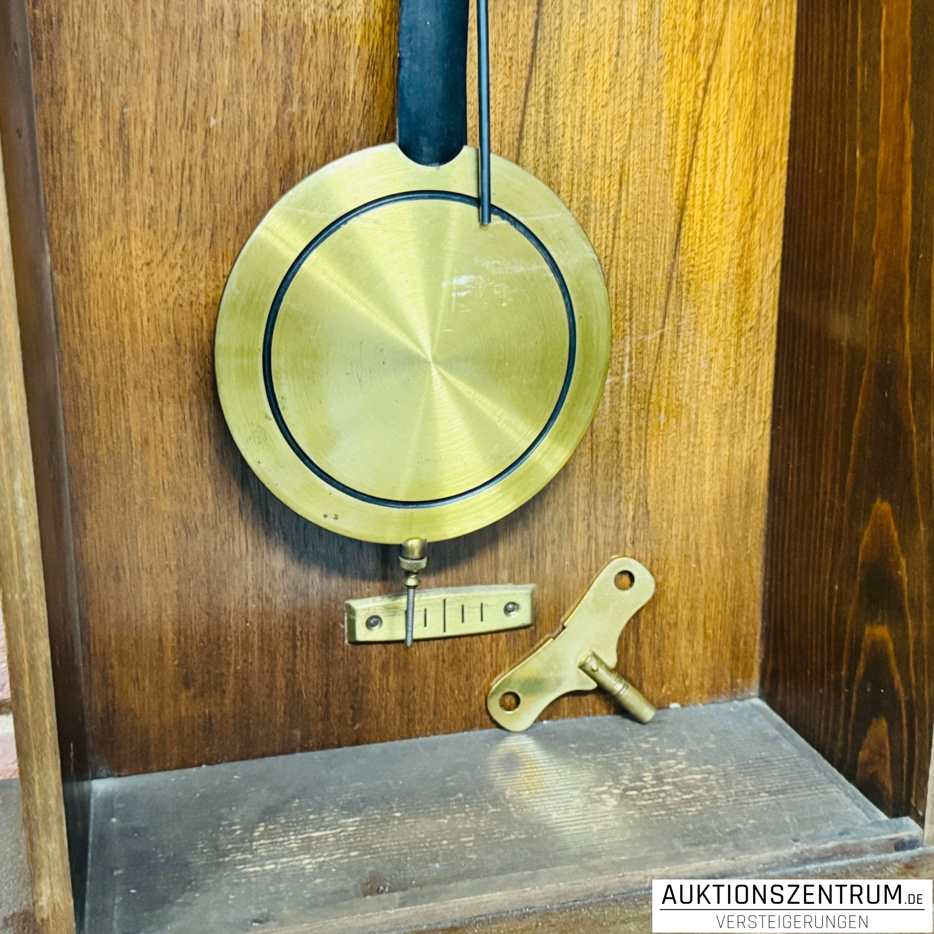 Im Inneren mechanisches Pendelwerk mit Messingpendel und Regulierschieber, dazu passender Aufzugsschlüssel.