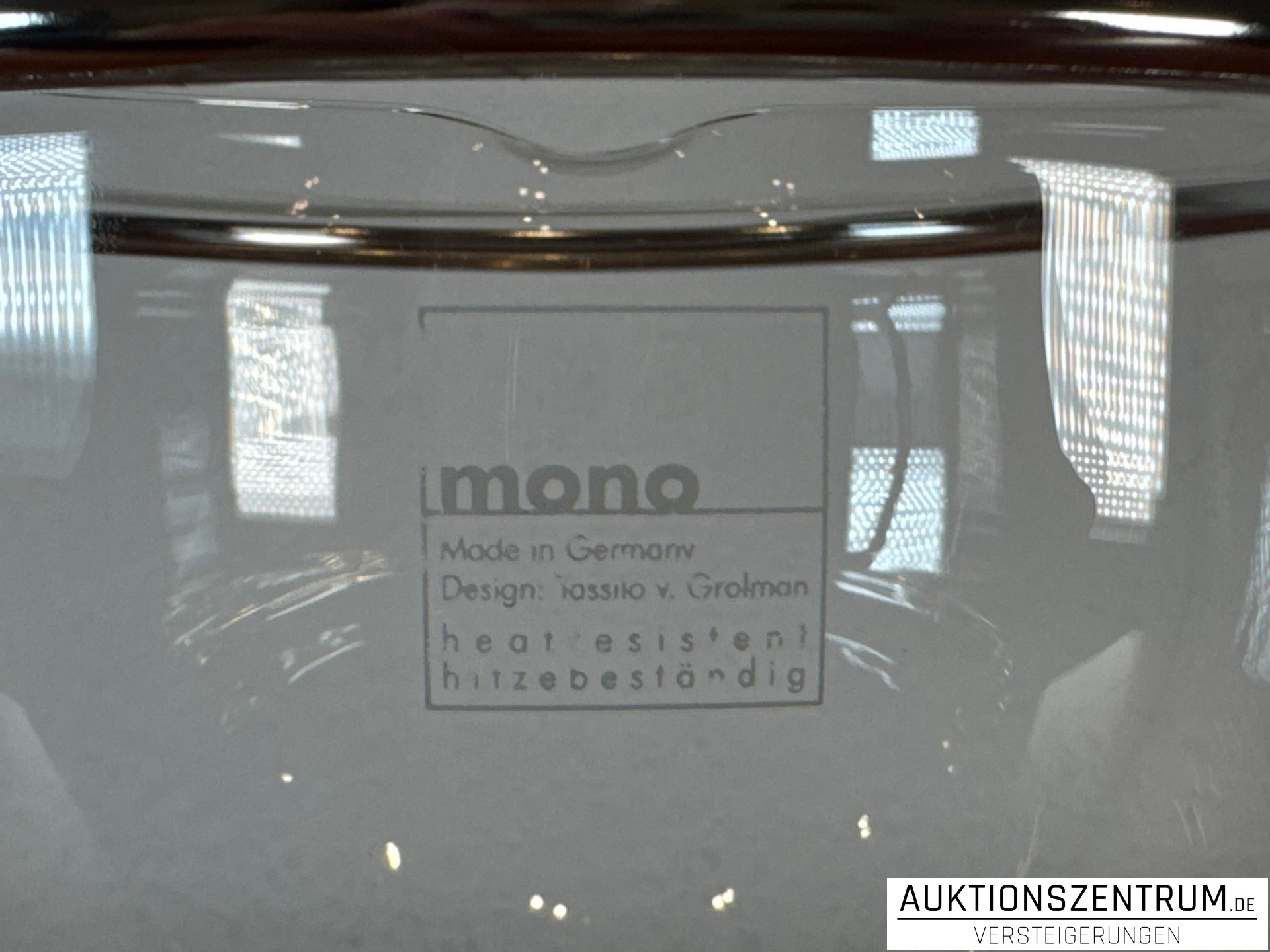 Exklusiver Teebereiter "Filio" des Herstellers mono, designed von Tassilo von Grolman. Hergestellt in Deutschland aus hitzebeständigem Glas und hochwertigem Edelstahl, bietet dieses Set eine stilvolle Möglichkeit zur Teezubereitung und -präsentation. Das integrierte Sieb und das formschöne Stövchen sind perfekt aufeinander abgestimmt und unterstreichen die Funktionalität dieses Designobjekts. Ideal für den täglichen Gebrauch oder als besonderes Geschenk. Das Set befindet sich in einem sehr guten, gepflegten Zustand.