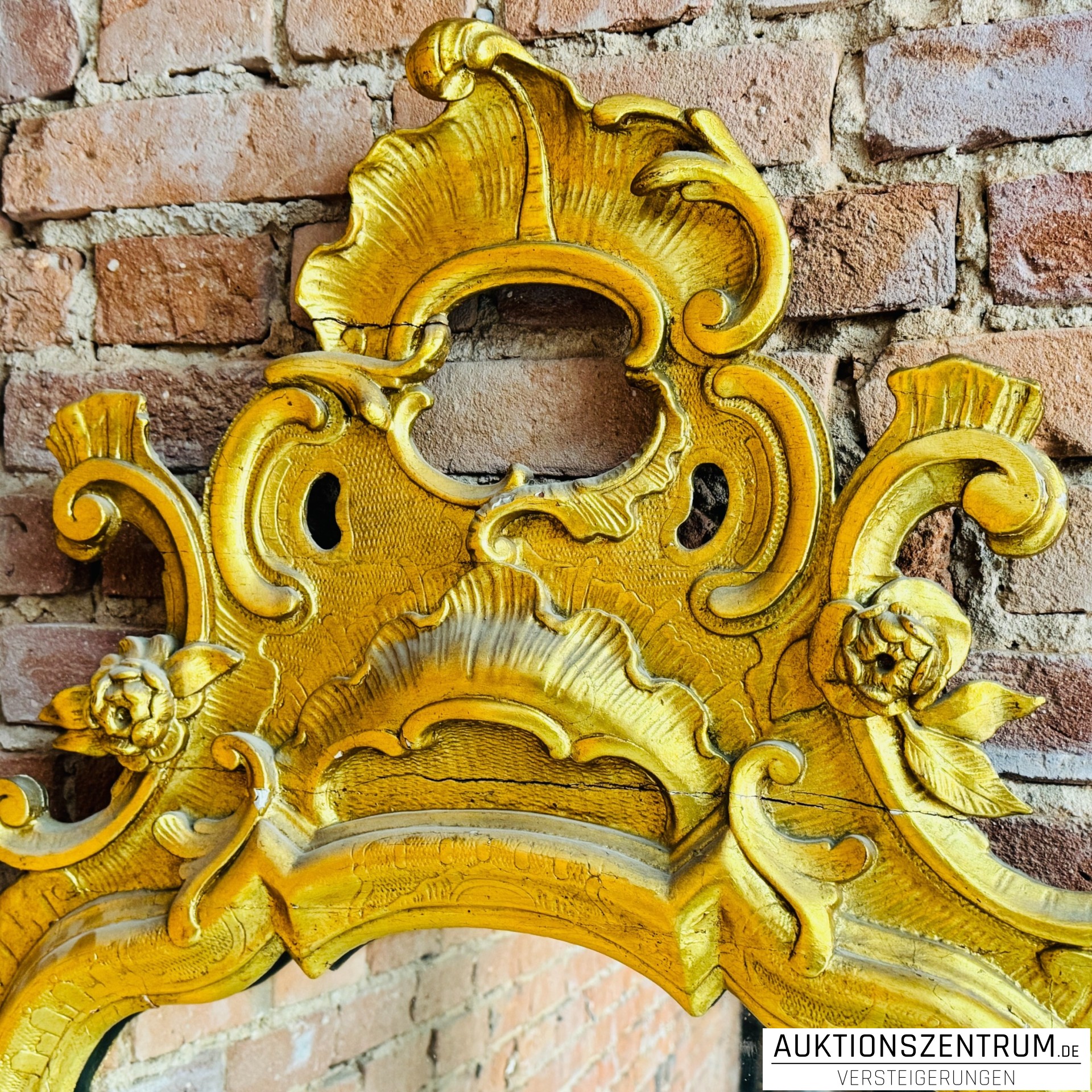 Der Rahmen zeigt kräftige Voluten, Muschel- und Blattornamente sowie florale Applikationen im oberen Bereich, der untere Abschluss ist ebenfalls dekorativ durchbrochen gearbeitet.