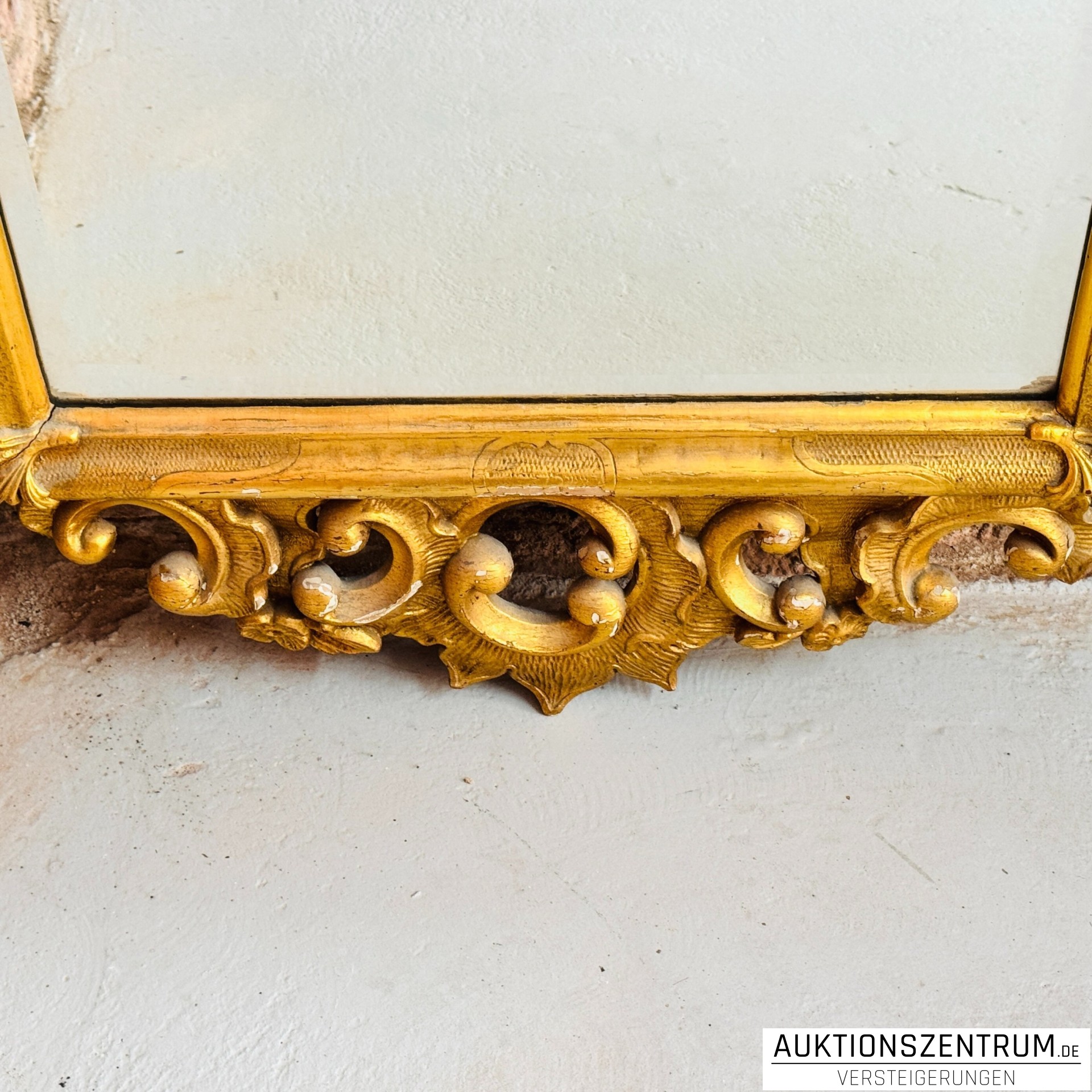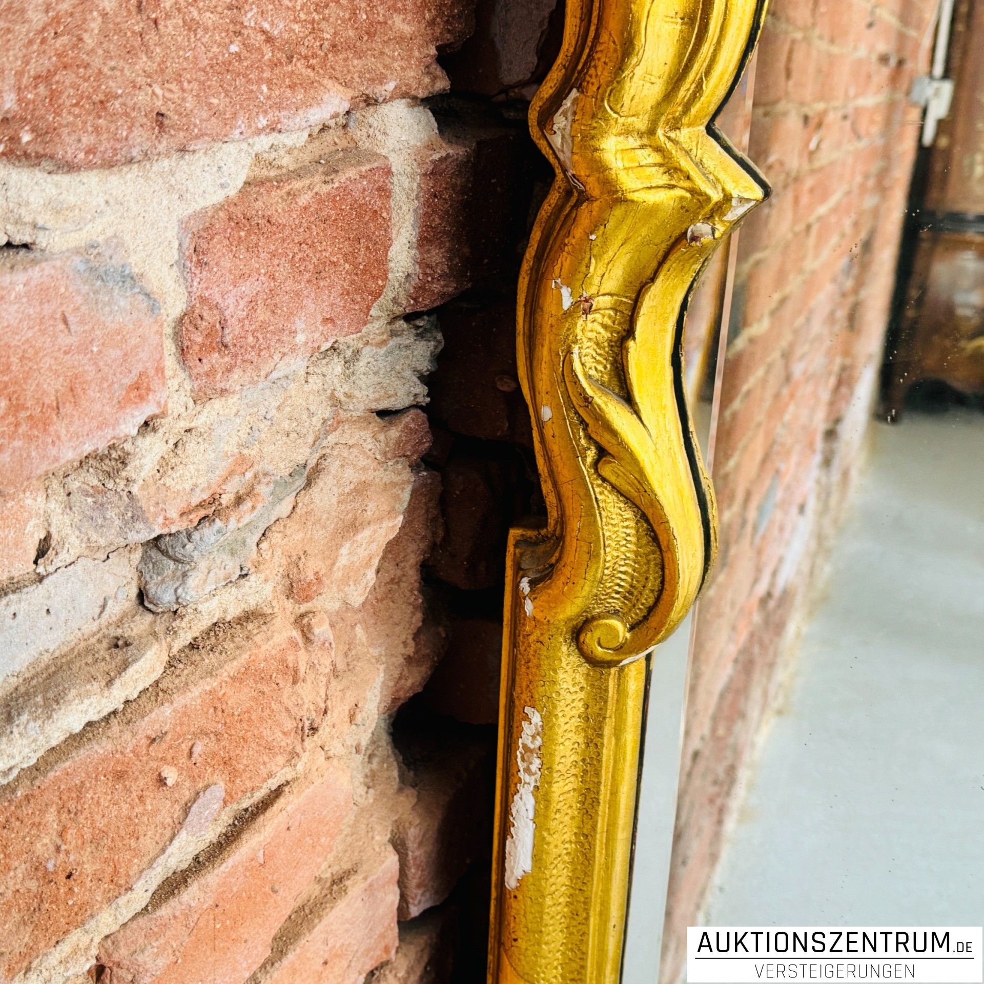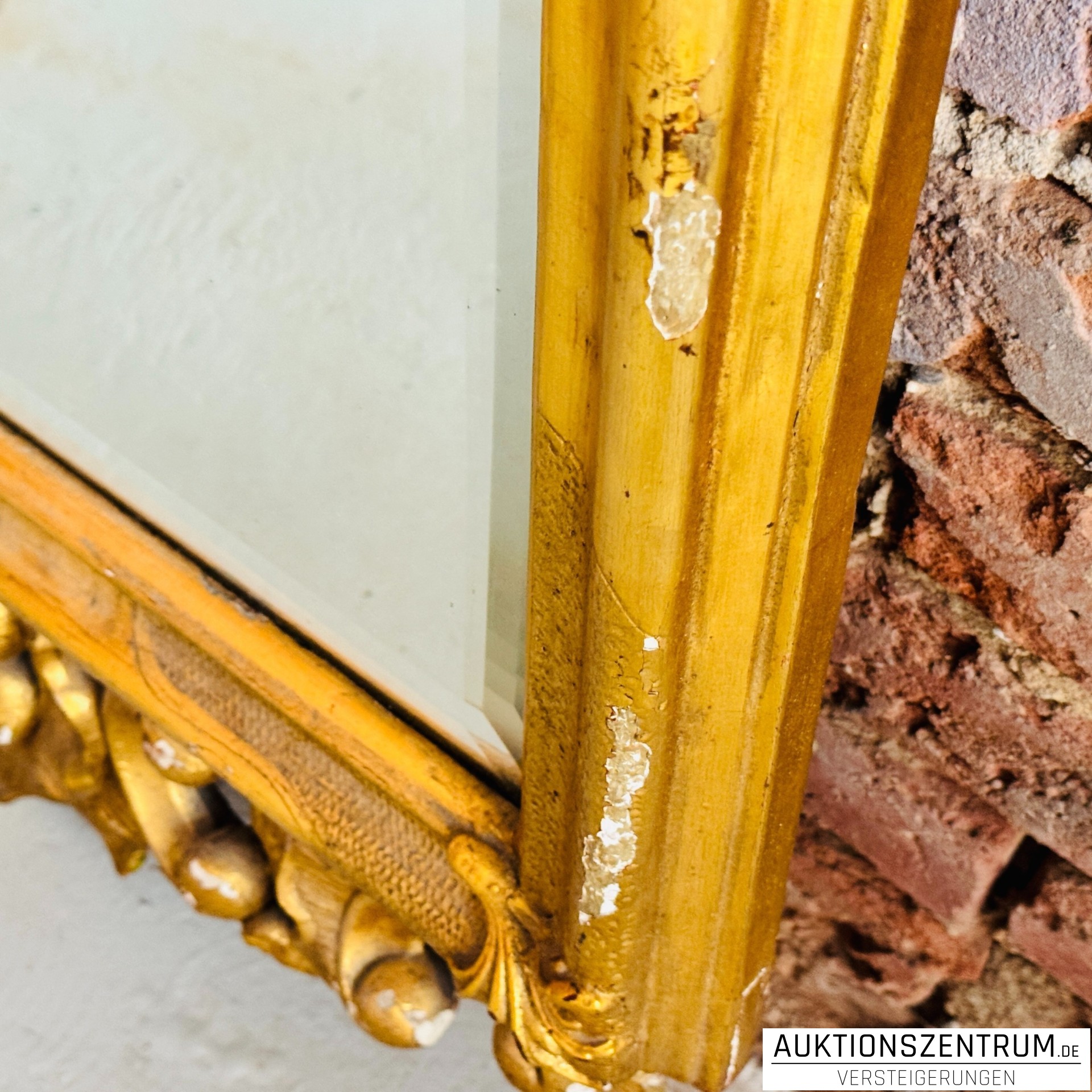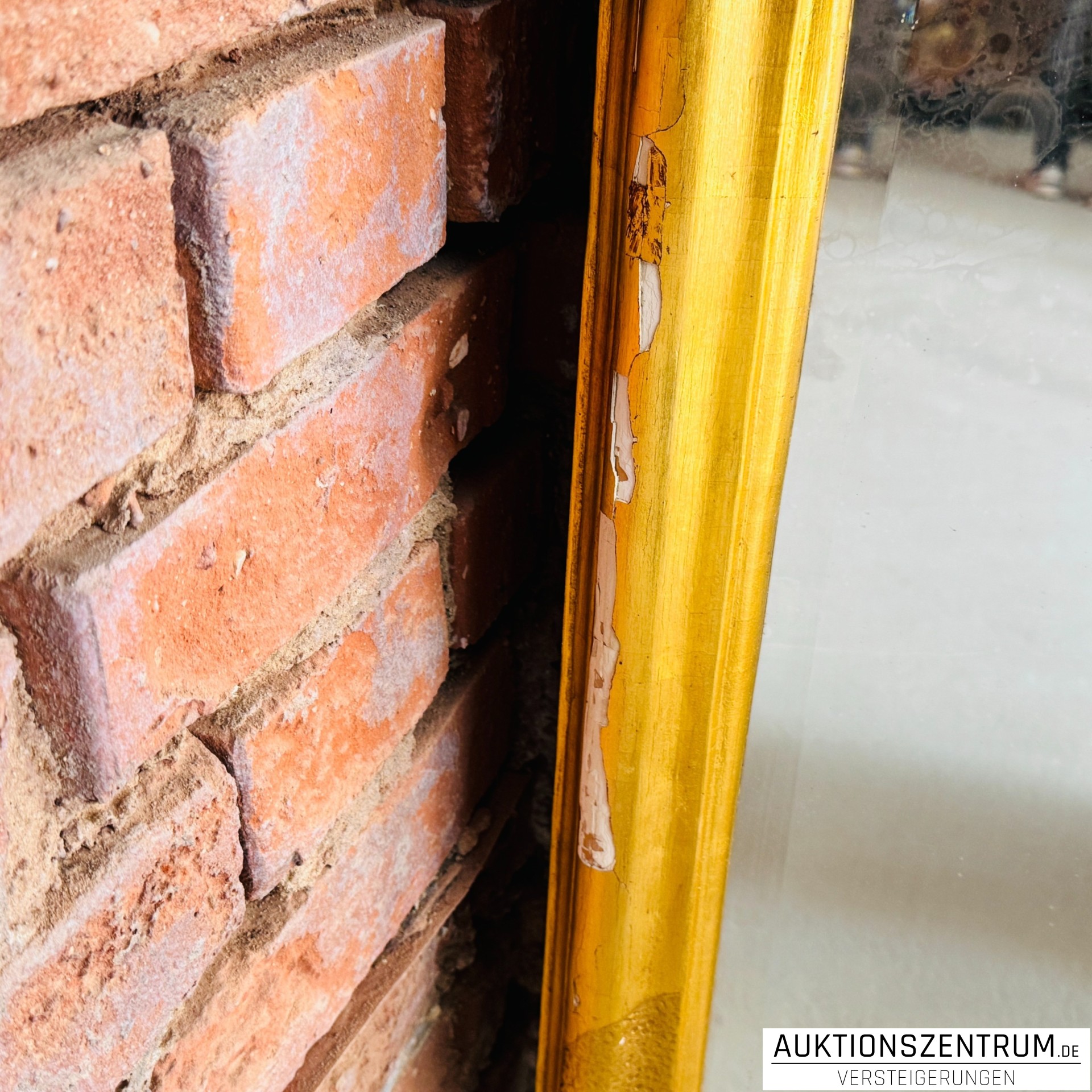 Zustand: dekorativer, gebrauchter Zustand mit alters- und nutzungsbedingten Spuren. Mehrere kleinere Abplatzer und Fehlstellen in der Vergoldung und Fassung, insbesondere seitlich am Rahmen. Spiegelglas mit leichten Gebrauchsspuren. Insgesamt ein wirkungsvoller, repräsentativer Spiegel mit authentischer Patina, gut geeignet als Blickfang in klassischem oder eklektischem Interieur.