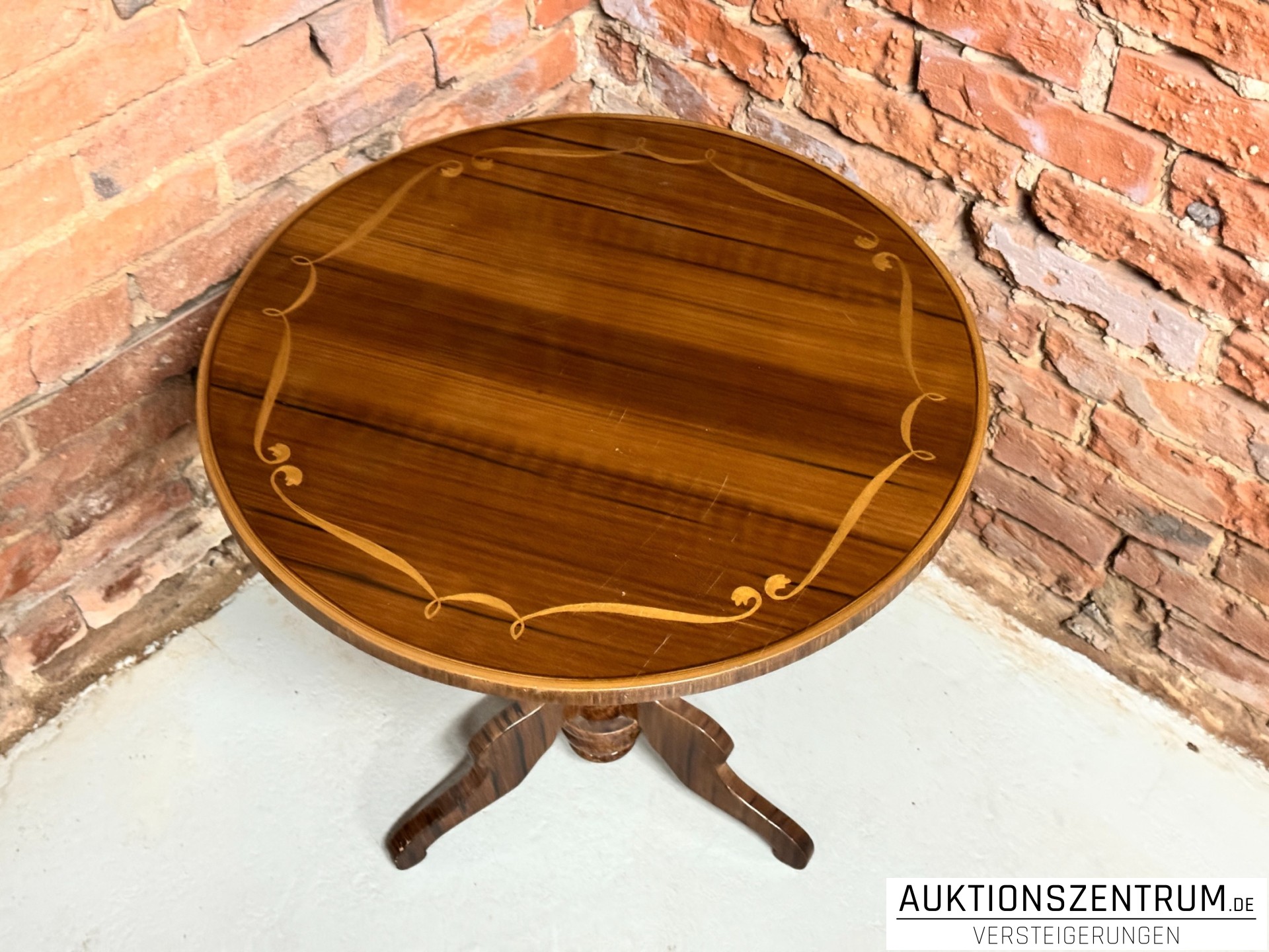 Die Platte ist mit einer umlaufenden, hell abgesetzten Intarsienbordüre in geschwungener Linienführung gestaltet und ruht auf einem gedrechselten Mittelschaft mit dreiteiligem, geschweiftem Fuß.