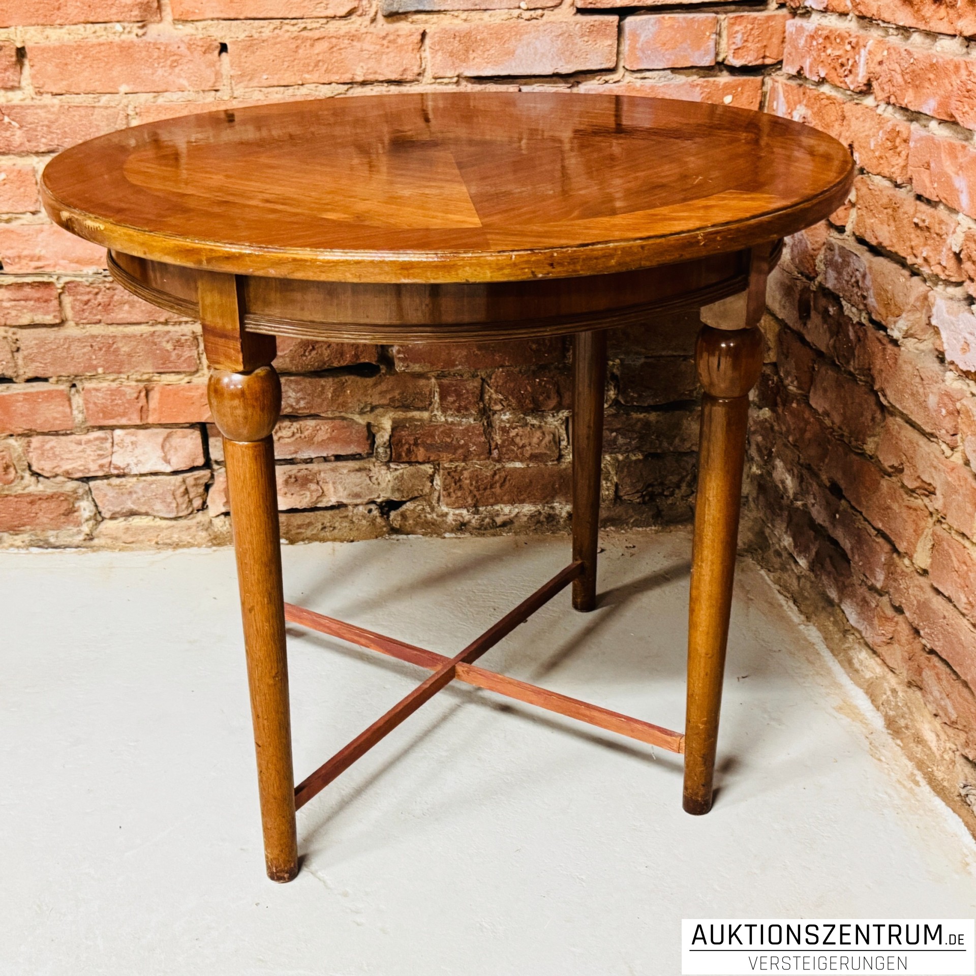 Ausführung: runde Tischplatte, vier Beine mit Kreuzverstrebung