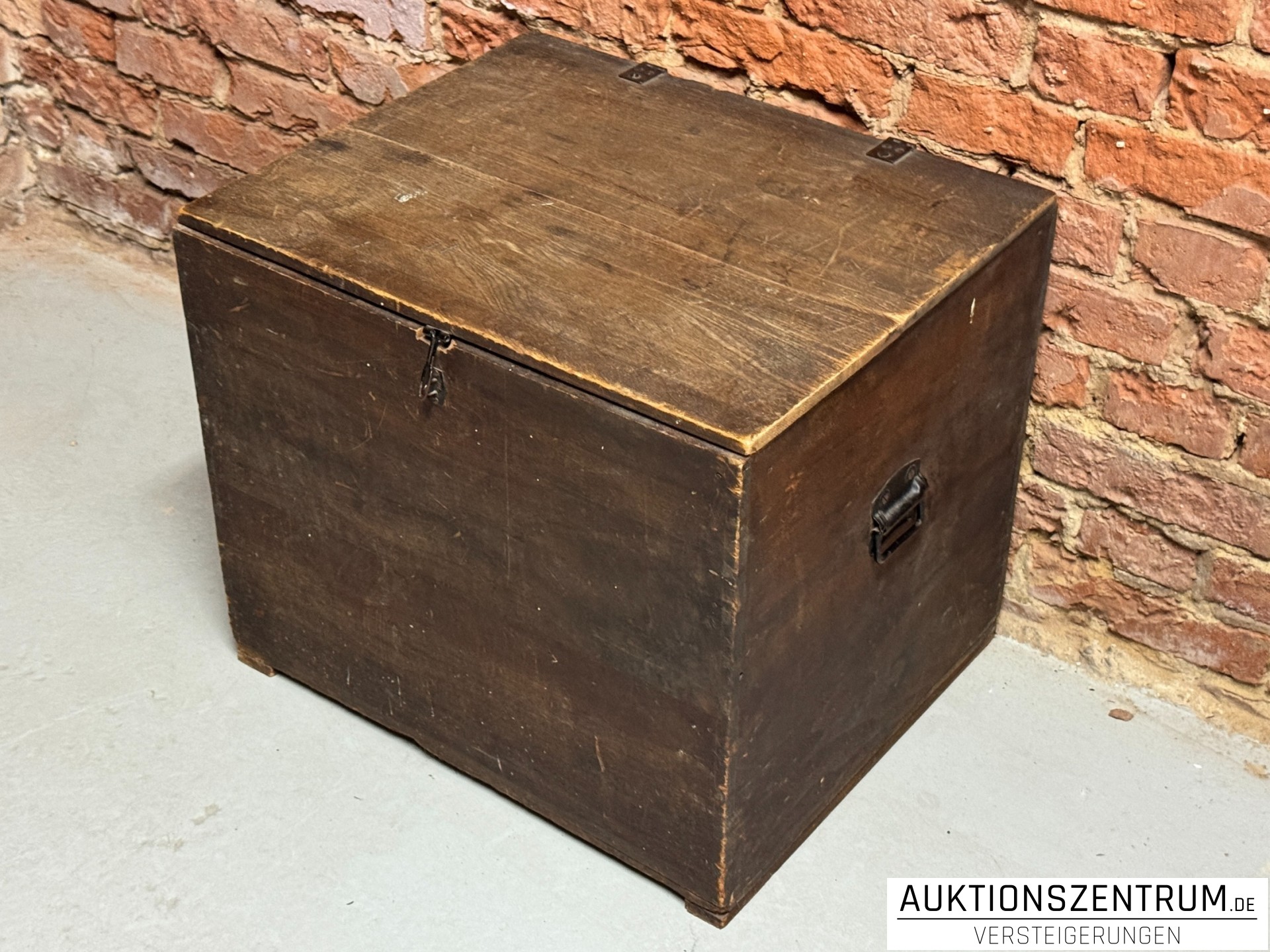 Seitlich sind zwei schwarze Metallgriffe angebracht, die den Transport erleichtern. Die Truhe steht auf kleinen Holzklötzen als Füße.