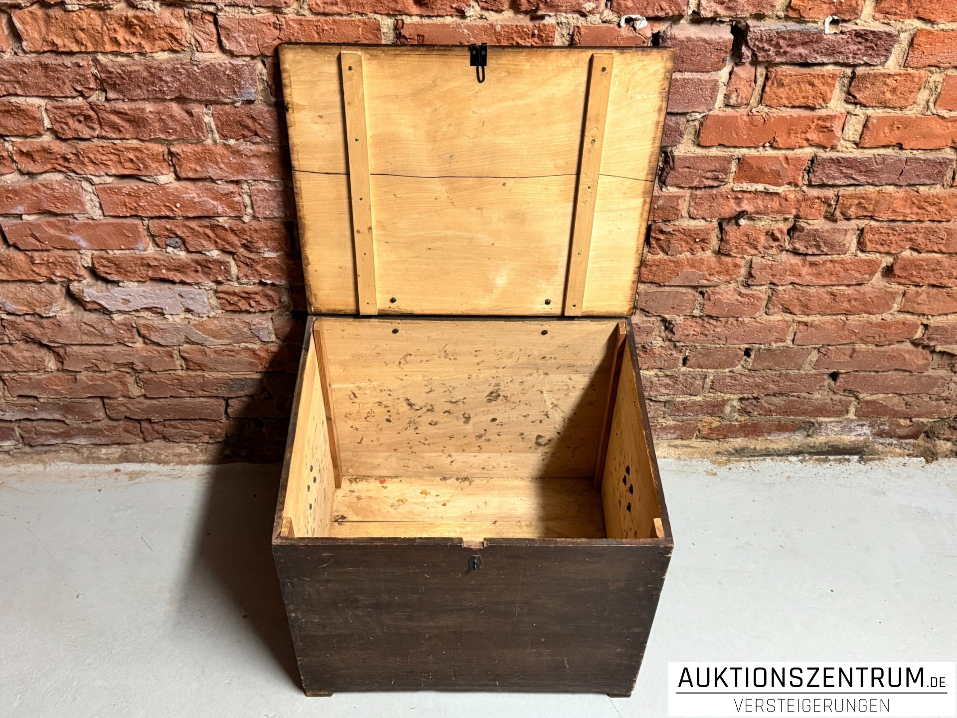 Innen zeigt die Truhe alters- und nutzungsbedingte Spuren, kleinere Flecken und Abrieb, außen Kratzer, Kantenbestoßungen und Gebrauchsspuren der Oberfläche