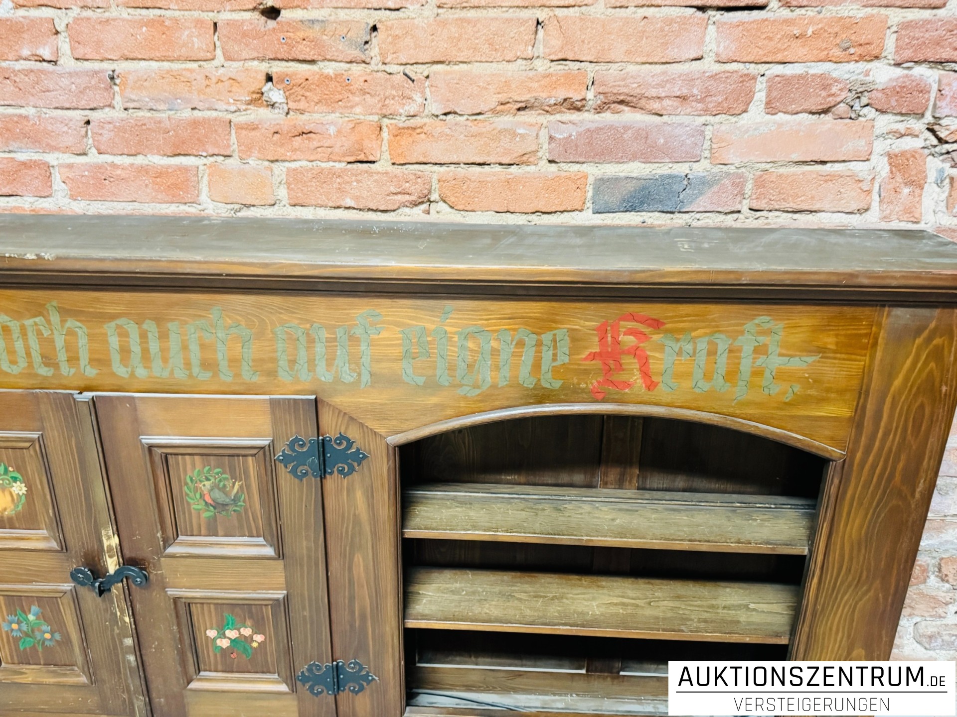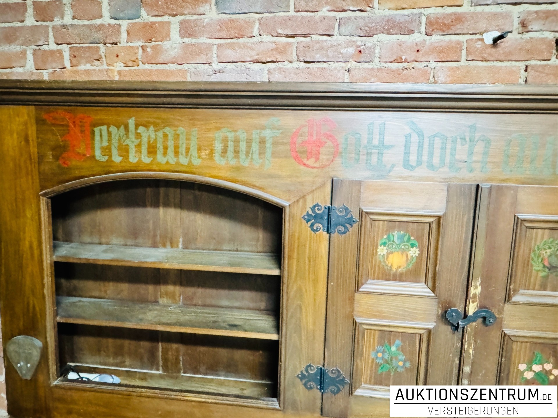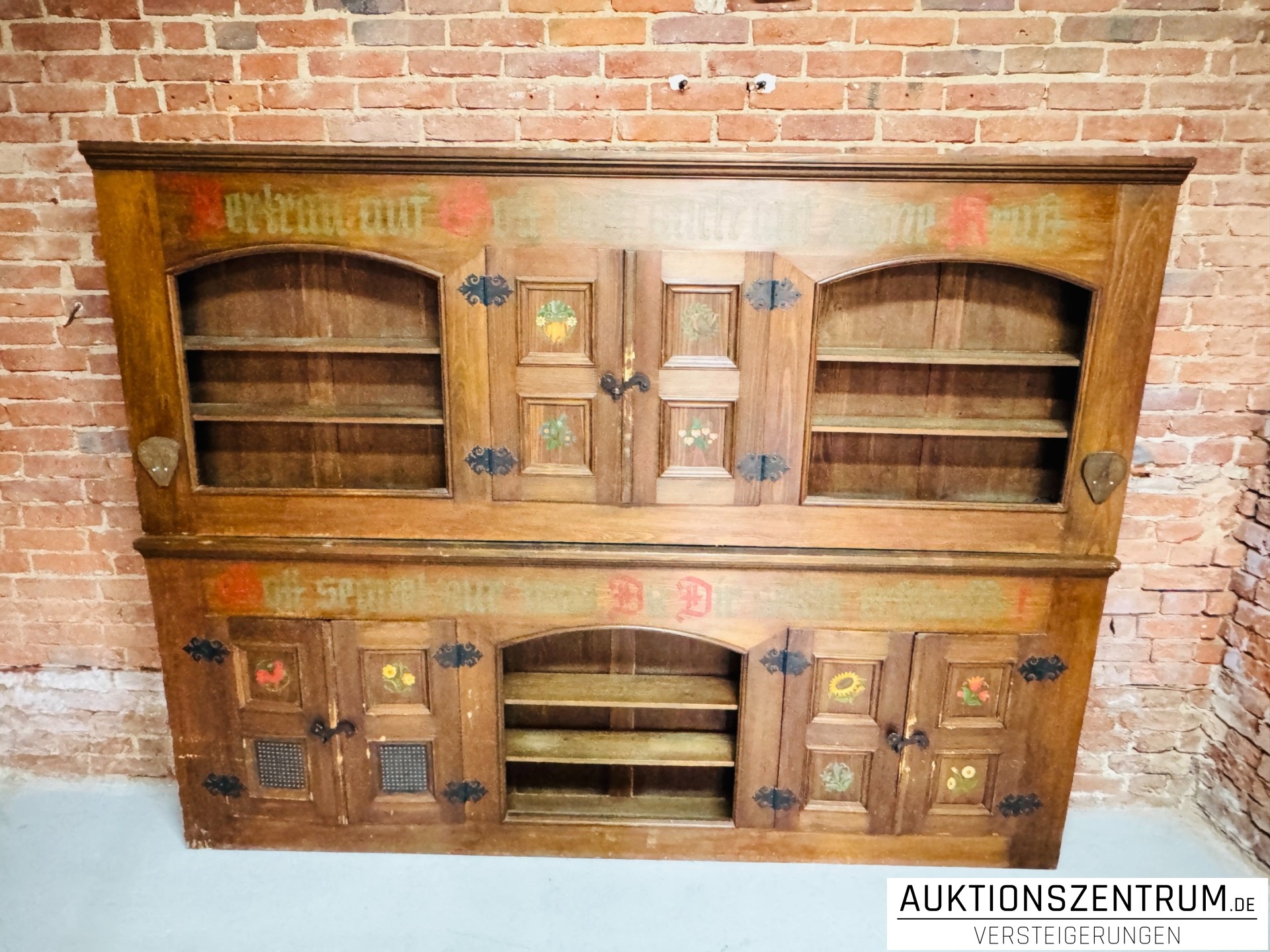 Die Fronten sind mit handbemalten floralen Motiven sowie Sprüchen in Frakturschrift verziert: