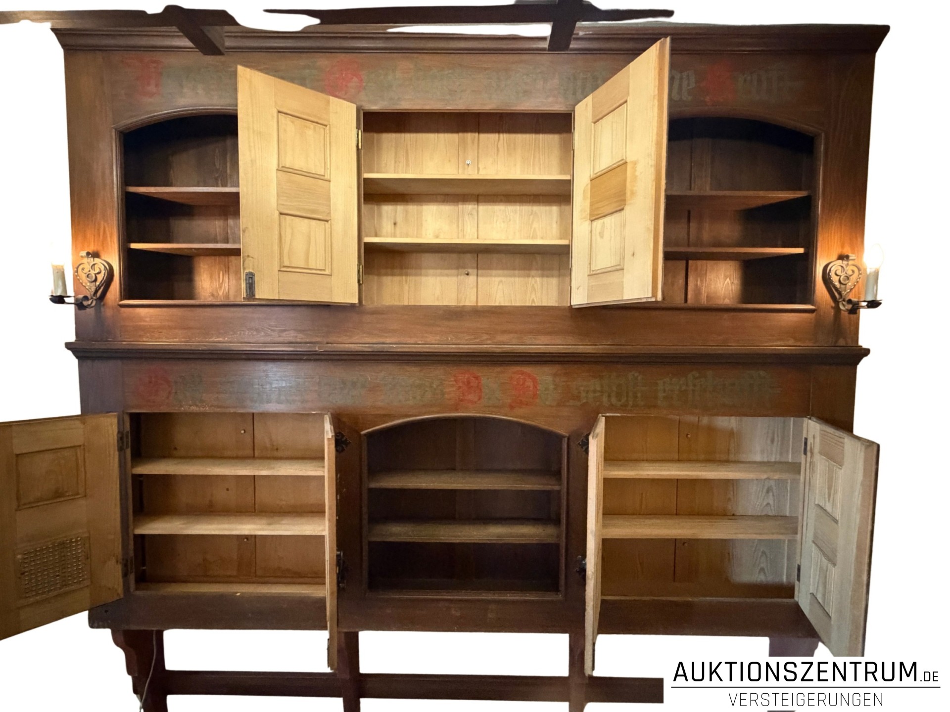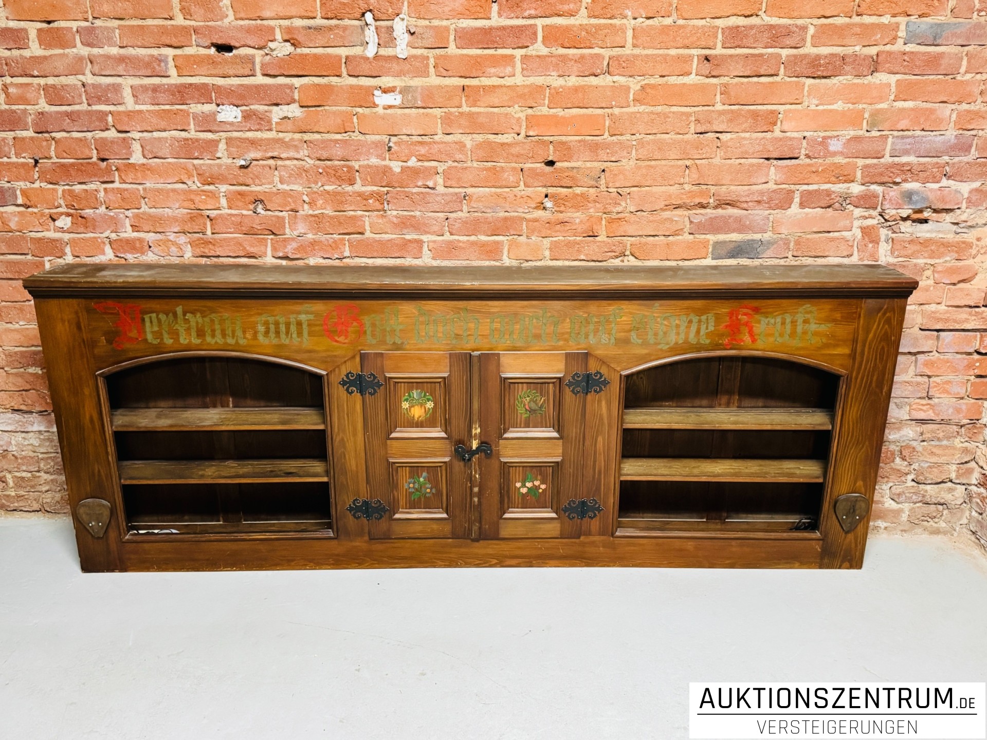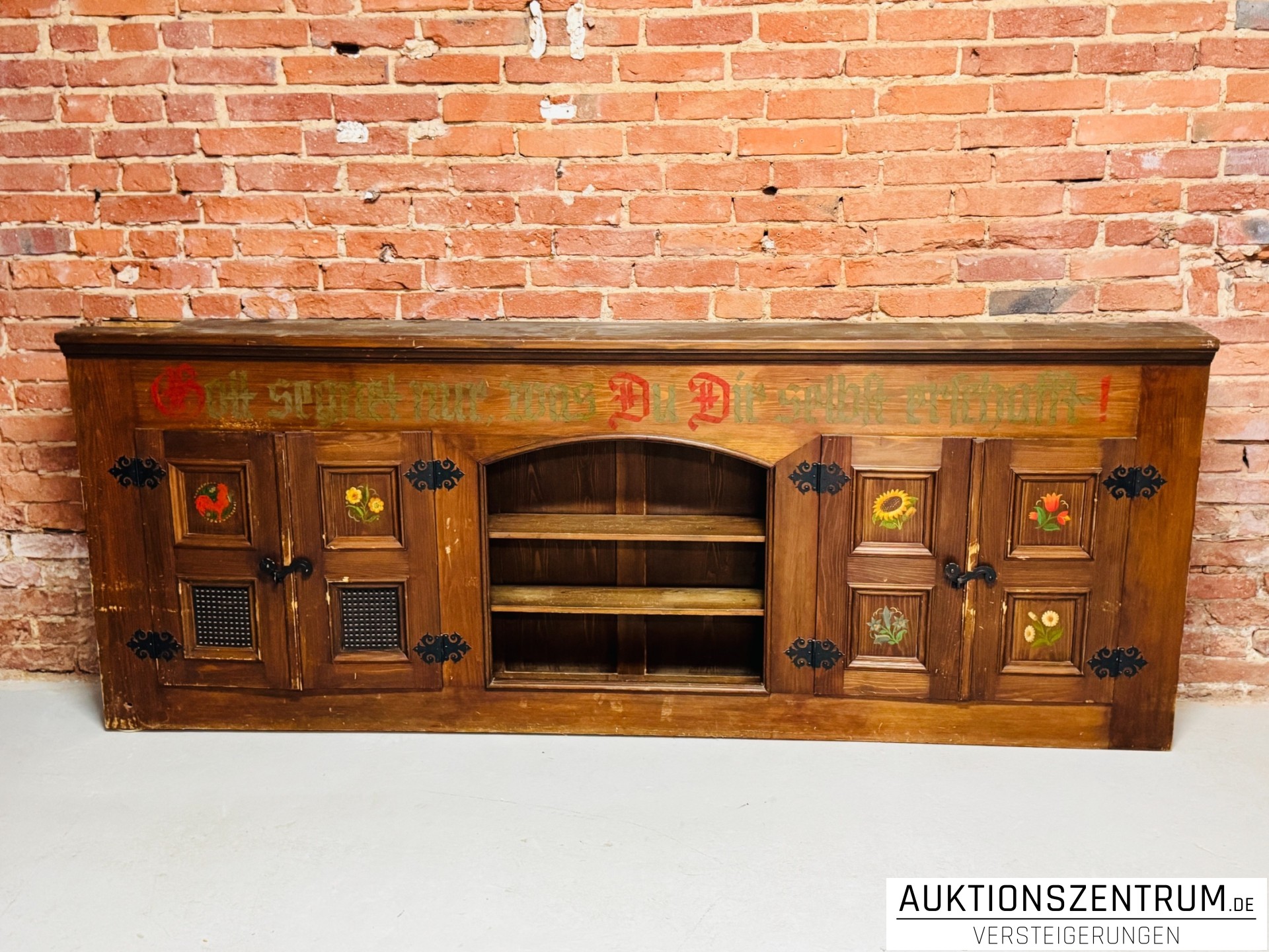 Die Fronten sind mit handbemalten floralen Motiven sowie Sprüchen in Frakturschrift verziert: