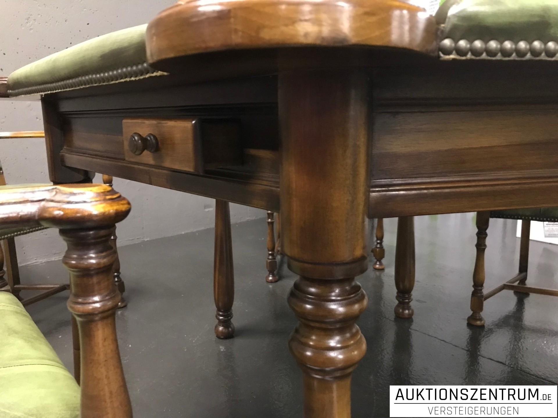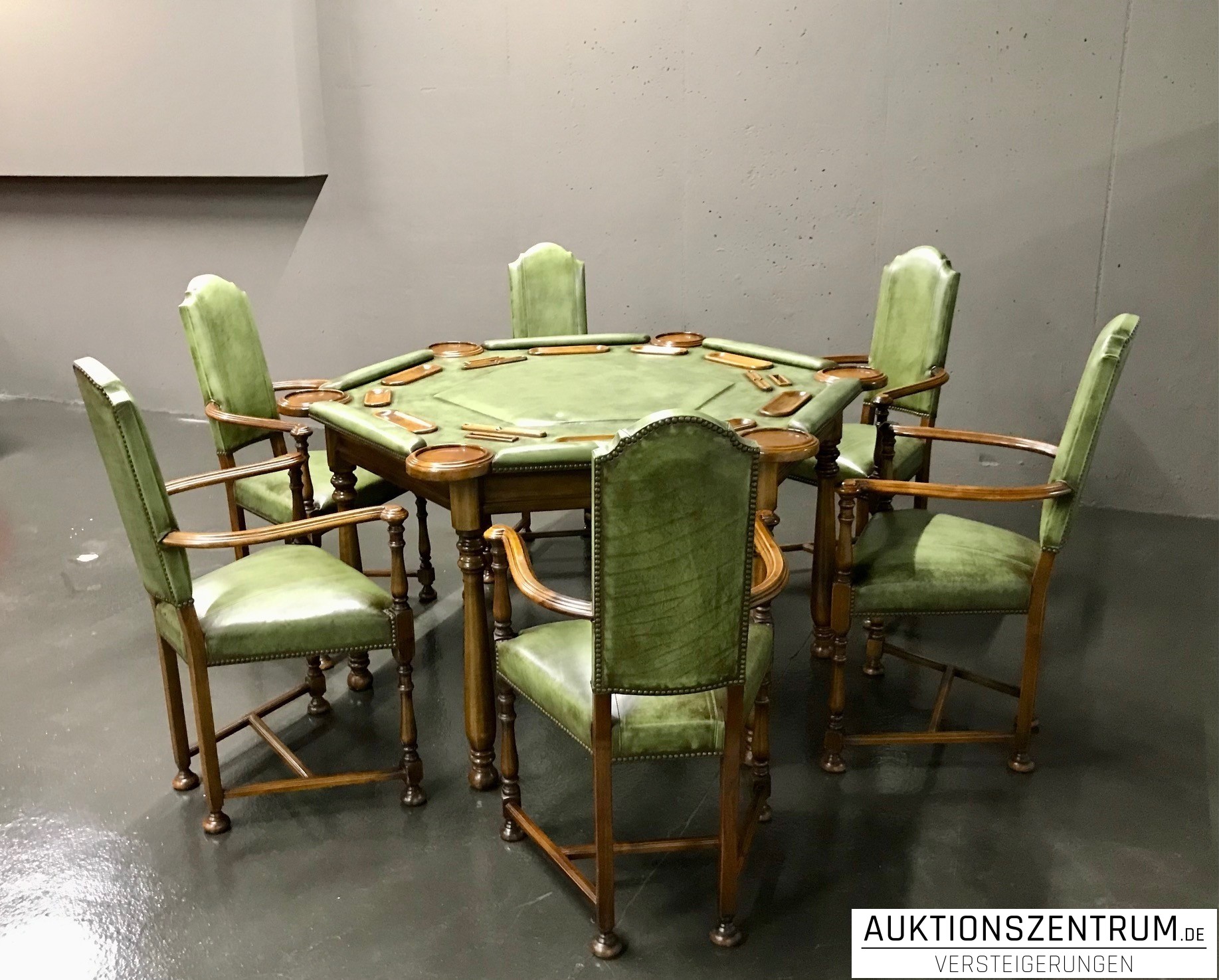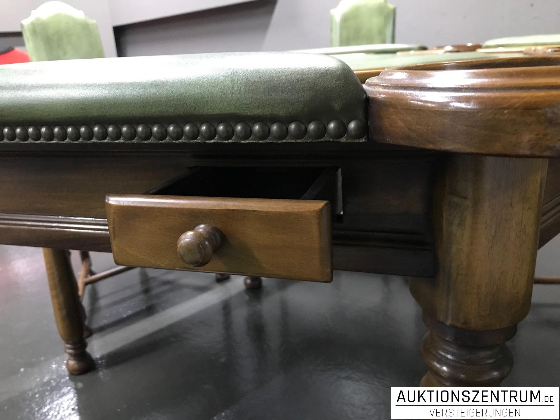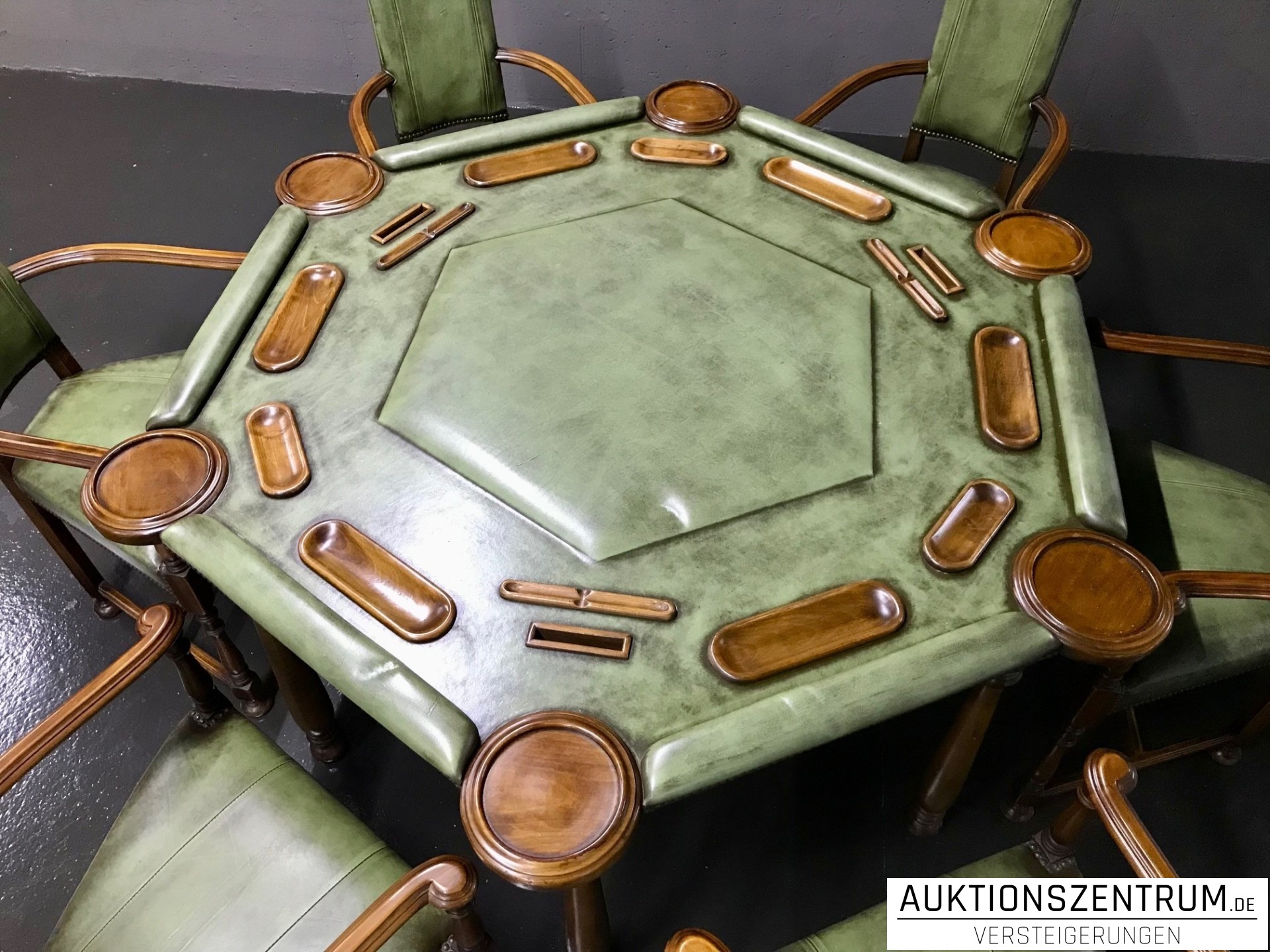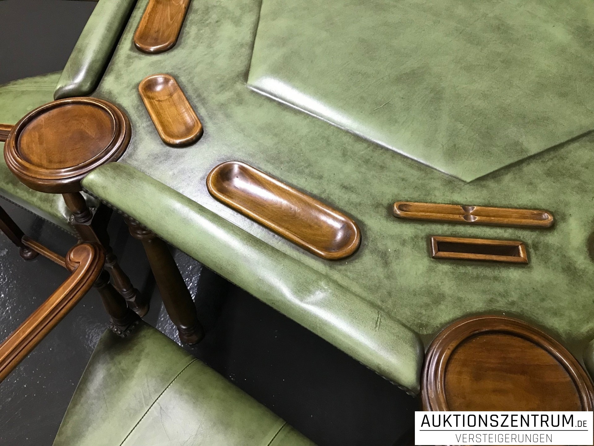 Dieser Valenti Spieltisch Montecarlo für 6 Personen hat eine grüne Belederung auf einem Sockel aus Walnussholz.