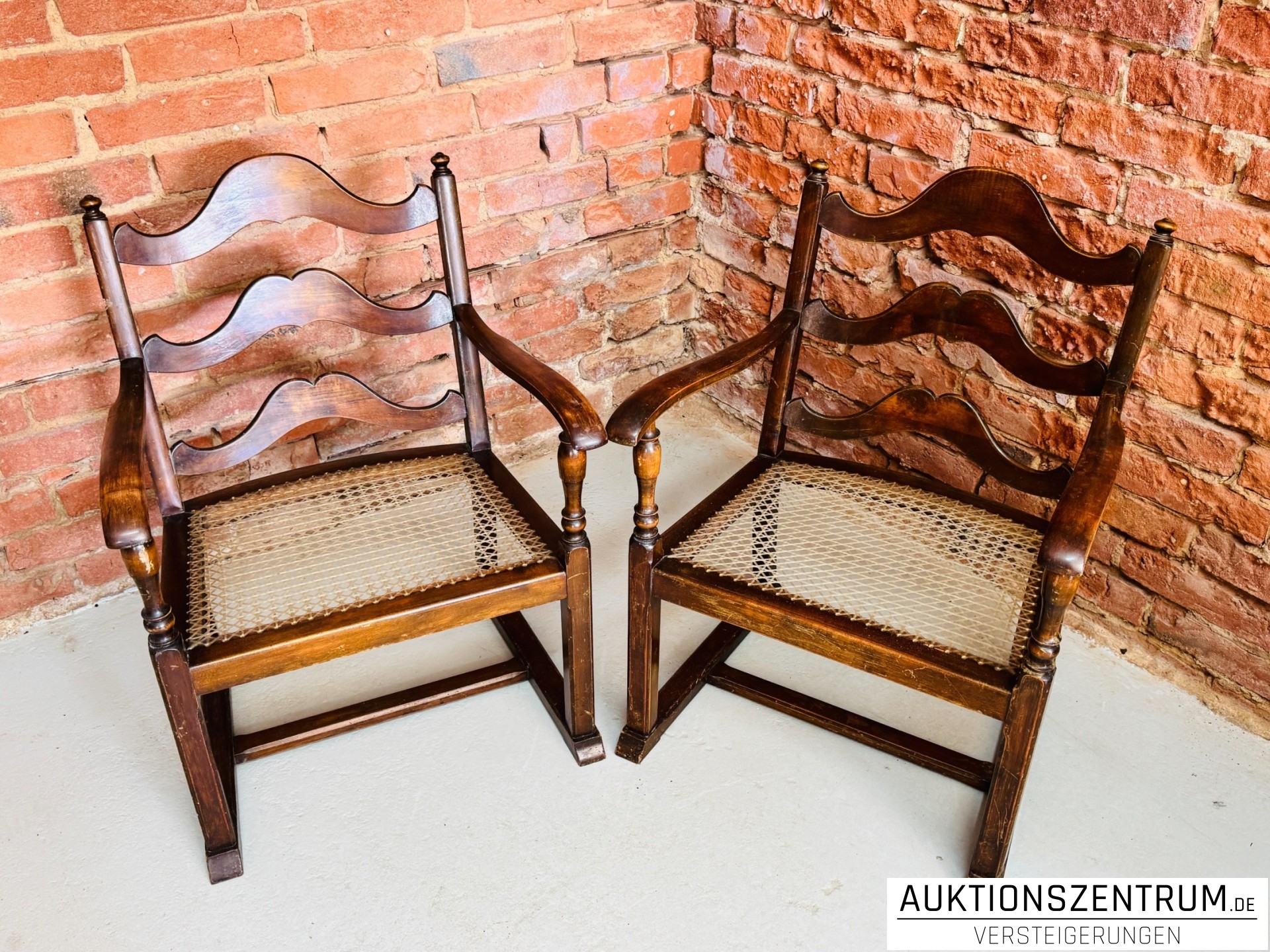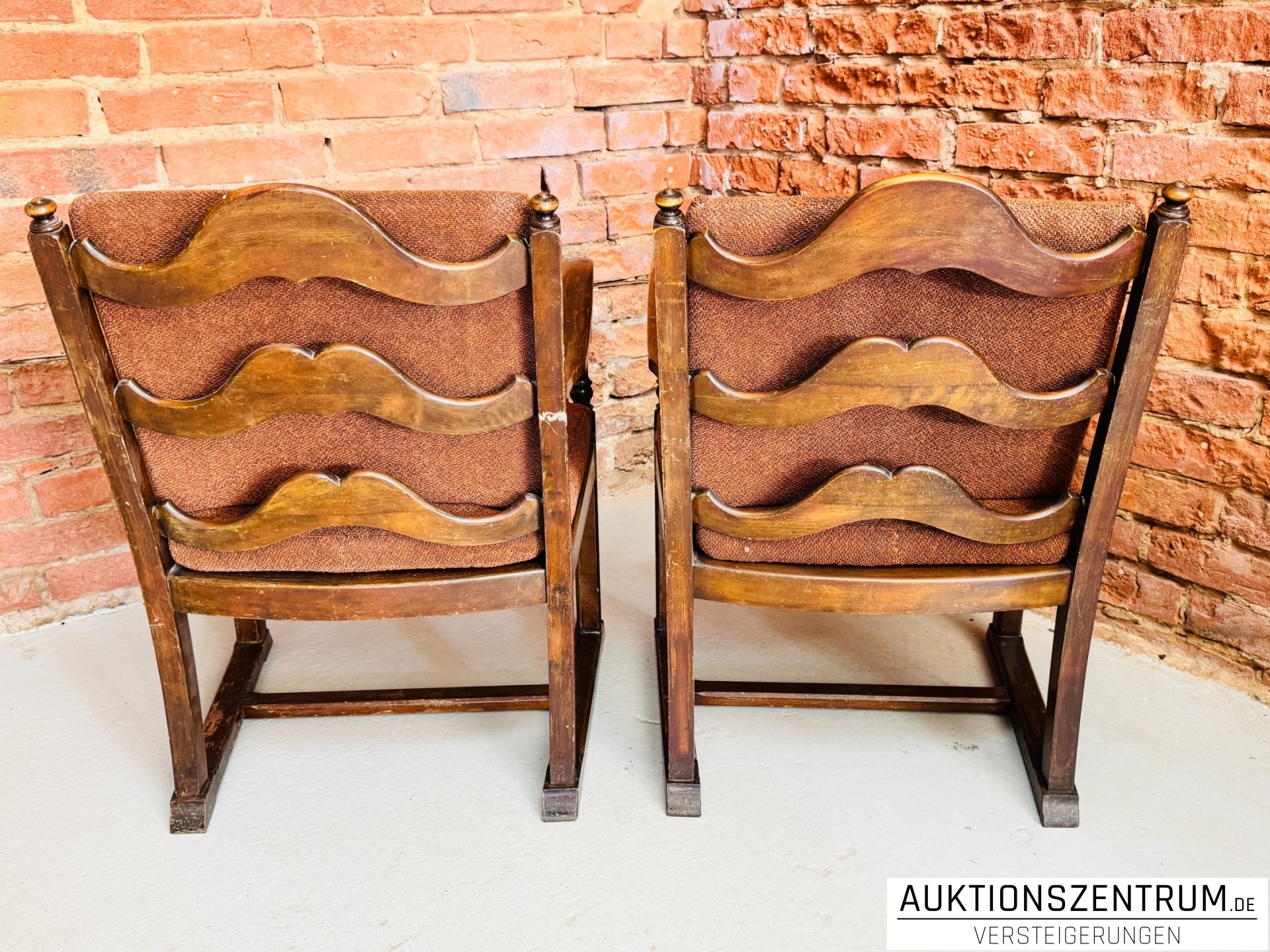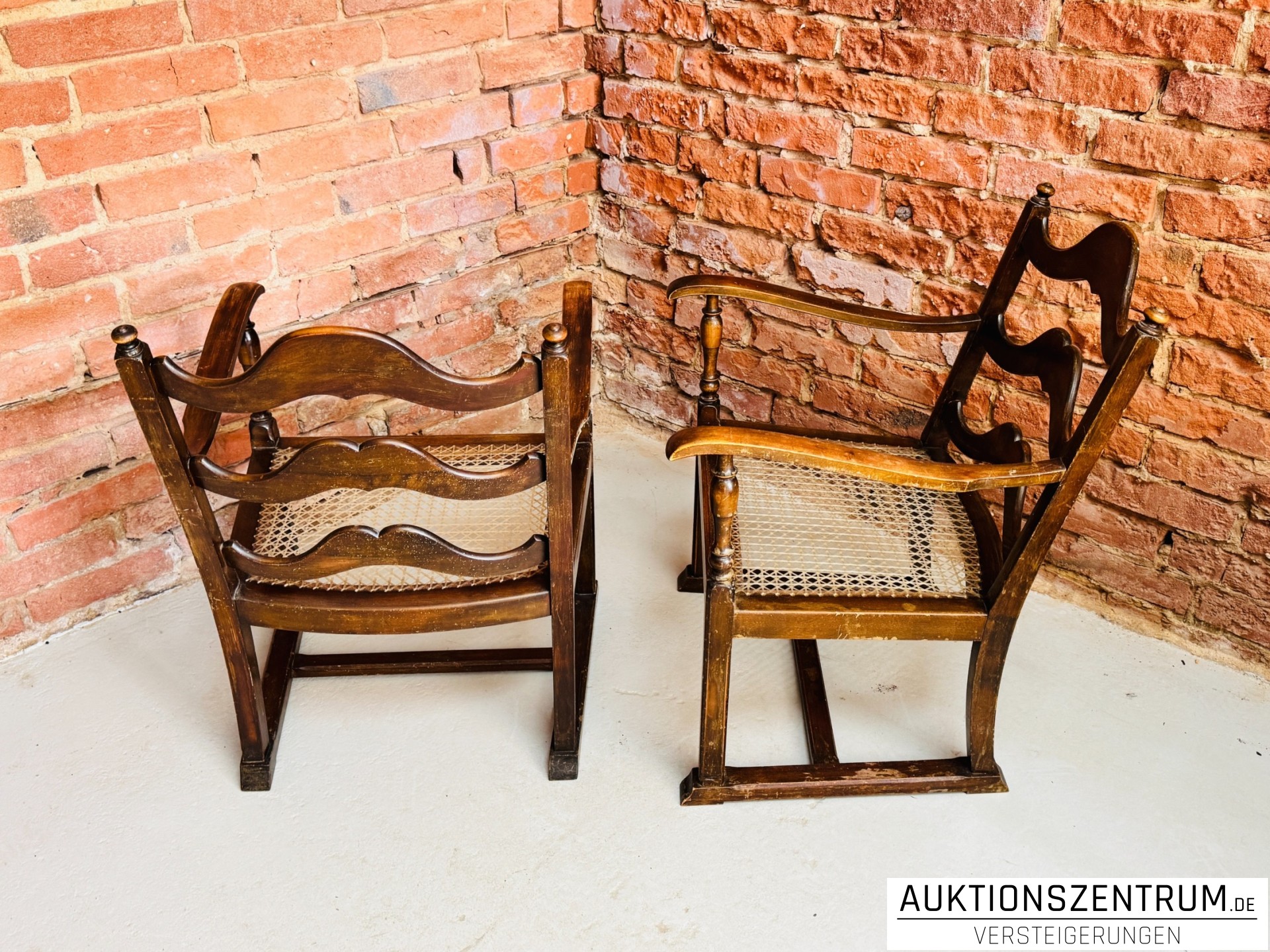 Die Stühle verfügen über geschwungene Armlehnen, gedrechselte Vorderbeine und dreifach geschweifte Rückenlehnen.