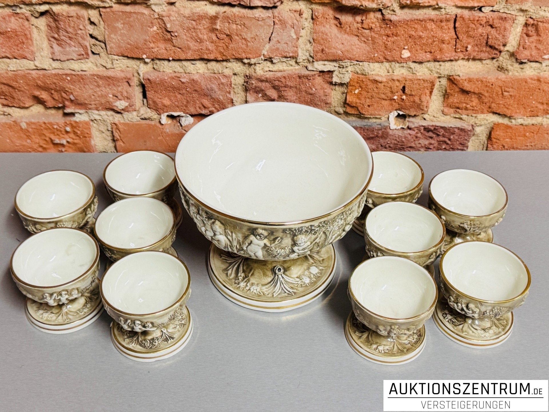 11 tlg. Vintage Prunk-Bowle-Service m. Putten, R. Capodimonte Italy MAS Keramik, Relief Porzellan Schalen