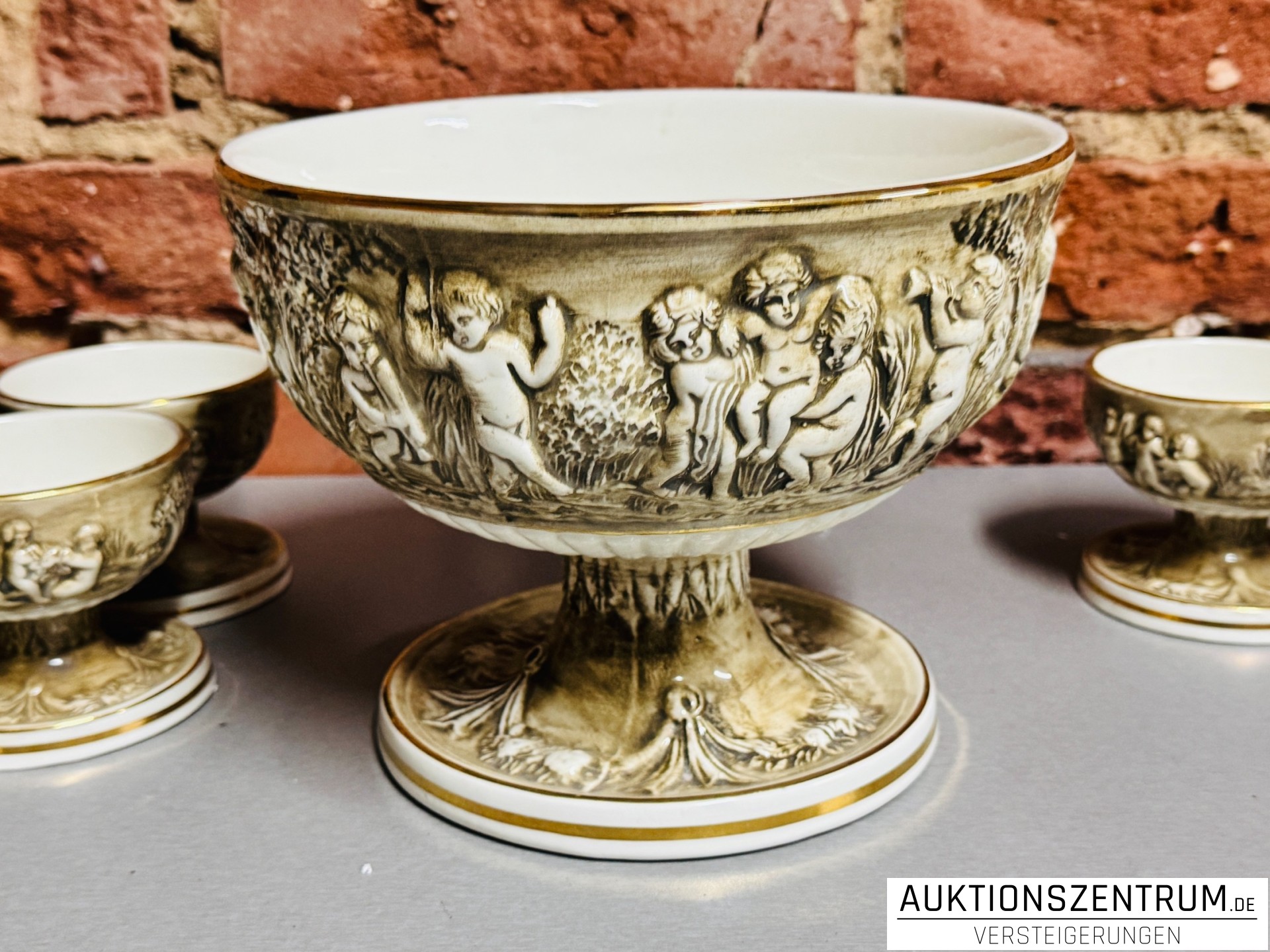 Die Außenseiten von Schale und Tassen sind umlaufend mit fein ausgearbeiteten Putten- und Naturdarstellungen im Relief geschmückt, in warmen Beige- und Brauntönen schattiert.