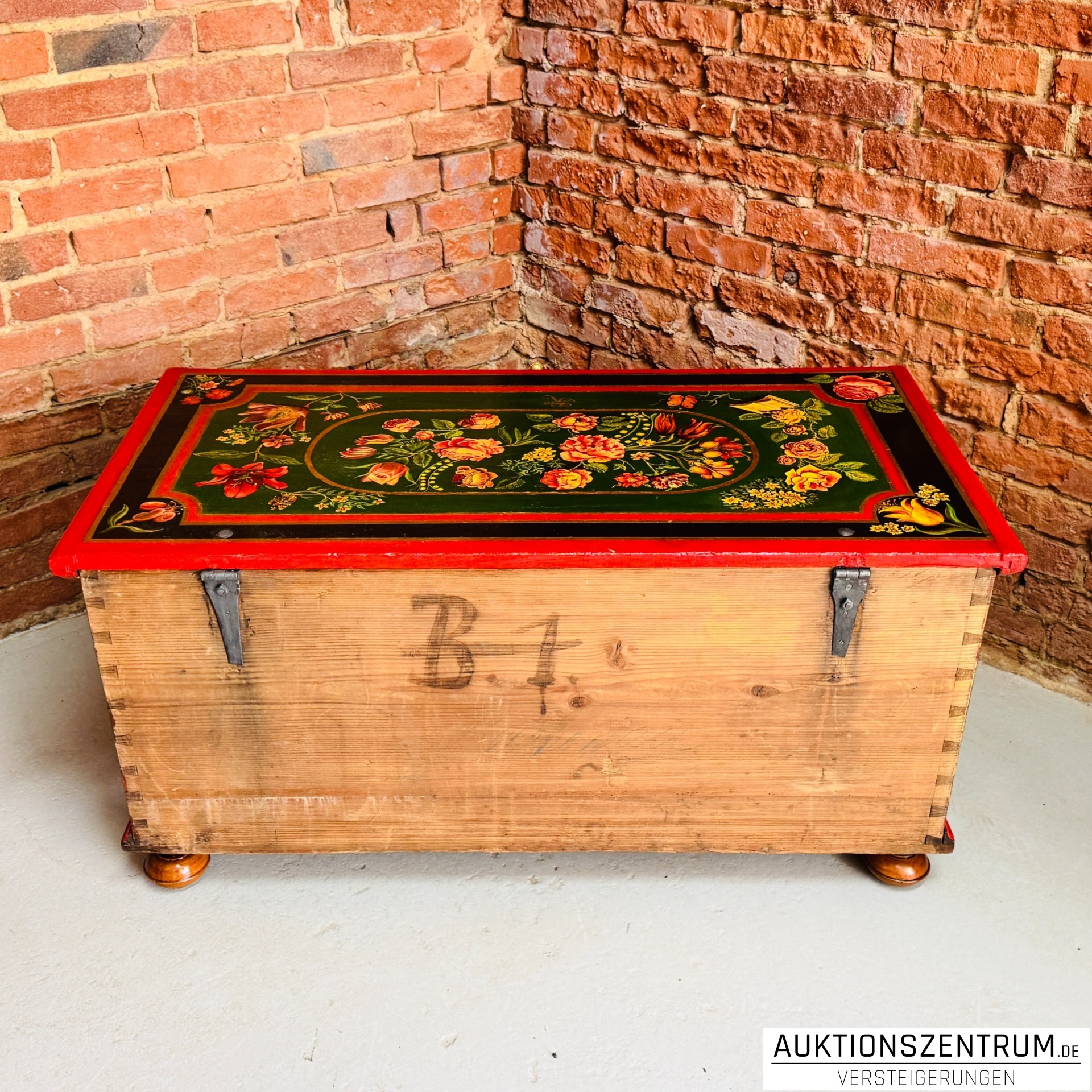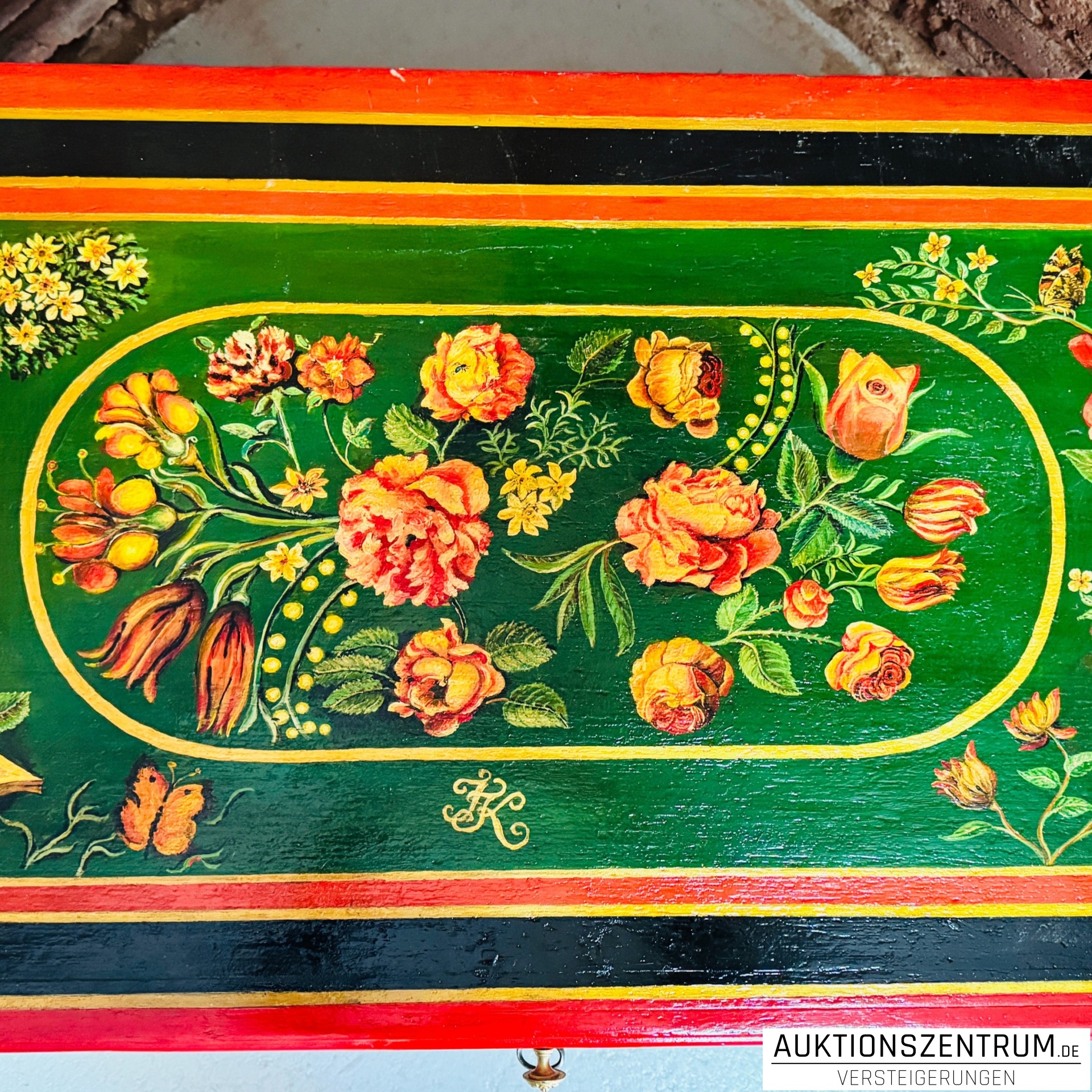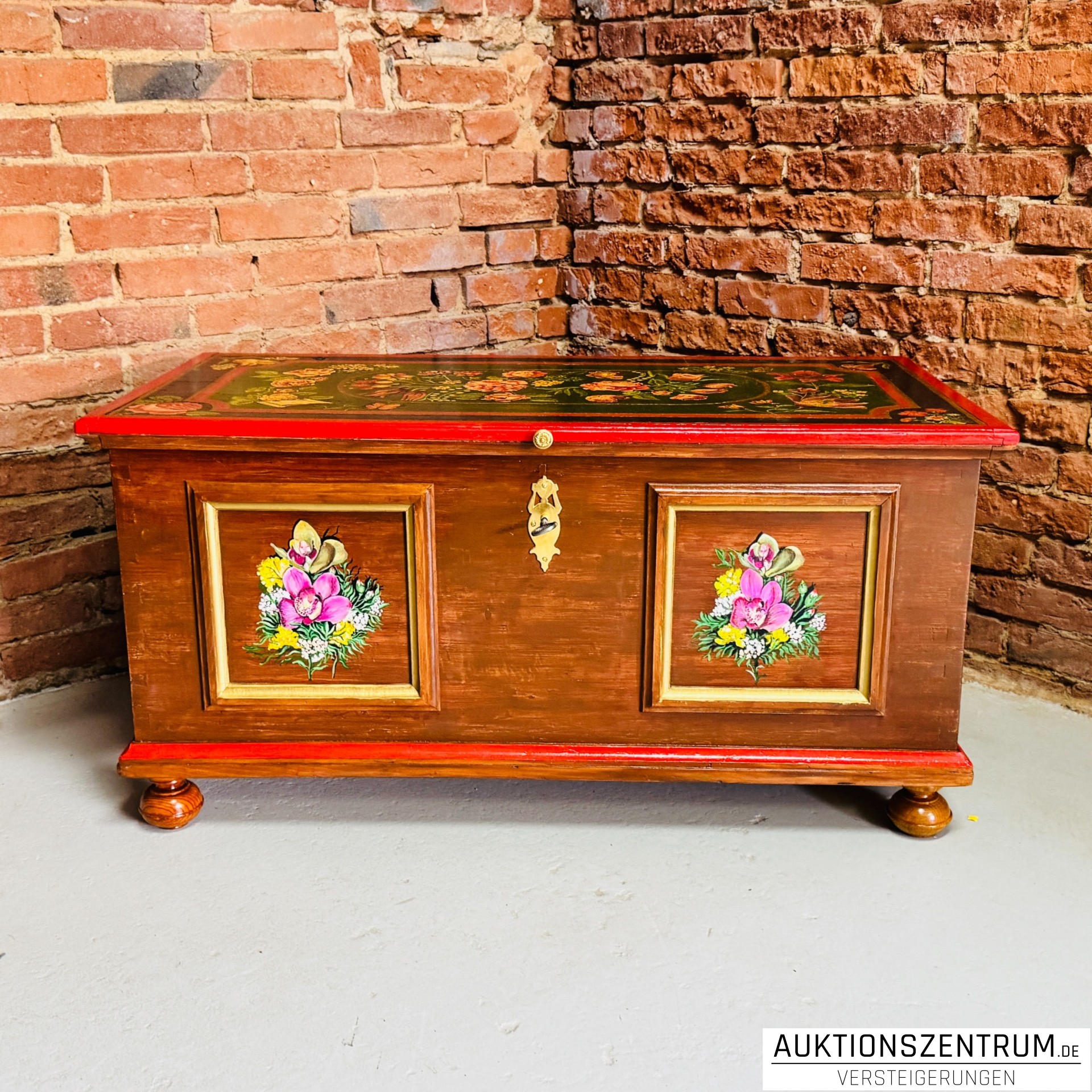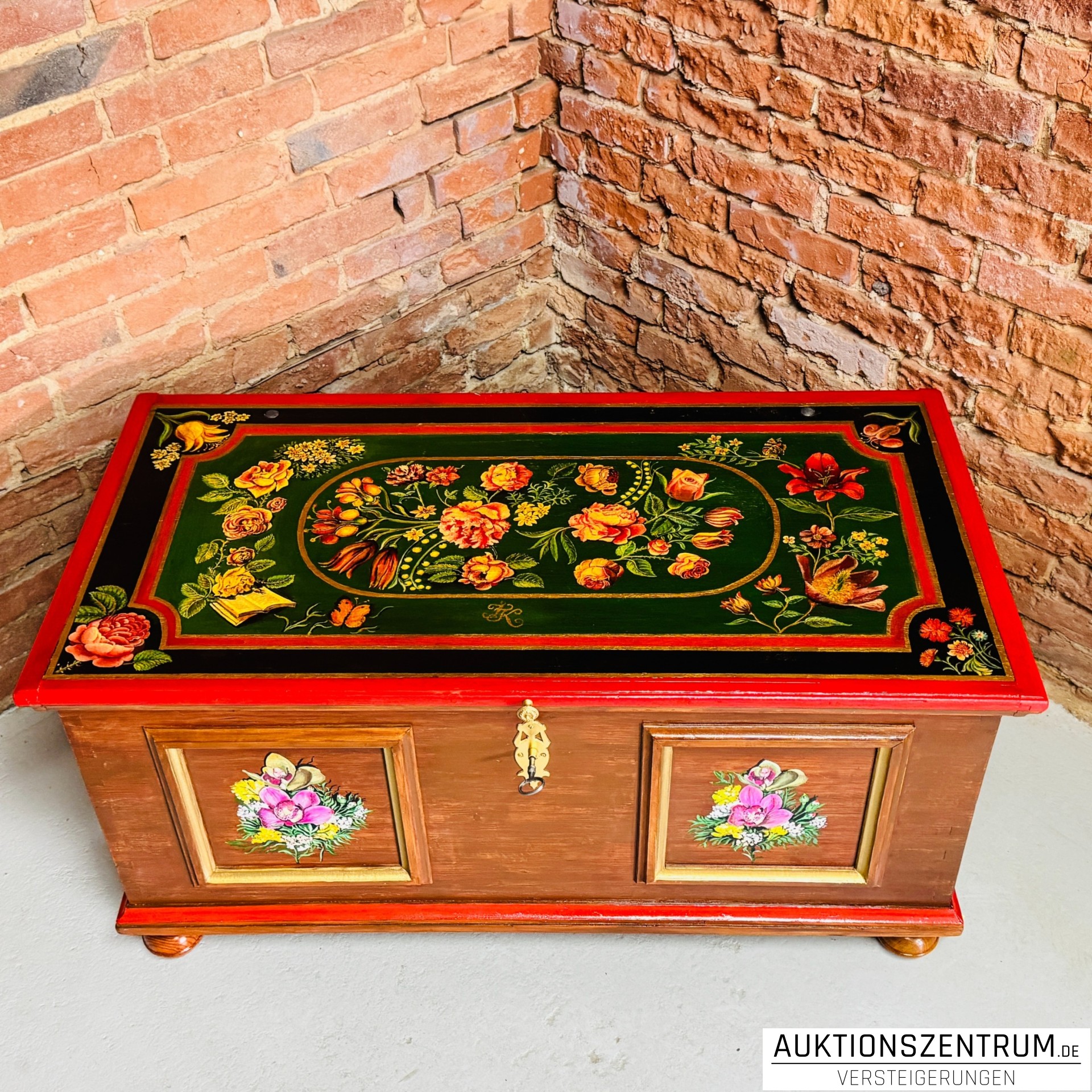 Große, handbemalte Holztruhe im Stil der traditionellen Bauernmalerei.