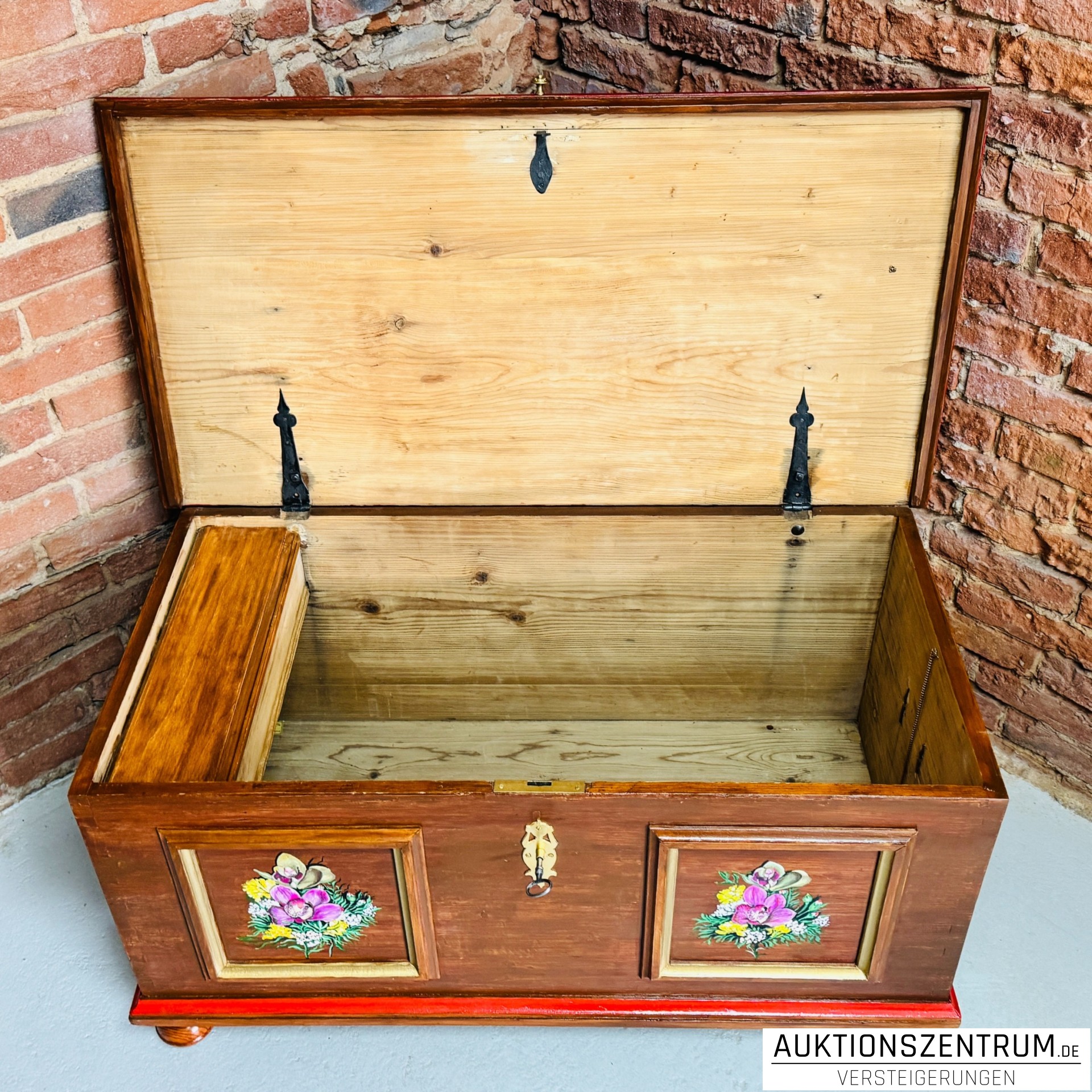 Lot 106 - Alte Holztruhe / Bauerntruhe mit Blumen bemalt 122*60*62