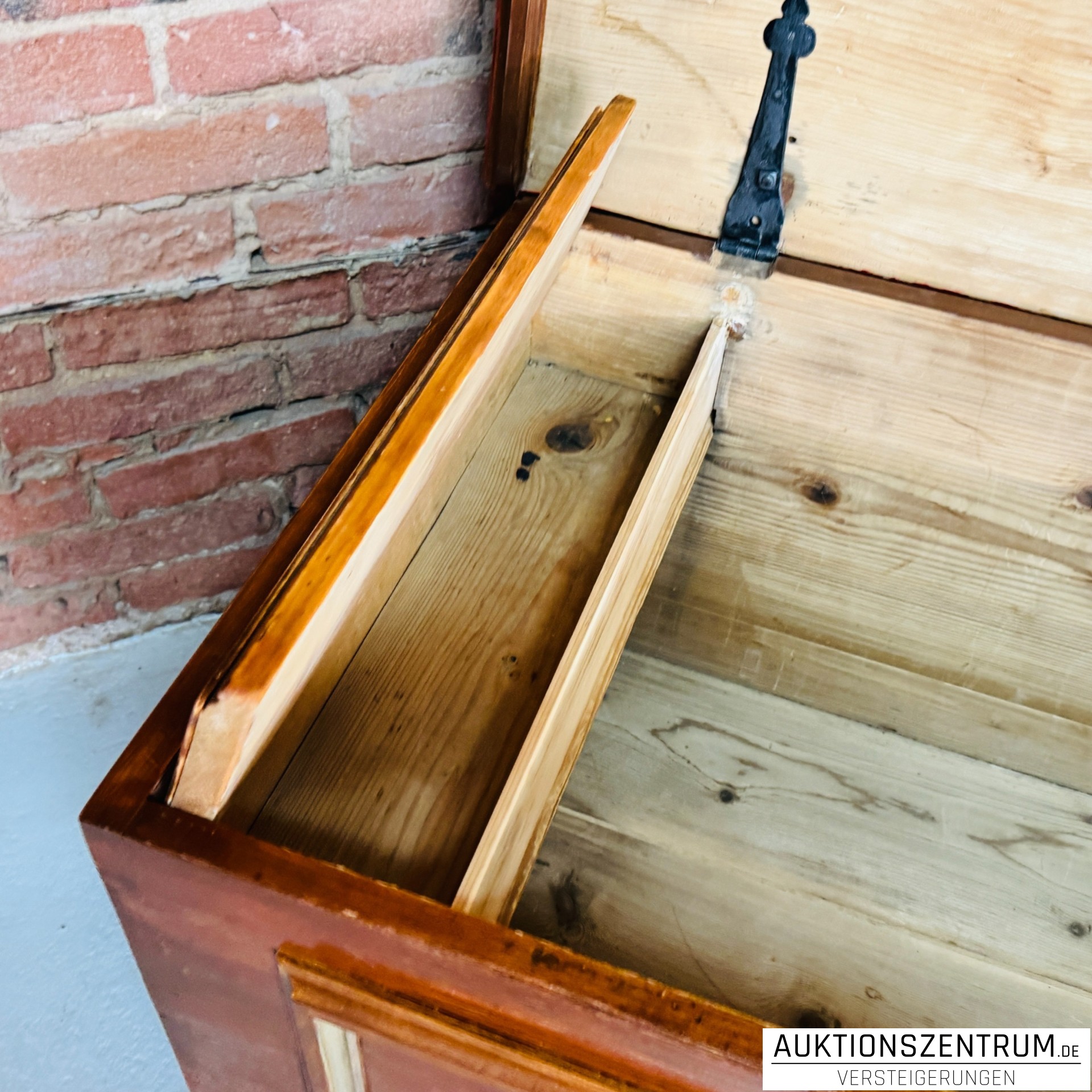 Die Truhe ist insgesamt in gutem, wohnfertigem Zustand mit alters- und gebrauchsbedingten Spuren.
