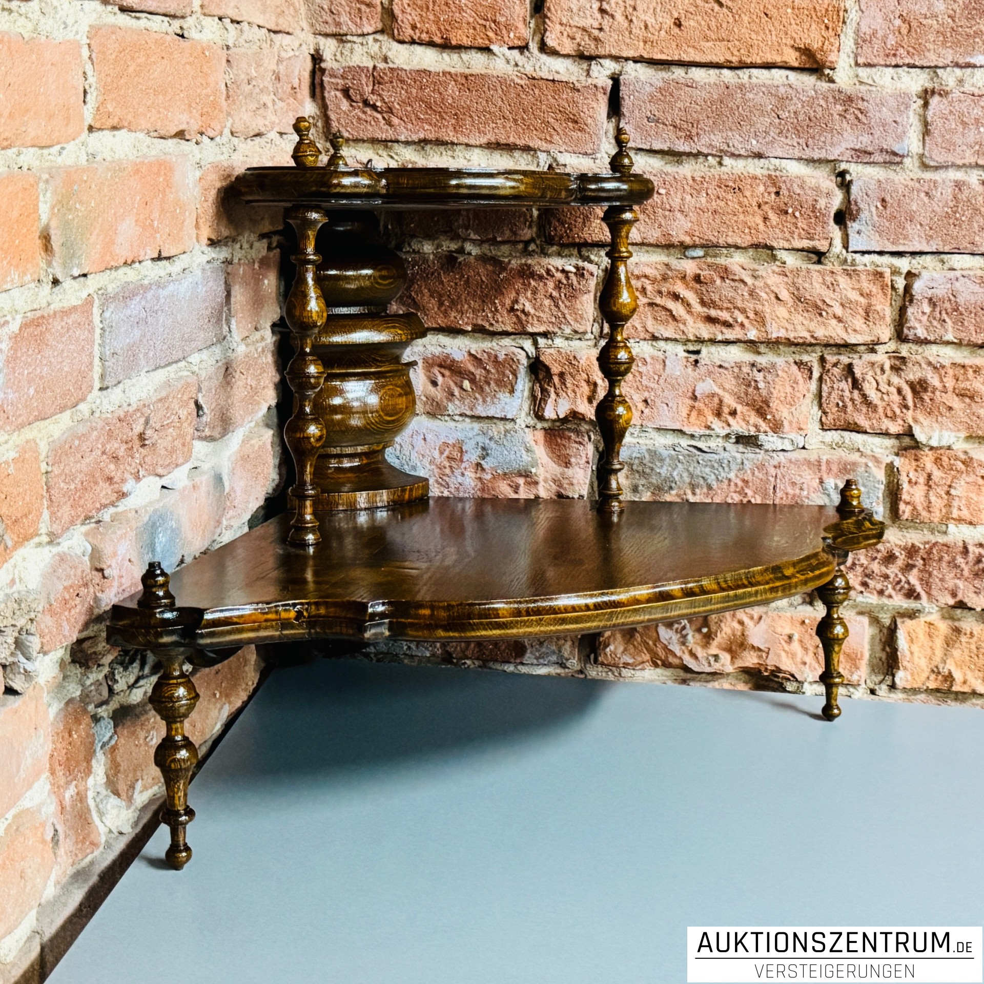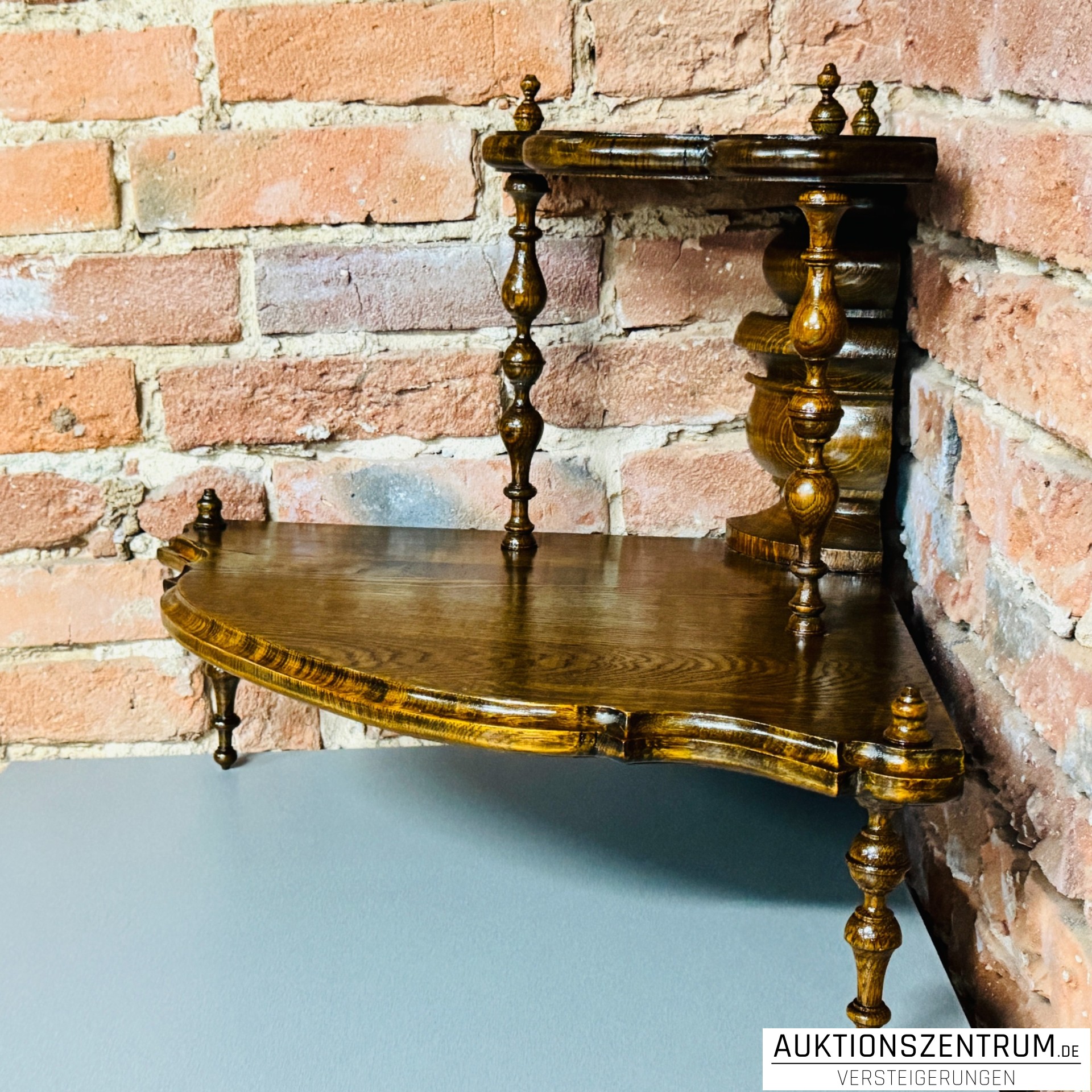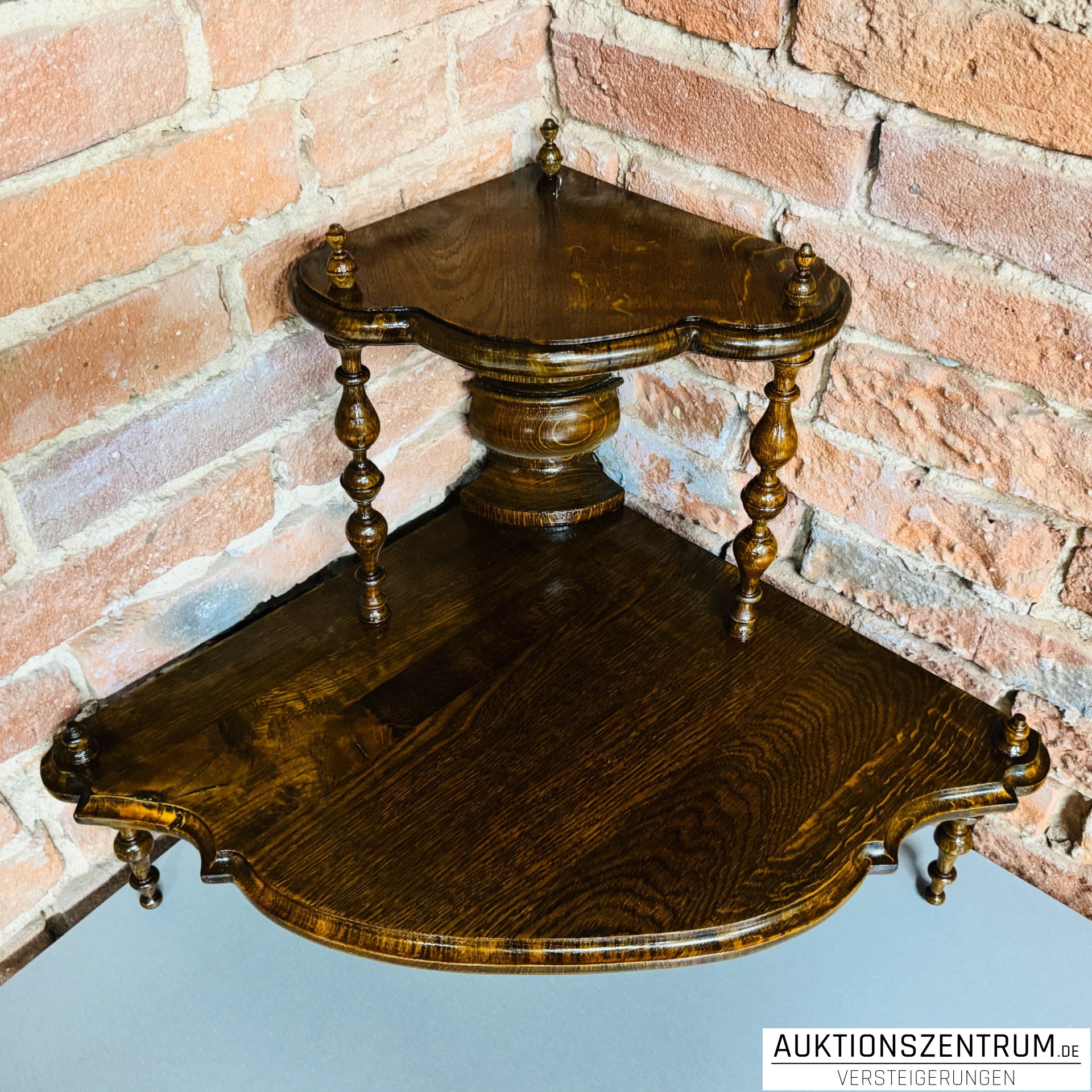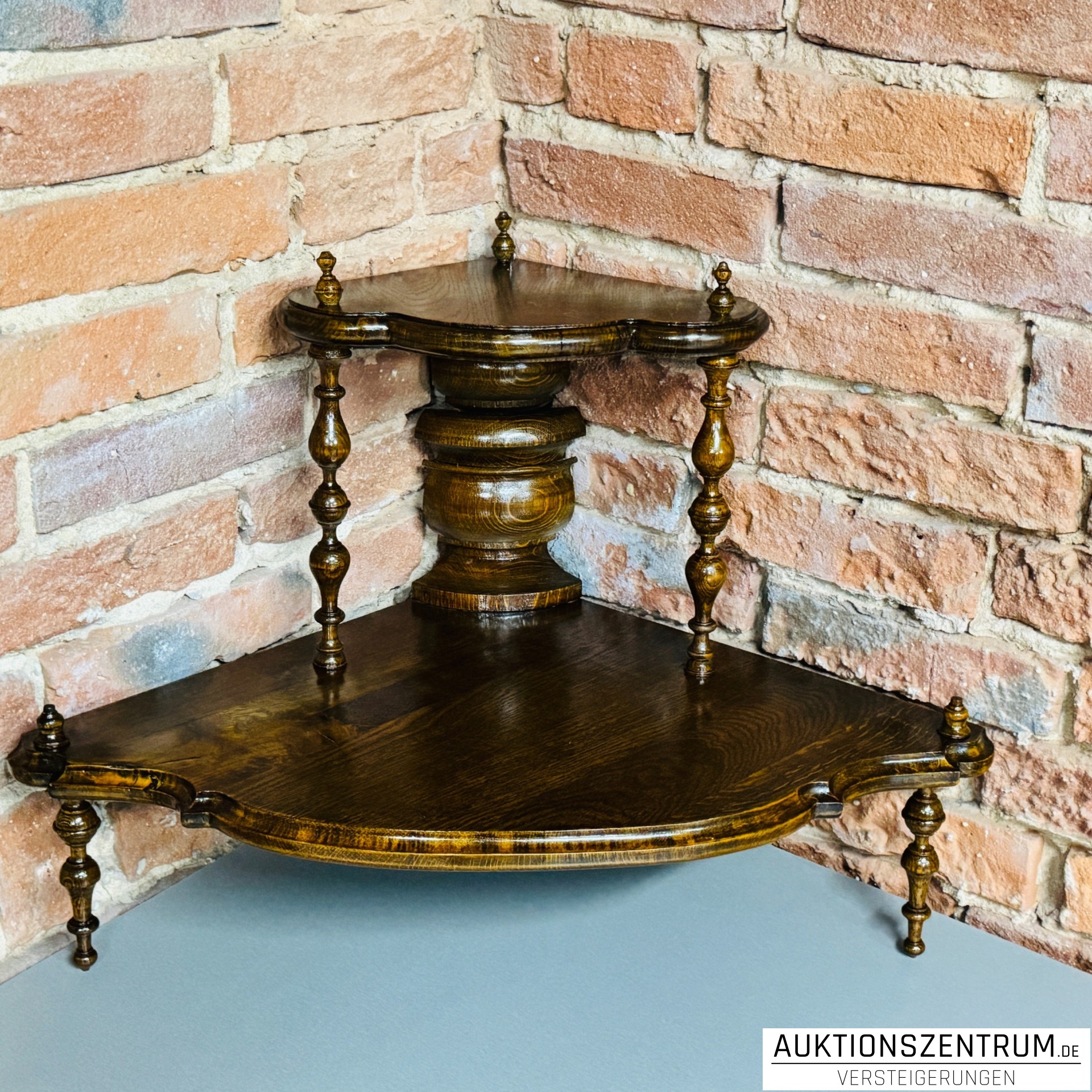 Ausführung: freistehendes Eckregal, zwei Ebenen, gedrechselte Zierelemente